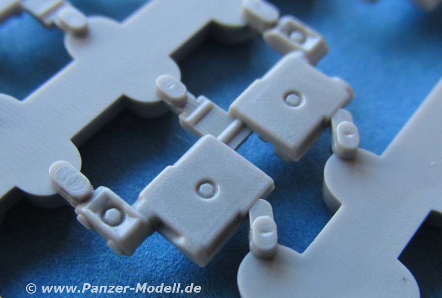 Die Ketten werden aus Einzelkettengliedern zusammengesetzt. Diese einzelnen Glieder werden geklebt und bleiben nicht beweglich. Die Details an den Gliedern sind wirklich sehr sehr gut - die versenkten Sechskantschrauben innen, die Endverbinder und die Gummiblöcke in gut gestalteten Metallhalterungen auf der Aussenseite. DIe Führungszähne sind offen und müssen einzeln auf jedes Glied geklebt. Insgesamt optisch ein echtes Highlight.