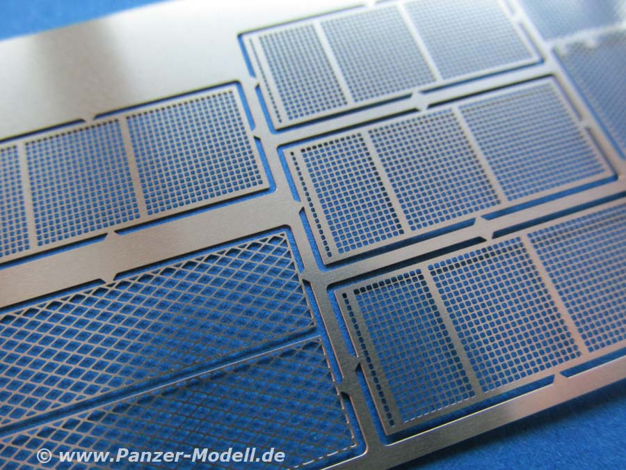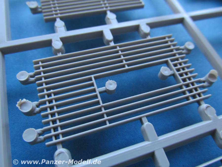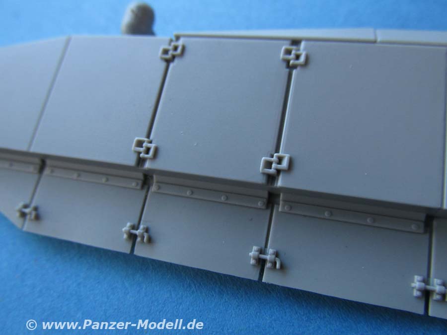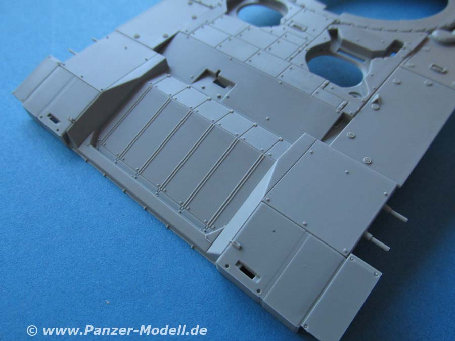 Die seitliche Schürzenpanzerung besteht aus jeweils einem großen Teil. Dieses ist sauber und verzugsfrei und den entsprechenden Details. Die zusätzliche Slatarmour Elemente an den hinteren Seiten sind als schöne Plastikteile enthalten und werden mit ein paar zusätzlichen Teilen und Halterungen versehen.