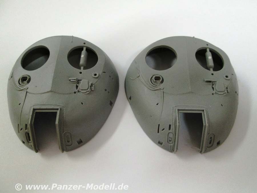 Der Bausatz besteht aus 17 Spritzrahmen aus hellgrauem Plastik, einem Rahmen mit Klarsichteilen, dem Wannenunterteil, einer Platine mit Photoätzteilen, Polycaps und eine Segeltuchabdeckung für die Kanonenblende aus Vinyl, zwei Drahtseilen, einem kleinen Decalsheet, Einzelkettengliedern und dem Turmoberteil (in meinem Musterbausatz waren zwei gleiche Turmteile vorhanden, warum auch immer… vielleicht einfach nur ein Verpackungsfehler?) Die Bauanleitung führt in 37 Abschnitten zum Ziel. Sie ist sehr klar und übersichtlich gegliedert und lässt den Bau von zwei verschiedenen Varianten zu. Wahlweise kann der Turm mit oder ohne Fla-MG ausgestattet werden.