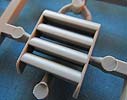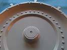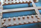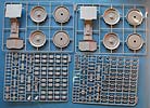 Was jetzt nur noch fehlt, sind die 4 riesigen Räder in ihrer Radaufhängung. Die Räder sind schön dargestellt mit sauberem, verzugsfreien Guss und schönen, feinen Details. Die schweren Metaillschuhe der Räder mit denen die Minen zur Detaonation gebracht werden, müssen dann einzeln (18x pro Rad) aufgeklebt werden und haben eine gute, realistische Oberfläche.