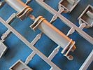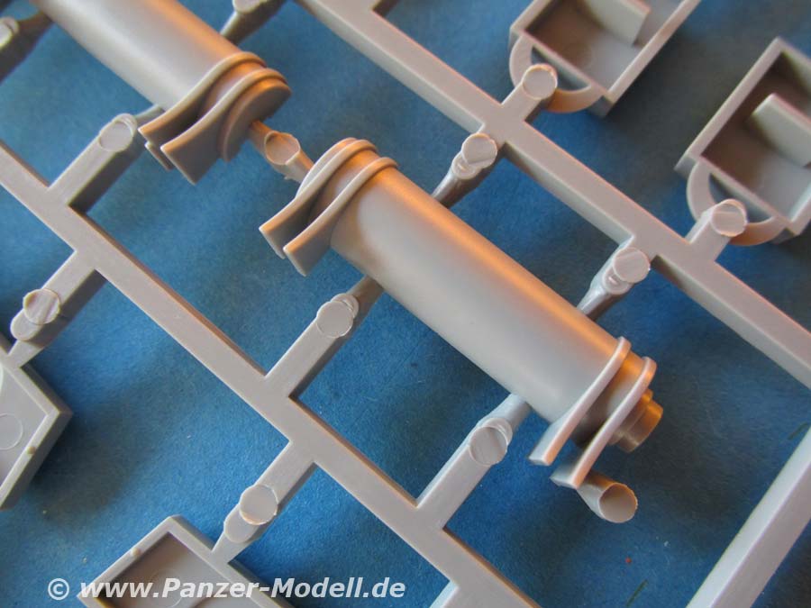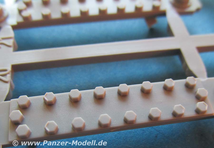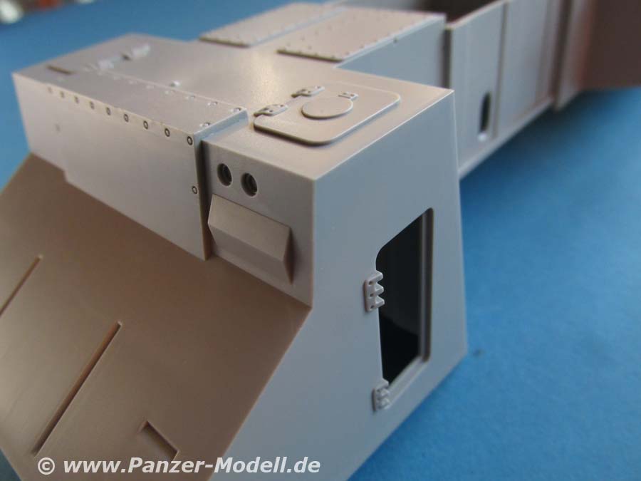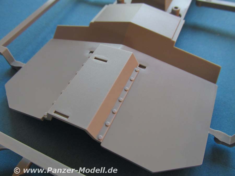 Die Rumpfteile werden weiter zum einem mit den jeweiligen Bodenplatten und weiteren Details, wie Lüfterlamellen, Zusatzpanzerung, Verschraubungen und natürlich der Hydraulikkupplung zwischen den beiden Fahrzeughälften versehen. Letztere setzt sich aus beweglichen Zylindern aus Plastik zusammen, sodass man das Fahrzeug in jeder beliebigen Stellung bauen kann.