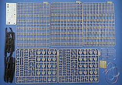 Der Karton ist gefüllt mit 9 grauen Spritzlingen, der Ober- und Unterwanne, einem klaren Spritzling, 6 Weichgummispritzlingen, einer PE Platine, ein verdrilltes Kupferkabel, Seilmaterial und ein Decalbogen.