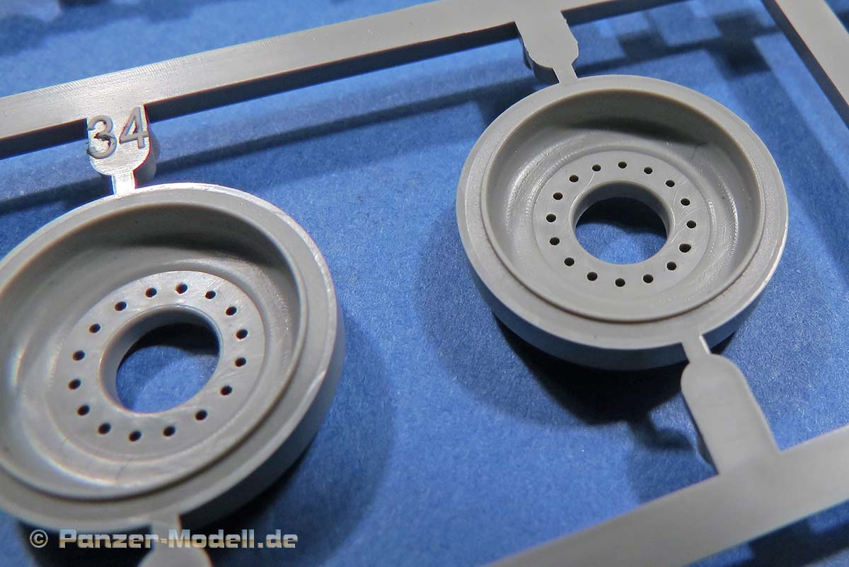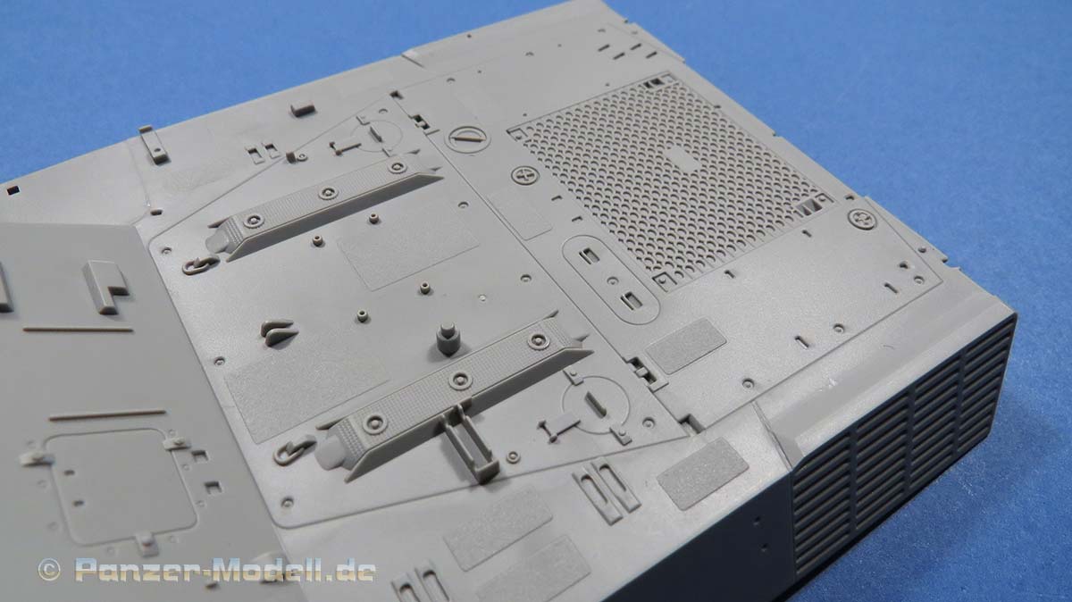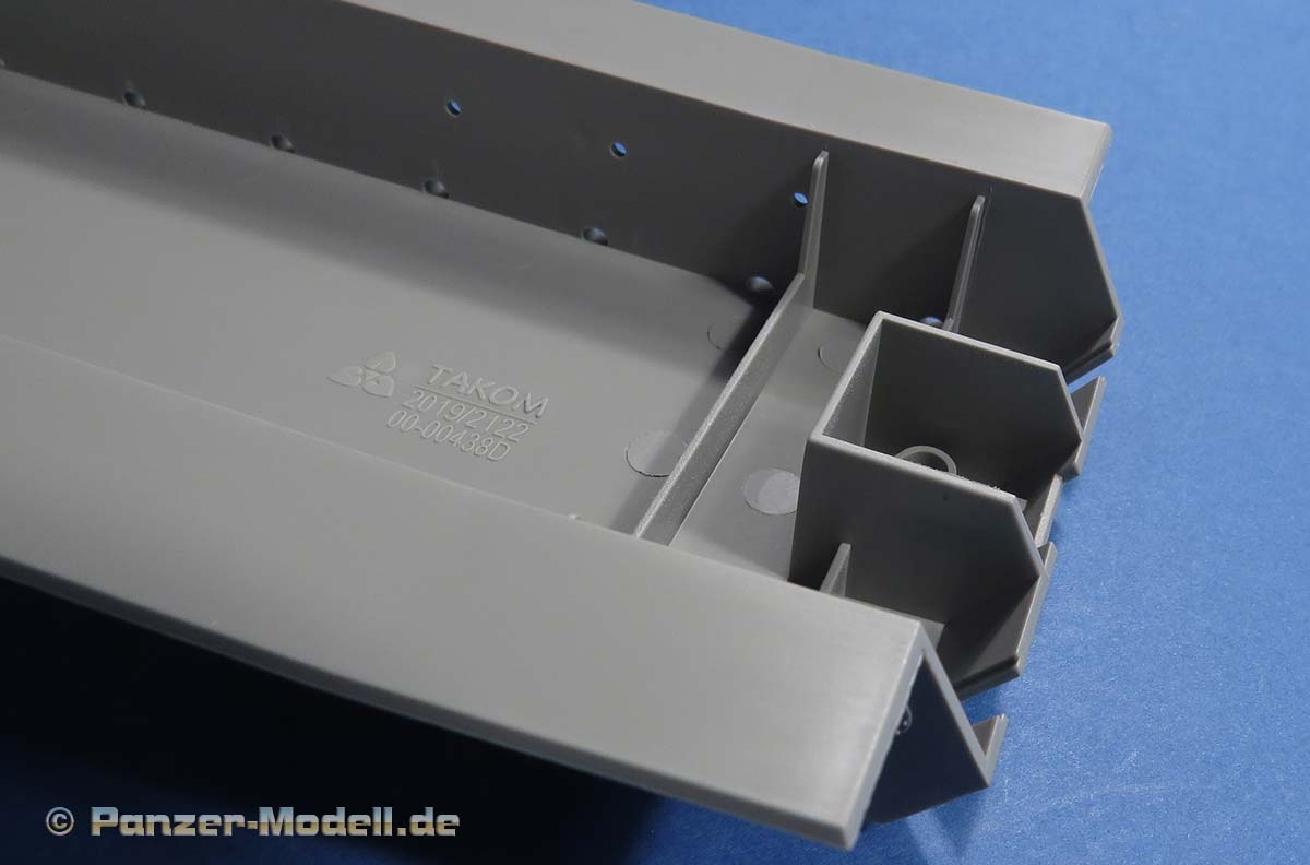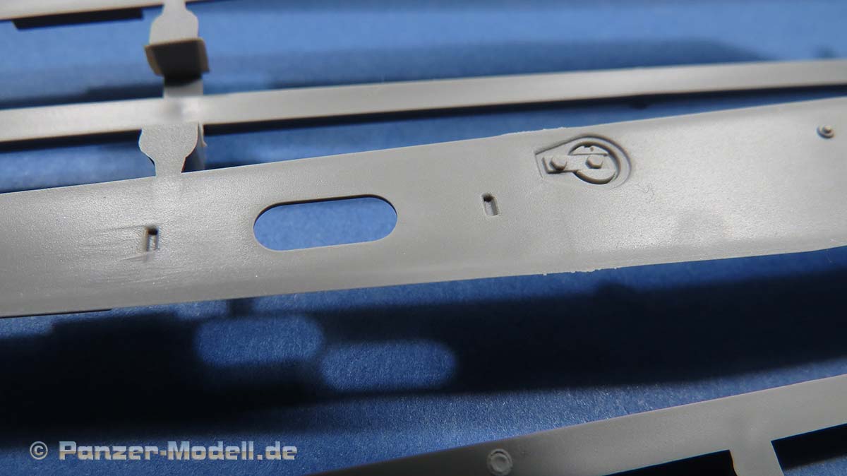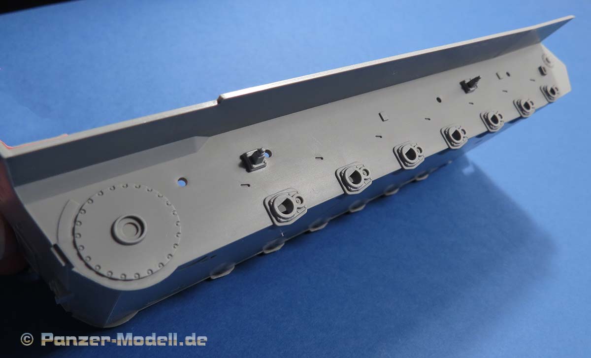 Ansonsten sind die Details an der Wanne wie von Takom zu erwarten gut. die Schwingarme liegen einzeln bei und werden sehr passend in den jeweiligen Aufnahmen verklebt. Ein bewegliches Laufwerk ist nicht ohne weiteres baubar.