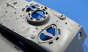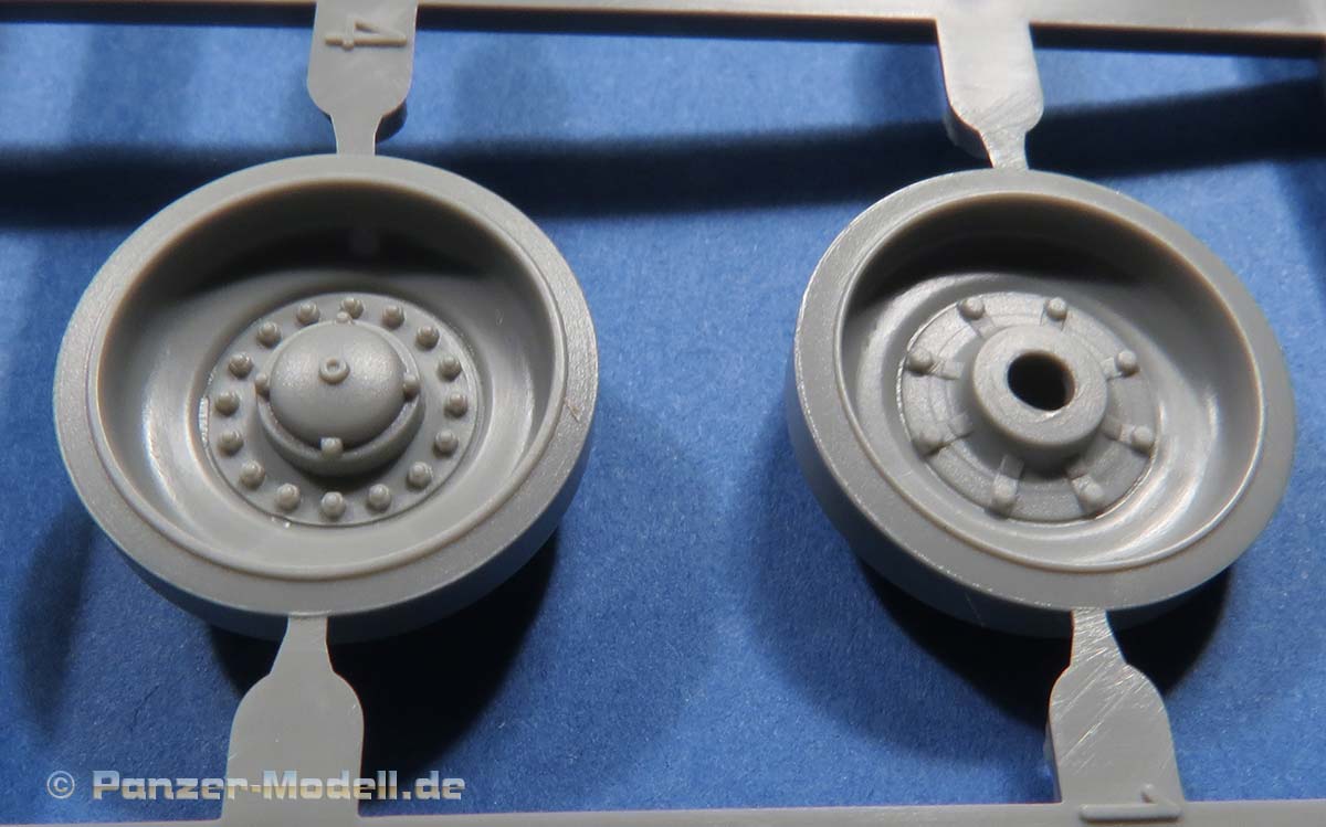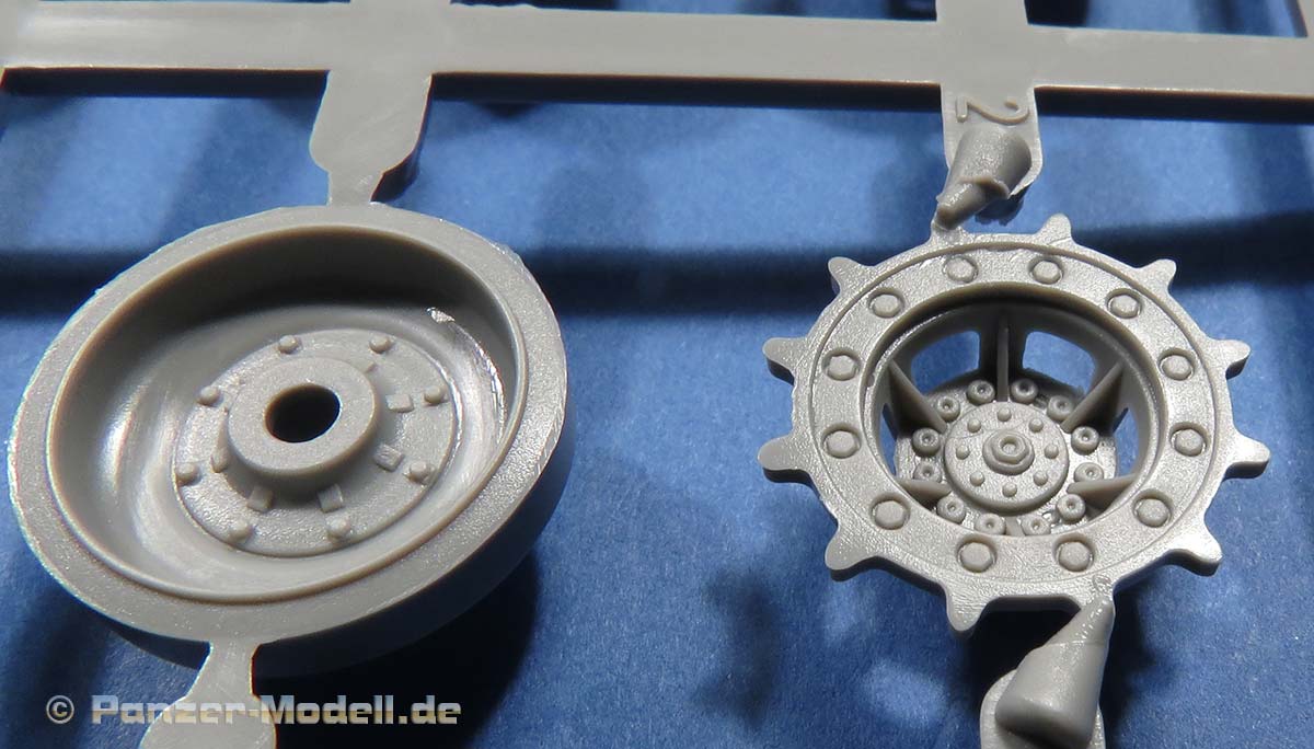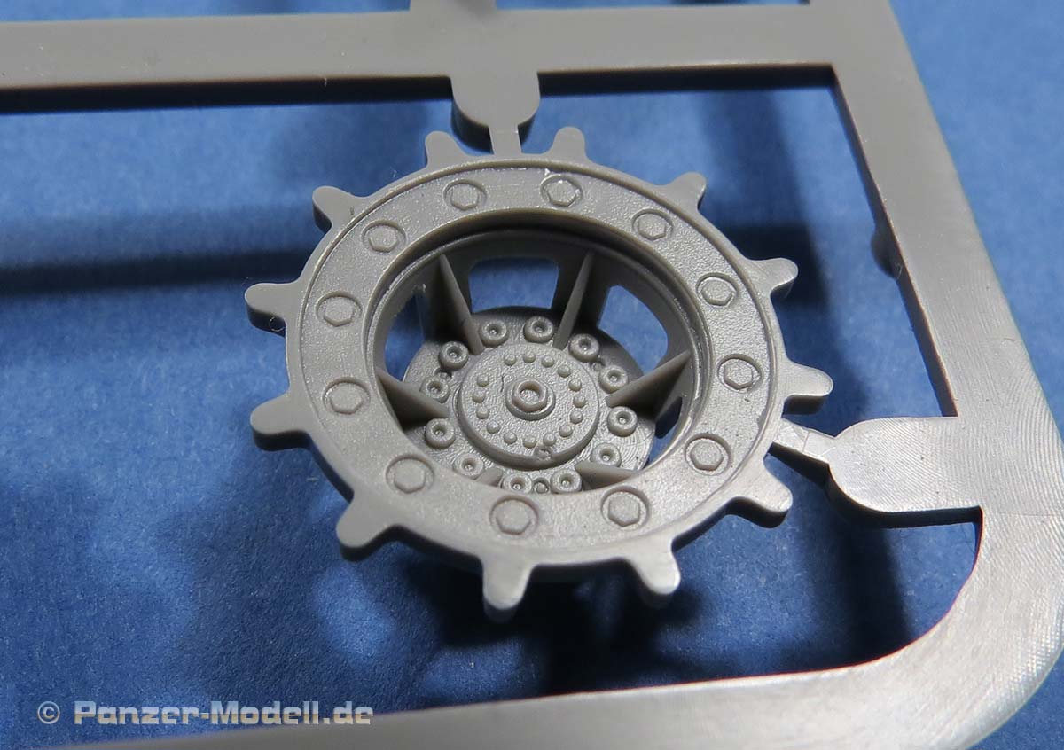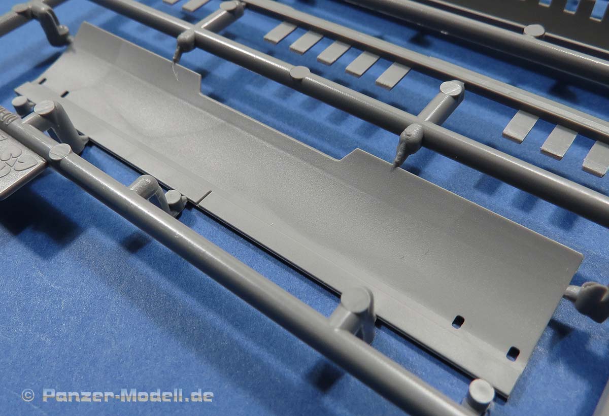 Ansonsten sind die Details an der Wanne wie von Takom zu erwarten gut. die Schwingarme liegen einzeln bei und werden sehr passend in den jeweiligen Aufnahmen verklebt. Ein bewegliches Laufwerk ist nicht ohne weiteres baubar.