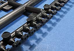 Insgesamt zwar eine Menge Arbeit, denn jeder Kettenglied sitzt an 4 Angüssen, dazu die Mittelverbinder an zwei Angüssen und die Endverbinder an einem Anguss - diese alle müssen abgetrennt und versäubert werden. Das nimmt Zeit in Anspruch, aber am ende besser und einfacher als Kettenglieder, die sich noch aus Ober- und Unterseite zusammensetzen.