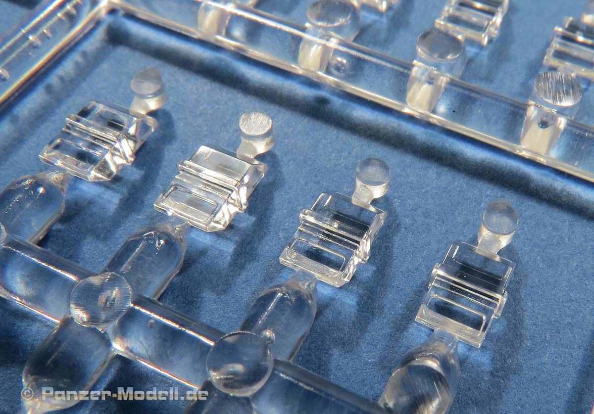 Die vielen Winkelspiegel für Kommandant und Fahrer sind als Klarsichtteile enthalten und machen einen guten Eindruck.