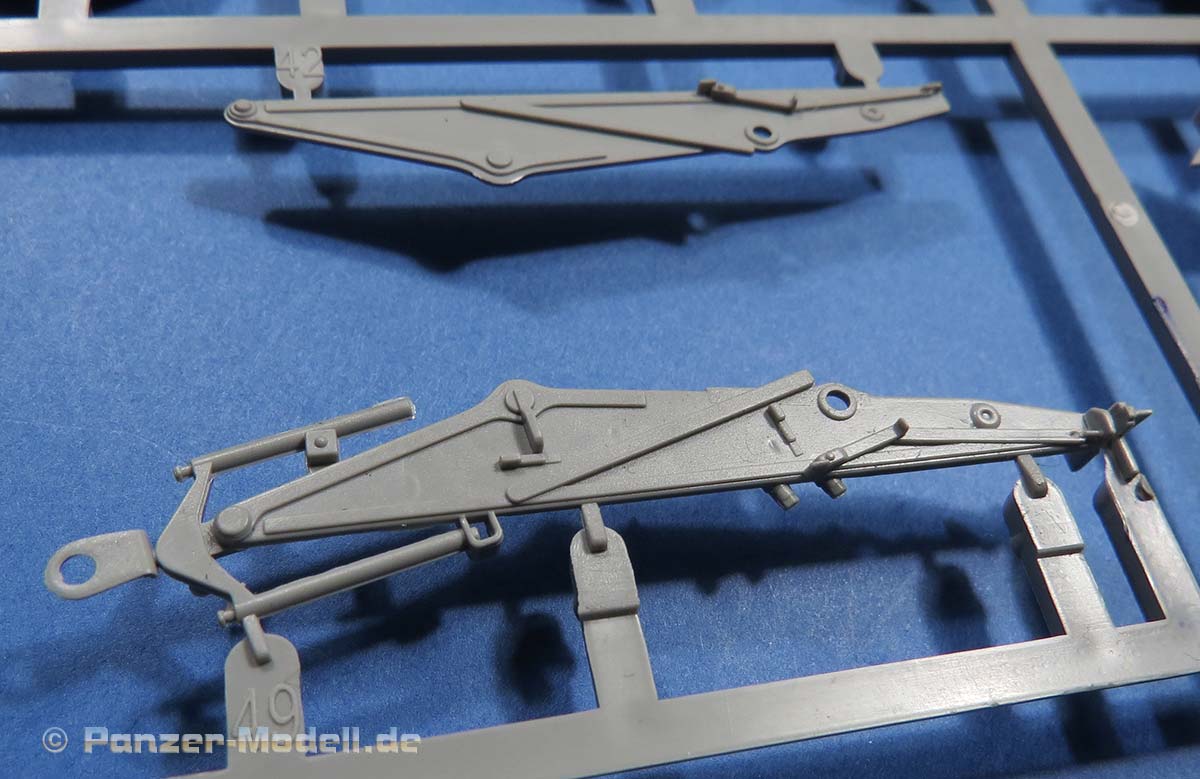 Doch zurück zu unserem Bergepanzer ... der Kranarm setzt sich aus mehreren Teilen zusammen, die einen guten Eindruck machen. Das obere Deckblech zeigt auch die korrekte Darstellung der Antirutsch-Pads ... eventuelle eine Spur zu erhaben, aber insgesamt optisch sehr ansprechend. An der Kranbasis werden zwei Hydraulikzylinder aus je zwei Halbteilen zusammengesetzt, die den Hydraulikstempel beinhalten. Das ganze wird ohne Verkleben in den Kranarm eingesetzt und lässt diesen somit frei in der Höhe beweglich sein. Wie fest/eng das Ganze sitzt um den Arm dann auch in erhobenem Zustand zu halten, muss sich dann noch zeigen.