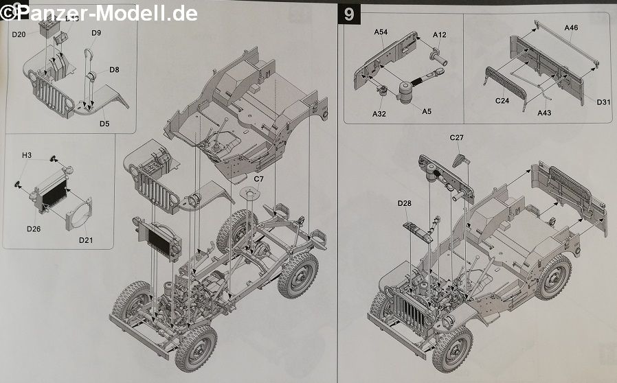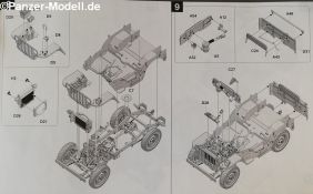Schon wieder ein neuer Jeep? Ok... Das war meine erste Reaktion als ich von Takoms Ankündigung hörte. Denn nichts anderes als ein Willys MB verbirgt sich hinter der kryptischen Bezeichnung, welche Takom (Aus lizenzrechtlichen Gründen) für das Fahrzeug gewählt hat. Da der Original Willys Jeep eines der am weitesten verbreiteten Militärfahrzeug der Welt ist (Ich will hier nicht die ganze Geschichte des Jeeps aufrollen, denn diese füllt bereits ganze Büchreregale), gab es naturgemäß bereits eine Anzahl von Modellen in 1:35. So namhafte Hersteller wie Tamiya, Heller, Italeri (und Lizenznehmer), Bronco, Meng und Dragon hatten bisher diesen Typ im Programm. Darunter mehrere"State of he Art" Kits. Lohnt sich da ein neuer Bausatz? Das klären wir mit einem Blick in die Schachtel: Dieser präsentiert sich sauber und gratfrei gespritzt an drei grauen und einem klaren Gussrahmen, jeweils einem separaten Leiterrahmen und den hinteren Teil der Karosserie für den Jeep. Einem Gussrahmen für den Trailer und einen Gussrahmen für die beiliegende Figur. Fischhaut ist nicht vorhanden und die meisten Auswerfermarken befinden sich an Stellen, die man später nicht mehr sieht (Es sei denn, man möchte die Fronthaube offen bauen, hier müssen dann sechs unschöne Auswerfermarken entfernt werden). Ein winziger Bogen Fotoätzteile, Decals und eine, recht kleine, Bauanleitung runden den Inhalt des Kartons ab. Der Anhänger ist ebenfalls eine sehr schöne Wiedergabe des Originals und beeindruckt mit Details, welche die Mitbewerber oft nur angedeutet haben ... dieser kann dann mit den sich am Spritzling befindlichen Kanistern und Munitionskästen beladen werden. Eine Abdeckung ist nicht vorgesehen und auch nicht im Bausatzumfang enthalten. Die Fahrerfigur ist ebenfalls recht schön. Mit leichten Abstrichen ... insgesamt wirkt der Faltenwurf der Uniform recht steif, was man mit einer entsprechenden Bemalung aber ändern kann. Auch das Gesicht sieht ein wenig aus wie eine Schaufensterpupp. Aber auch das kann man ja ändern - und es gibt den Aftermarket Bereich mit tollen Köpfen. Also Jammen auf hohem Niveau, ich bin froh, dass überhaupt eine Figur dabei ist. Die Bauanleitung führt in 24 Schritten zum Ziel und ist klar und simpel aufgebaut, ohne überfrachtet zu sein. Allerdings ist diese wirklich sehr klein, ob der Hersteller sich und dem etwas älteren Modellbauer hiermit einen Gefallen tut, ist doch sehr fraglich Als Markierungsvarianten gibt Takom vier Fahrzeuge in Olive Drab vor: