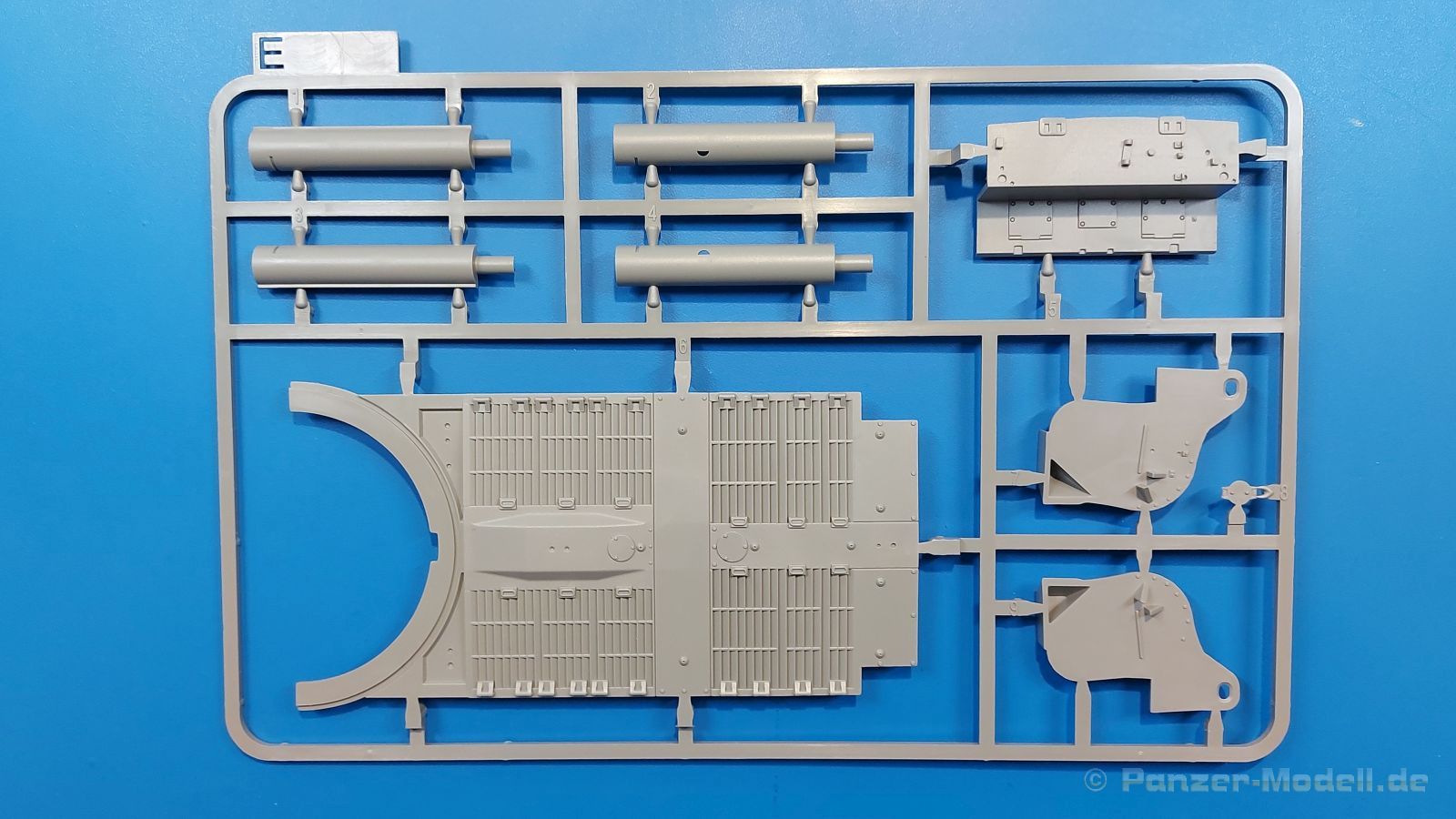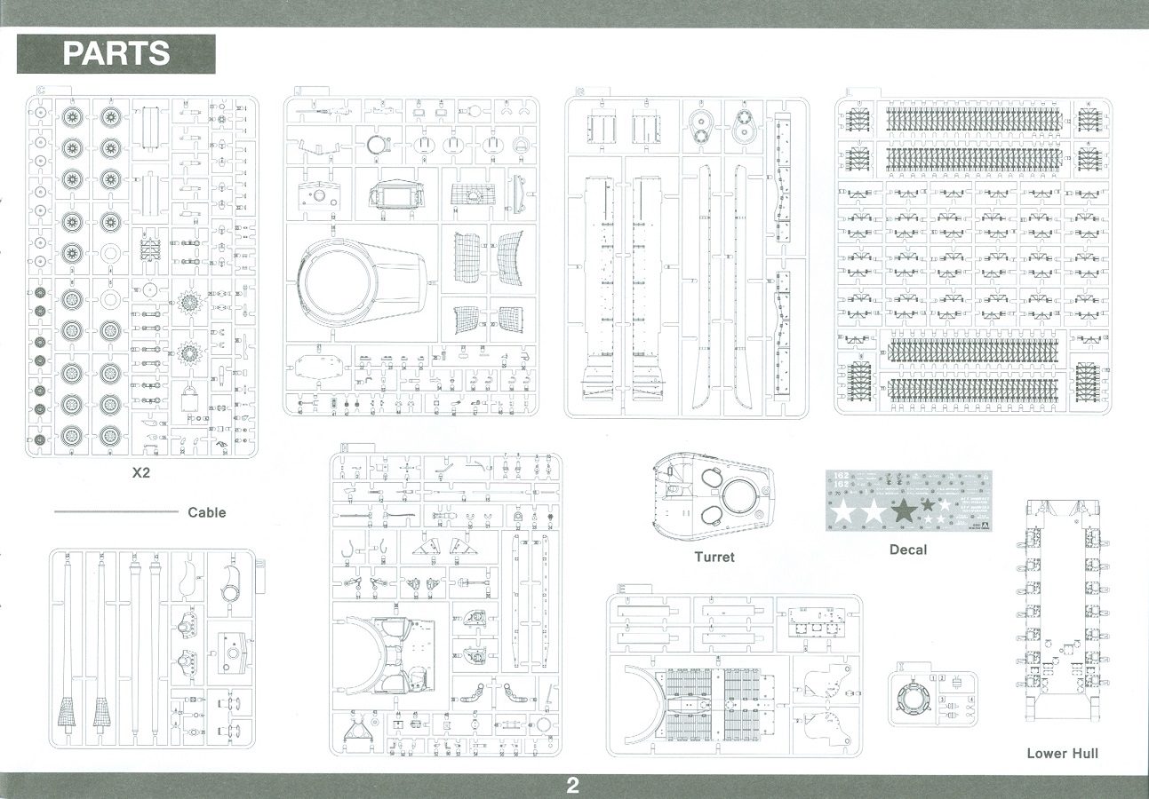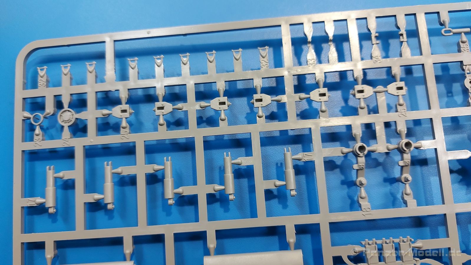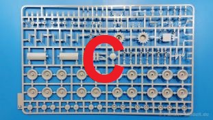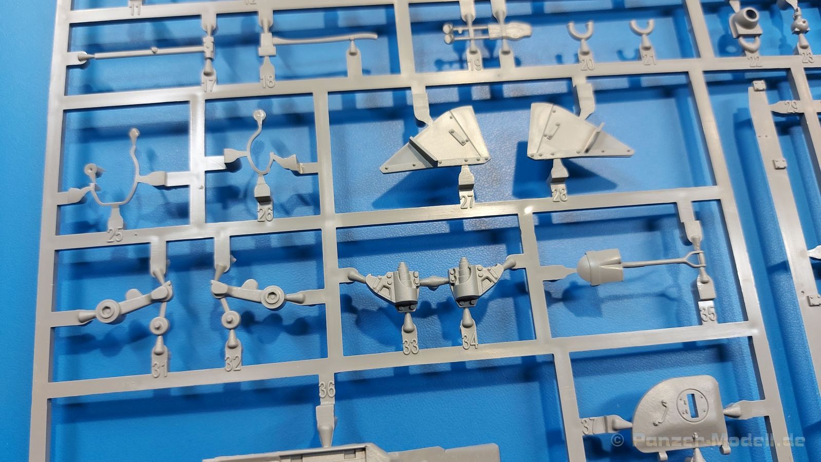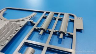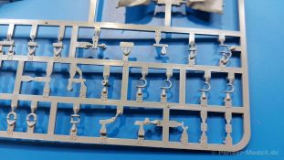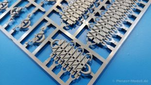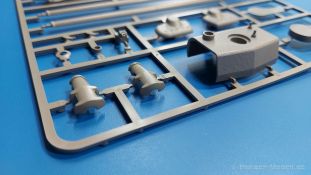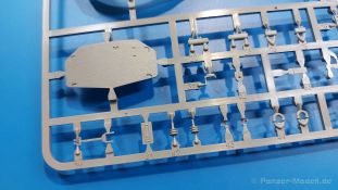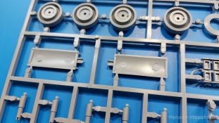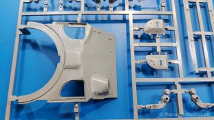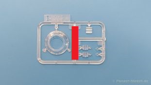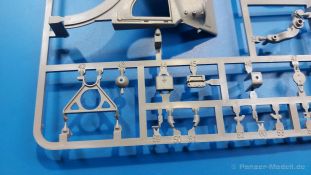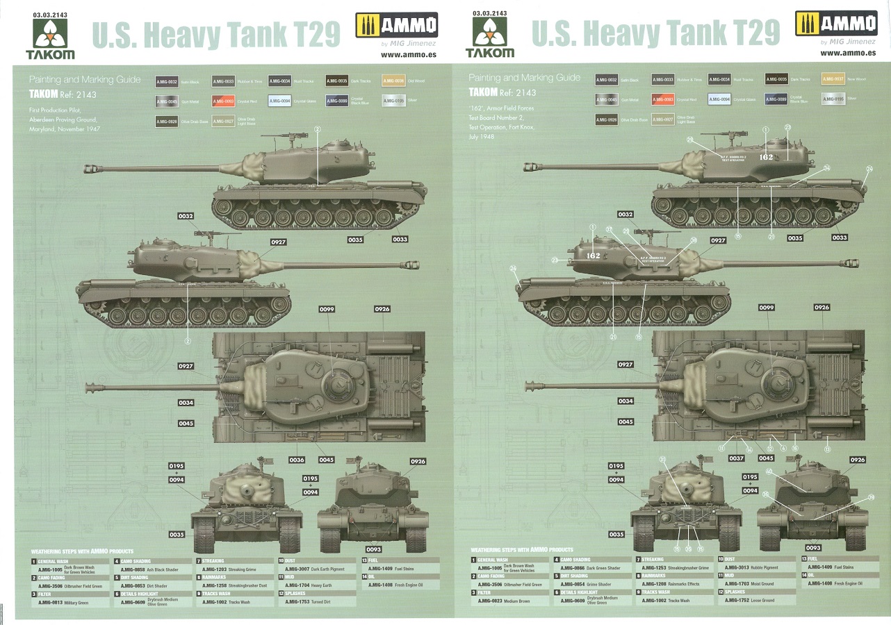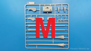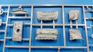 Der Bausatz: 2017 kam TAKOM mit seinen ersten T29/30/34 Modellen heraus. Nun folgt der Vorläufer dieser, also der eigentliche T29. Wir finden im 380 x 250 x 85 mm großen Karton 8 hellgraue Spritzlinge, 1 Klarsichtspritzling, die Unterwanne, Turmoberteil, 1 Draht und 1 Decalbogen. Dazu kommt eine 18-seitige Bauanleitung im A4 Querformat. Die Unterwanne ist einteilig und weist bereits viele, feine, saubere Details wie Wartungsdeckel und die Aufnahmen der Laufwerkskomponenten auf. Die Metallstruktur ist gut wiedergegeben. Die runden Notausstiegsluken der Wannenbesatzung sind separat anzubringen. Die Laufwerkskomponenten bestehen aus 6 Stoßdämpfern pro Seite, Endanschlägen der Schwingarme, den Schwingarmen selbst, den Leitrollenachsen und den Seitenvorgelegegehäusen mit den Antriebsradachsen. Es gibt pro Seite 8 Laufrollen- und 7 Stützrollenpaare. Die Leitrollenpaare sind die gleichen wie die Laufrollen. Die Antriebsräder bestehen aus den äußeren Zahnrädern und zwei Innenscheiben zur Führung der Mitteführungszähne der Kette. Bei allen Rädern sind die Verschraubungen gut und deutlich wiedergegeben. Die Ketten (Typ T80E3) bestehen aus verschieden langen Segmenten und einigen Einzelgliedern. Die Detaillierung ist sehr gut und sauber, insbesondere bei den Kettenführungszähnen und Endverbindern. Auf den Ketteninnenseiten finden sich einige Auswerferspuren - auf jedem Einzelglied zwei, bei den Segmenten alle drei Glieder zwei. Sie sind flach und werden leicht zu entfernen sein, aber es stört mich trotzdem in der heutigen Zeit. Die Oberwanne besteht aus dem Bugteil mit der vorderen Hälfte des Turmdrehkranzes und dem Motordeck mit der hinteren Hälfte des Drehkranzes. Das Bugteil ist aus meiner Sicht schön und die Gußstruktur glaubhaft wiedergegeben. Das Bug-MG mit Kugelblende zeigt einen gelochten Kühlmantel, aber keine Mündungsöffnung. Bei vorsichtigem Umgang mit Klebstoff sollte man das MG beweglich einbauen können. Je zwei Hebeösen, zwei Augen samt Schäkeln und zwei Ersatzkettengliedhalterungen mit angegossenen Kettengliedern finden Platz auf der Bugplatte. Auch die Scheinwerfergruppen (Fahr-, Tarnscheinwerfer) kommen auf die Bugplatte. Die Scheinwerfer sind innen hohl und bekommen Klarsichtgläser. Die Schutzbügel werden teils mit der Bugplatte, teils mit den Kettenblechen verbunden. Die beiden Wannenluken sind beidseitig detailliert. Innen wird je ein Griff angebracht. Wahlweise können Winkelspiegel aus Klarsichtmaterial mit separaten Deckeln eingebaut werden oder man schließt die Öffnungen nur mit den Deckeln. Das Motordeck zeigt schön die scharfen Kanten der Grätings. Die gepanzerten Deckel der Motorflüssigkeiten werden separat angebracht. Das Heckteil besteht aus zwei Seitenteilen, an die dann die Seitenvorgelegegehäuse angebaut werden und dem gewinkelten Heckteil. Es werden angebaut: zwei Schleppaugen ohne Schäkel, eine Halterung für eine Anhängekupplung (ohne die Kupplung selbst), zwei Rücklichter und deren Schutzbügel, ein kleiner Staukasten, eine Außenbordsprechanlage(?) und eine Kanisterhalterung(?). Auch die Rohrzurrung wird angebaut. Sie bleibt beweglich. Man könnte also in Transportstellung den Turm nach hinten gedreht mit Rohr in der angehobenen Rohrzurrung darstellen, aber die Bauanleitung geht nicht weiter darauf ein. Die großen Kettenbleche sind bereits mit Schraubenköpfen und Versteifungsrippen versehen. Hinten muss nur noch das gerundete Abschlussteil angebracht werden. Beidseitig werden große Staukästen, bestehend aus Ober- und Seitenteil werden aufgesetzt. Die Staukastenklappen bekommen noch zwei oder drei Verriegelungsgriffe. Große, zylinderförmige Auspufftöpfe setzt man auf die Kettenbleche. Sie sind längs zweigeteilt, aber dafür ist das Endrohr dann hohl. Ein kleiner Stutzen verbindet die Töpfe mit der Wanne. Die Abschleppseile aus fein verdrilltem Draht werden mit den Kauschen aus Plastik verbunden und größtenteils auf den Kettenblechen angebracht. Die vorderen Enden reichen dann über Kreuz zu den Schäkeln an der Bugseite. Vorn auf das rechte Kettenblech setzt man die feine Hupe mit ihrem Schutzbügel. Auf dem linken Kettenblech findet das ganze Pionierwerkzeug seinen Platz. Es besteht aus Axt, Spitzhacke, Hackenstiel, Vorschlaghammer, Schaufel und Brechstange. Dazu kommt ein MG-Dreibein im Überzug. Seitliche Kettenbleche sind mit ihren Aufteilungen und Verschraubungen dargestellt. Der Turm ist riesig und besteht aus Unter- und Oberteil. Hier sind neben der Gussstruktur auch die Gussnummern zu erwähnen. Es sind ovale Öffnungen für die Richt-/Ladeschützenluken und eine runde für die Kommandantenluke vorhanden. Auch die ovalen Luken sind beidseitig detailliert. Auffällig sind hier die feinen Spiralfedern außen. Die Kommandantenkuppel besteht im Bereich der Sichtöffnungen dankenswerterweise aus Klarsichtmaterial. Der Lukendeckel kann beweglich angebaut werden. Hier hat man die Wahl, ob man den Winkelspiegel einbaut oder die Öffnung nur mit dem Deckel verschließt. Auf dem Turm bringt man noch zwei Antennenfüße, ein großes Lüftergehäuse, Verriegelungen für die ovalen Luken, Grobvisier für den Kommandanten und ein cal. 50 MG samt Gurtkasten und Halterung an. Das MG mit separatem Deckel, Abfeuerungsgriff, Kühlmantel und Halterung ist schon sehr schön, aber der besondere Hingucker ist die Rohrstütze. Hier braucht man kein PE-Teil, so fein ist sie gestaltet. Der Turm bekommt seitlich noch je zwei Hebeösen und weitere Halterungen ohne Inhalt. Rechtsseitig wird eine Ladeluke in die Öffnung gesetzt. Die Turmheckplatte wird mit den Transporthalterungen für das cal. 50 MG versehen. Bei Rohr und Blende kann man wieder wählen - eine bewegliche Blende mit Gussstruktur und glattem Rohr oder eine starre Blende mit Blendenplane und Rohr mit Plane zur Blende hin. Die Rohre sind leider längs in Hälften geteilt, ebenso die Mündungsbremse, dafür gibt es aber durchbrochene Mündungseinsätze. Verwendet man die B