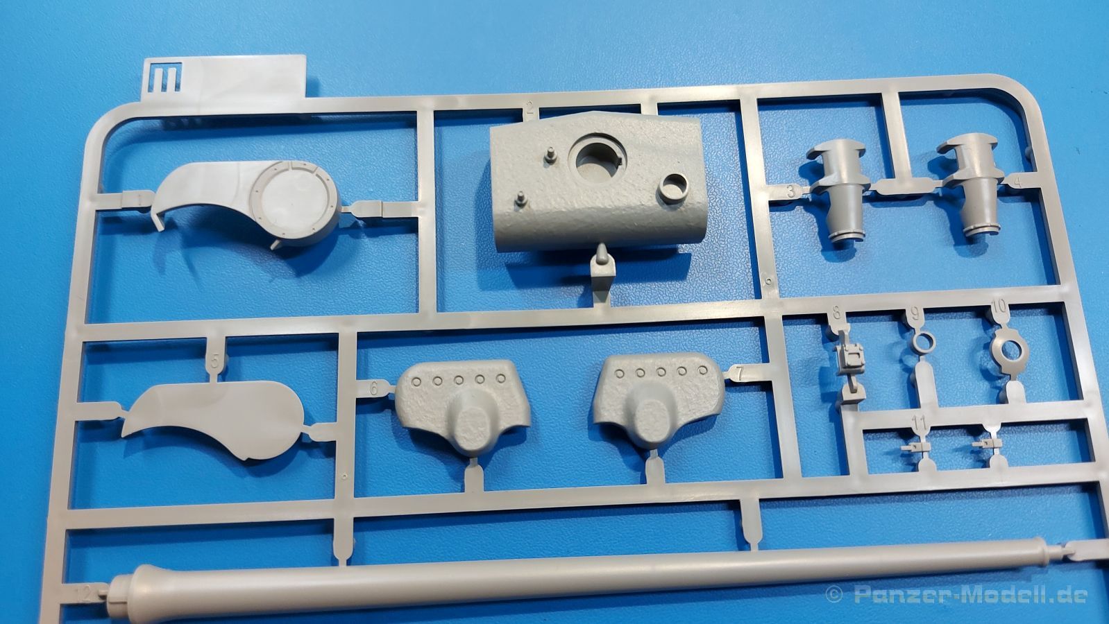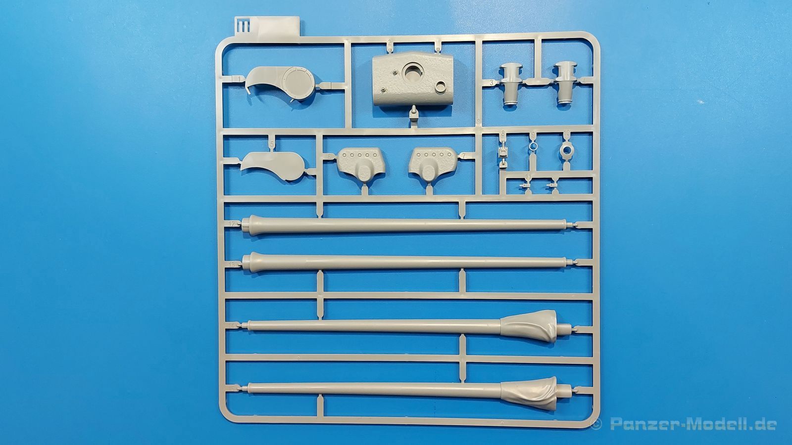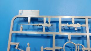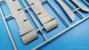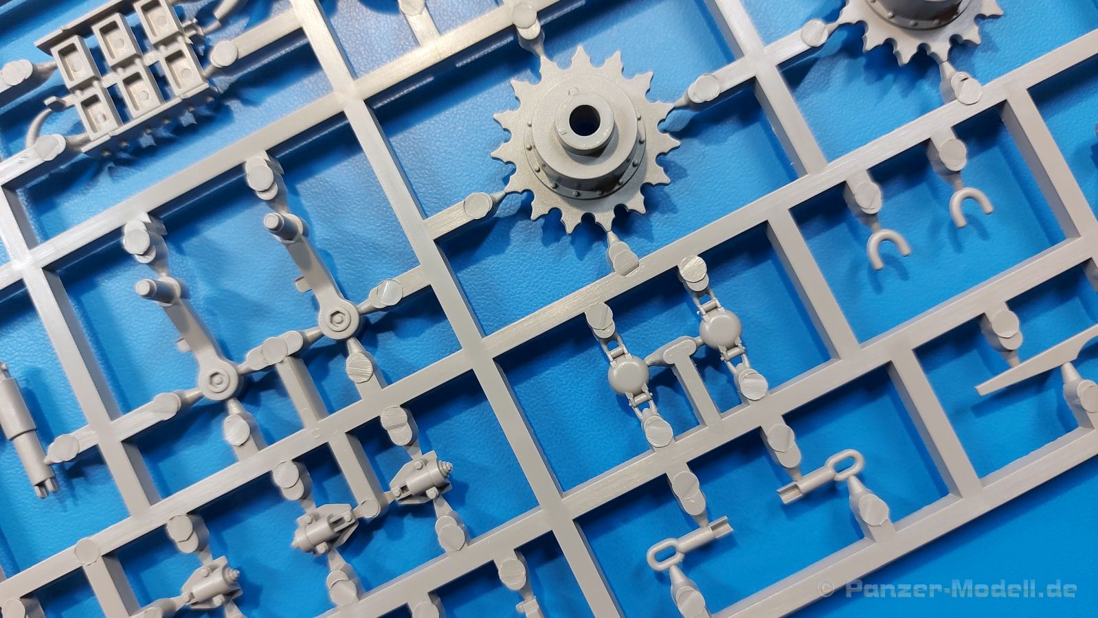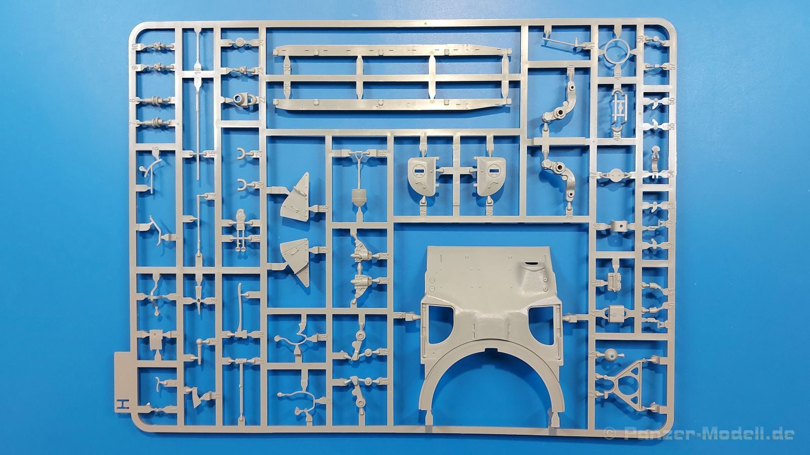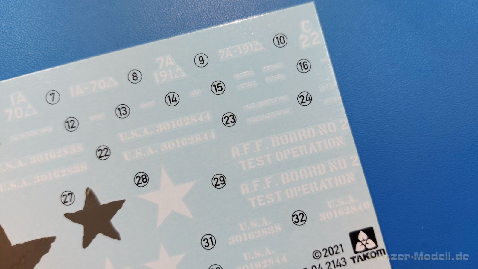 Der Bausatz: 2017 kam TAKOM mit seinen ersten T29/30/34 Modellen heraus. Nun folgt der Vorläufer dieser, also der eigentliche T29. Wir finden im 380 x 250 x 85 mm großen Karton 8 hellgraue Spritzlinge, 1 Klarsichtspritzling, die Unterwanne, Turmoberteil, 1 Draht und 1 Decalbogen. Dazu kommt eine 18-seitige Bauanleitung im A4 Querformat. Die Unterwanne ist einteilig und weist bereits viele, feine, saubere Details wie Wartungsdeckel und die Aufnahmen der Laufwerkskomponenten auf. Die Metallstruktur ist gut wiedergegeben. Die runden Notausstiegsluken der Wannenbesatzung sind separat anzubringen. Die Laufwerkskomponenten bestehen aus 6 Stoßdämpfern pro Seite, Endanschlägen der Schwingarme, den Schwingarmen selbst, den Leitrollenachsen und den Seitenvorgelegegehäusen mit den Antriebsradachsen. Es gibt pro Seite 8 Laufrollen- und 7 Stützrollenpaare. Die Leitrollenpaare sind die gleichen wie die Laufrollen. Die Antriebsräder bestehen aus den äußeren Zahnrädern und zwei Innenscheiben zur Führung der Mitteführungszähne der Kette. Bei allen Rädern sind die Verschraubungen gut und deutlich wiedergegeben. Die Ketten (Typ T80E3) bestehen aus verschieden langen Segmenten und einigen Einzelgliedern. Die Detaillierung ist sehr gut und sauber, insbesondere bei den Kettenführungszähnen und Endverbindern. Auf den Ketteninnenseiten finden sich einige Auswerferspuren - auf jedem Einzelglied zwei, bei den Segmenten alle drei Glieder zwei. Sie sind flach und werden leicht zu entfernen sein, aber es stört mich trotzdem in der heutigen Zeit. Die Oberwanne besteht aus dem Bugteil mit der vorderen Hälfte des Turmdrehkranzes und dem Motordeck mit der hinteren Hälfte des Drehkranzes. Das Bugteil ist aus meiner Sicht schön und die Gußstruktur glaubhaft wiedergegeben. Das Bug-MG mit Kugelblende zeigt einen gelochten Kühlmantel, aber keine Mündungsöffnung. Bei vorsichtigem Umgang mit Klebstoff sollte man das MG beweglich einbauen können. Je zwei Hebeösen, zwei Augen samt Schäkeln und zwei Ersatzkettengliedhalterungen mit angegossenen Kettengliedern finden Platz auf der Bugplatte. Auch die Scheinwerfergruppen (Fahr-, Tarnscheinwerfer) kommen auf die Bugplatte. Die Scheinwerfer sind innen hohl und bekommen Klarsichtgläser. Die Schutzbügel werden teils mit der Bugplatte, teils mit den Kettenblechen verbunden. Die beiden Wannenluken sind beidseitig detailliert. Innen wird je ein Griff angebracht. Wahlweise können Winkelspiegel aus Klarsichtmaterial mit separaten Deckeln eingebaut werden oder man schließt die Öffnungen nur mit den Deckeln. Das Motordeck zeigt schön die scharfen Kanten der Grätings. Die gepanzerten Deckel der Motorflüssigkeiten werden separat angebracht. Das Heckteil besteht aus zwei Seitenteilen, an die dann die Seitenvorgelegegehäuse angebaut werden und dem gewinkelten Heckteil. Es werden angebaut: zwei Schleppaugen ohne Schäkel, eine Halterung für eine Anhängekupplung (ohne die Kupplung selbst), zwei Rücklichter und deren Schutzbügel, ein kleiner Staukasten, eine Außenbordsprechanlage(?) und eine Kanisterhalterung(?). Auch die Rohrzurrung wird angebaut. Sie bleibt beweglich. Man könnte also in Transportstellung den Turm nach hinten gedreht mit Rohr in der angehobenen Rohrzurrung darstellen, aber die Bauanleitung geht nicht weiter darauf ein. Die großen Kettenbleche sind bereits mit Schraubenköpfen und Versteifungsrippen versehen. Hinten muss nur noch das gerundete Abschlussteil angebracht werden. Beidseitig werden große Staukästen, bestehend aus Ober- und Seitenteil werden aufgesetzt. Die Staukastenklappen bekommen noch zwei oder drei Verriegelungsgriffe. Große, zylinderförmige Auspufftöpfe setzt man auf die Kettenbleche. Sie sind längs zweigeteilt, aber dafür ist das Endrohr dann hohl. Ein kleiner Stutzen verbindet die Töpfe mit der Wanne. Die Abschleppseile aus fein verdrilltem Draht werden mit den Kauschen aus Plastik verbunden und größtenteils auf den Kettenblechen angebracht. Die vorderen Enden reichen dann über Kreuz zu den Schäkeln an der Bugseite. Vorn auf das rechte Kettenblech setzt man die feine Hupe mit ihrem Schutzbügel. Auf dem linken Kettenblech findet das ganze Pionierwerkzeug seinen Platz. Es besteht aus Axt, Spitzhacke, Hackenstiel, Vorschlaghammer, Schaufel und Brechstange. Dazu kommt ein MG-Dreibein im Überzug. Seitliche Kettenbleche sind mit ihren Aufteilungen und Verschraubungen dargestellt. Der Turm ist riesig und besteht aus Unter- und Oberteil. Hier sind neben der Gussstruktur auch die Gussnummern zu erwähnen. Es sind ovale Öffnungen für die Richt-/Ladeschützenluken und eine runde für die Kommandantenluke vorhanden. Auch die ovalen Luken sind beidseitig detailliert. Auffällig sind hier die feinen Spiralfedern außen. Die Kommandantenkuppel besteht im Bereich der Sichtöffnungen dankenswerterweise aus Klarsichtmaterial. Der Lukendeckel kann beweglich angebaut werden. Hier hat man die Wahl, ob man den Winkelspiegel einbaut oder die Öffnung nur mit dem Deckel verschließt. Auf dem Turm bringt man noch zwei Antennenfüße, ein großes Lüftergehäuse, Verriegelungen für die ovalen Luken, Grobvisier für den Kommandanten und ein cal. 50 MG samt Gurtkasten und Halterung an. Das MG mit separatem Deckel, Abfeuerungsgriff, Kühlmantel und Halterung ist schon sehr schön, aber der besondere Hingucker ist die Rohrstütze. Hier braucht man kein PE-Teil, so fein ist sie gestaltet. Der Turm bekommt seitlich noch je zwei Hebeösen und weitere Halterungen ohne Inhalt. Rechtsseitig wird eine Ladeluke in die Öffnung gesetzt. Die Turmheckplatte wird mit den Transporthalterungen für das cal. 50 MG versehen. Bei Rohr und Blende kann man wieder wählen - eine bewegliche Blende mit Gussstruktur und glattem Rohr oder eine starre Blende mit Blendenplane und Rohr mit Plane zur Blende hin. Die Rohre sind leider längs in Hälften geteilt, ebenso die Mündungsbremse, dafür gibt es aber durchbrochene Mündungseinsätze. Verwendet man die B