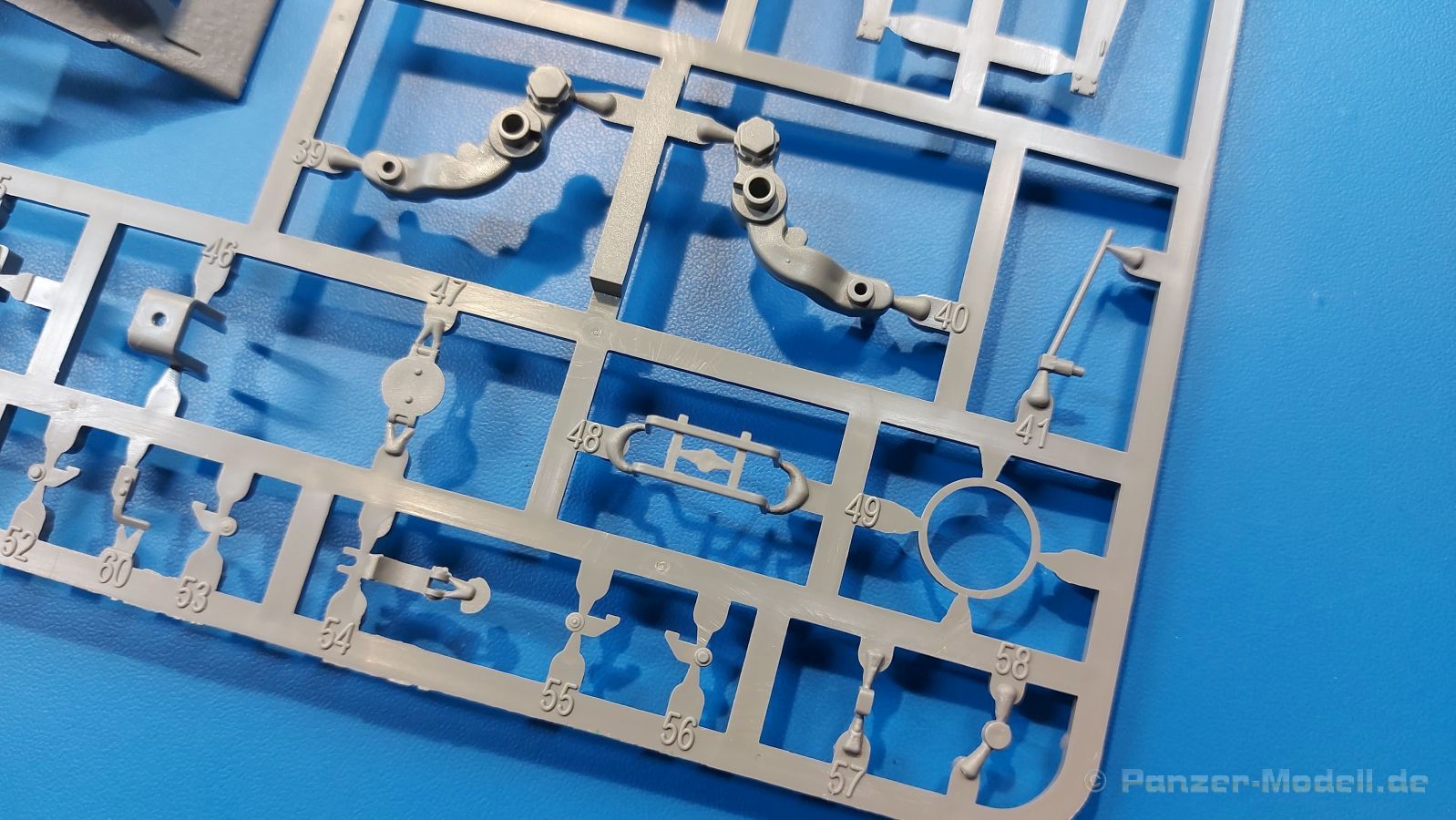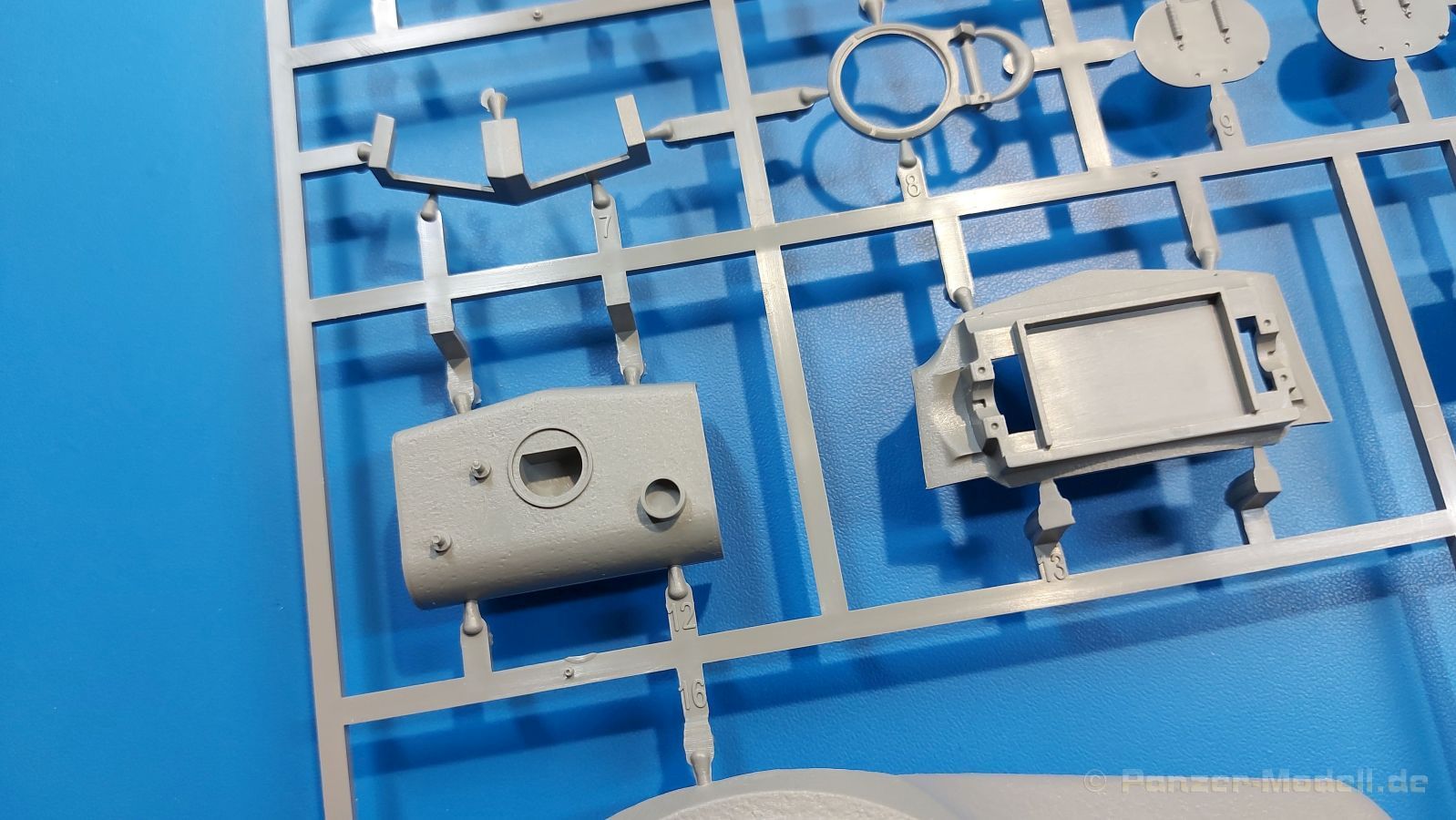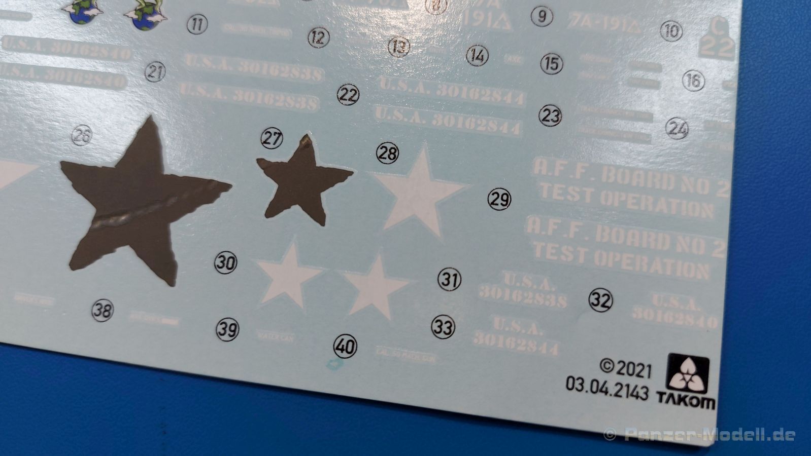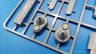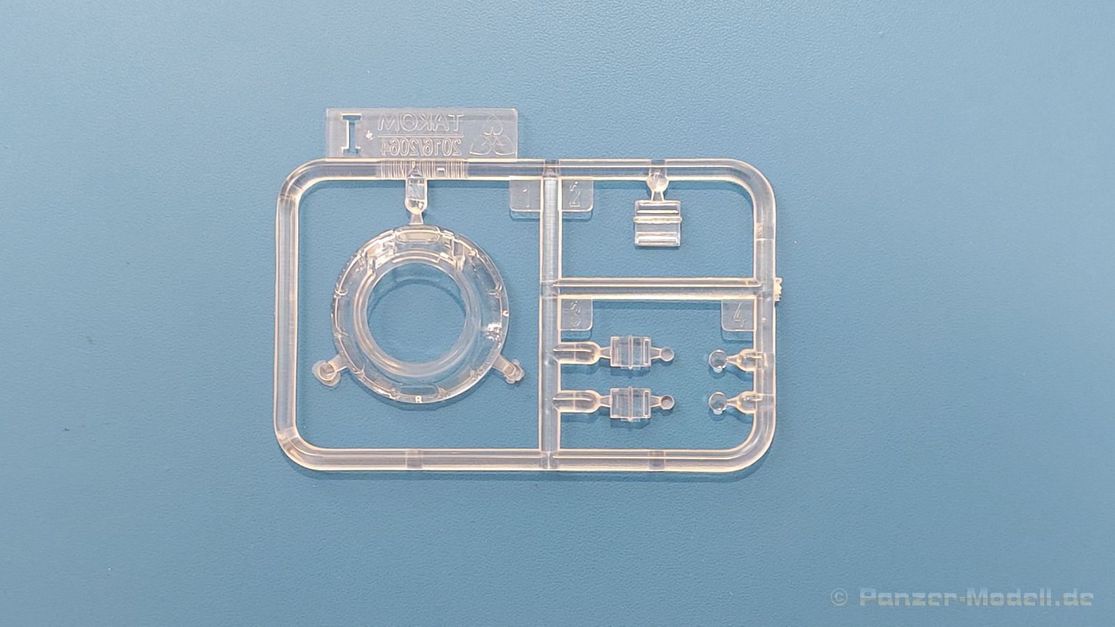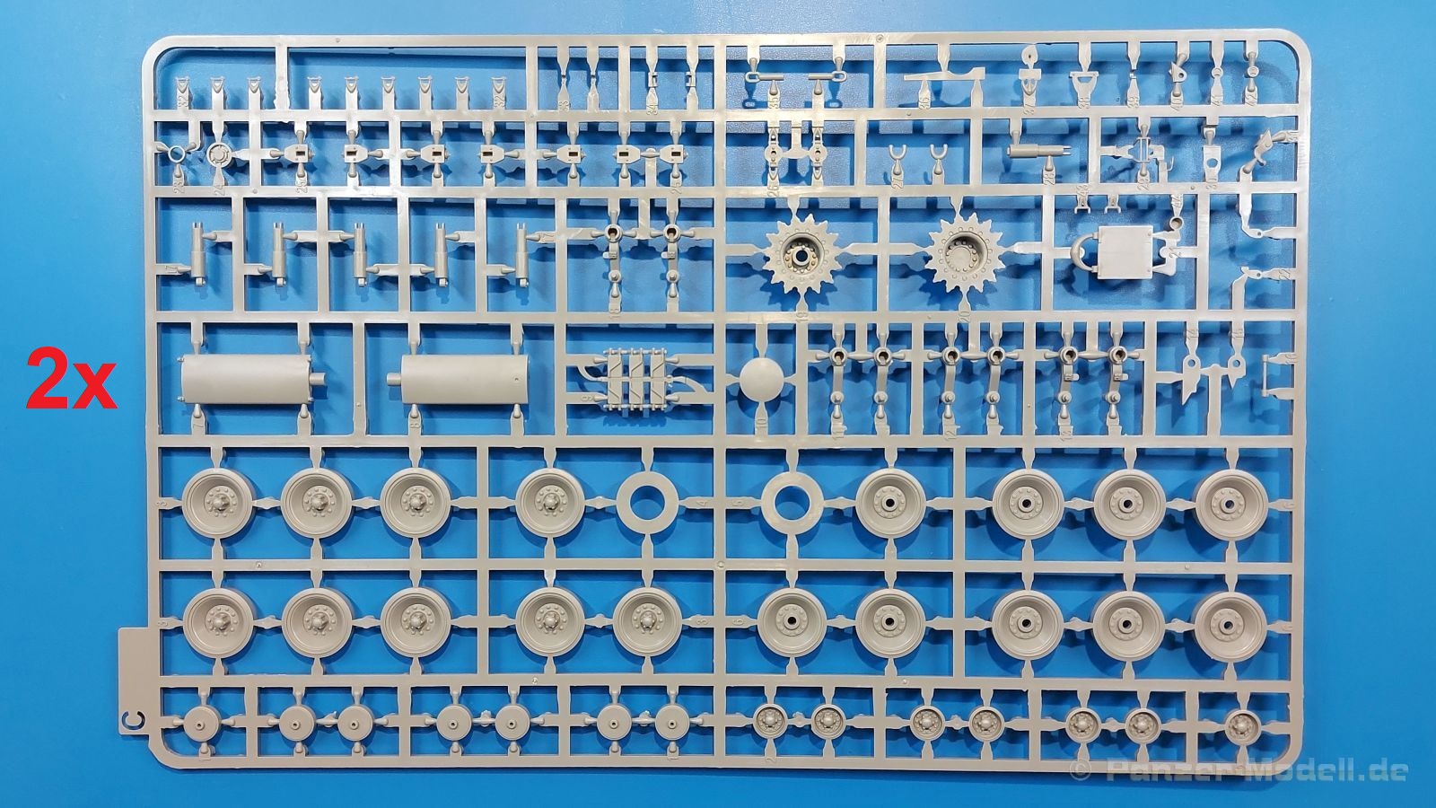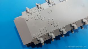 Der Bausatz: 2017 kam TAKOM mit seinen ersten T29/30/34 Modellen heraus. Nun folgt der Vorläufer dieser, also der eigentliche T29. Wir finden im 380 x 250 x 85 mm großen Karton 8 hellgraue Spritzlinge, 1 Klarsichtspritzling, die Unterwanne, Turmoberteil, 1 Draht und 1 Decalbogen. Dazu kommt eine 18-seitige Bauanleitung im A4 Querformat. Die Unterwanne ist einteilig und weist bereits viele, feine, saubere Details wie Wartungsdeckel und die Aufnahmen der Laufwerkskomponenten auf. Die Metallstruktur ist gut wiedergegeben. Die runden Notausstiegsluken der Wannenbesatzung sind separat anzubringen. Die Laufwerkskomponenten bestehen aus 6 Stoßdämpfern pro Seite, Endanschlägen der Schwingarme, den Schwingarmen selbst, den Leitrollenachsen und den Seitenvorgelegegehäusen mit den Antriebsradachsen. Es gibt pro Seite 8 Laufrollen- und 7 Stützrollenpaare. Die Leitrollenpaare sind die gleichen wie die Laufrollen. Die Antriebsräder bestehen aus den äußeren Zahnrädern und zwei Innenscheiben zur Führung der Mitteführungszähne der Kette. Bei allen Rädern sind die Verschraubungen gut und deutlich wiedergegeben. Die Ketten (Typ T80E3) bestehen aus verschieden langen Segmenten und einigen Einzelgliedern. Die Detaillierung ist sehr gut und sauber, insbesondere bei den Kettenführungszähnen und Endverbindern. Auf den Ketteninnenseiten finden sich einige Auswerferspuren - auf jedem Einzelglied zwei, bei den Segmenten alle drei Glieder zwei. Sie sind flach und werden leicht zu entfernen sein, aber es stört mich trotzdem in der heutigen Zeit. Die Oberwanne besteht aus dem Bugteil mit der vorderen Hälfte des Turmdrehkranzes und dem Motordeck mit der hinteren Hälfte des Drehkranzes. Das Bugteil ist aus meiner Sicht schön und die Gußstruktur glaubhaft wiedergegeben. Das Bug-MG mit Kugelblende zeigt einen gelochten Kühlmantel, aber keine Mündungsöffnung. Bei vorsichtigem Umgang mit Klebstoff sollte man das MG beweglich einbauen können. Je zwei Hebeösen, zwei Augen samt Schäkeln und zwei Ersatzkettengliedhalterungen mit angegossenen Kettengliedern finden Platz auf der Bugplatte. Auch die Scheinwerfergruppen (Fahr-, Tarnscheinwerfer) kommen auf die Bugplatte. Die Scheinwerfer sind innen hohl und bekommen Klarsichtgläser. Die Schutzbügel werden teils mit der Bugplatte, teils mit den Kettenblechen verbunden. Die beiden Wannenluken sind beidseitig detailliert. Innen wird je ein Griff angebracht. Wahlweise können Winkelspiegel aus Klarsichtmaterial mit separaten Deckeln eingebaut werden oder man schließt die Öffnungen nur mit den Deckeln. Das Motordeck zeigt schön die scharfen Kanten der Grätings. Die gepanzerten Deckel der Motorflüssigkeiten werden separat angebracht. Das Heckteil besteht aus zwei Seitenteilen, an die dann die Seitenvorgelegegehäuse angebaut werden und dem gewinkelten Heckteil. Es werden angebaut: zwei Schleppaugen ohne Schäkel, eine Halterung für eine Anhängekupplung (ohne die Kupplung selbst), zwei Rücklichter und deren Schutzbügel, ein kleiner Staukasten, eine Außenbordsprechanlage(?) und eine Kanisterhalterung(?). Auch die Rohrzurrung wird angebaut. Sie bleibt beweglich. Man könnte also in Transportstellung den Turm nach hinten gedreht mit Rohr in der angehobenen Rohrzurrung darstellen, aber die Bauanleitung geht nicht weiter darauf ein. Die großen Kettenbleche sind bereits mit Schraubenköpfen und Versteifungsrippen versehen. Hinten muss nur noch das gerundete Abschlussteil angebracht werden. Beidseitig werden große Staukästen, bestehend aus Ober- und Seitenteil werden aufgesetzt. Die Staukastenklappen bekommen noch zwei oder drei Verriegelungsgriffe. Große, zylinderförmige Auspufftöpfe setzt man auf die Kettenbleche. Sie sind längs zweigeteilt, aber dafür ist das Endrohr dann hohl. Ein kleiner Stutzen verbindet die Töpfe mit der Wanne. Die Abschleppseile aus fein verdrilltem Draht werden mit den Kauschen aus Plastik verbunden und größtenteils auf den Kettenblechen angebracht. Die vorderen Enden reichen dann über Kreuz zu den Schäkeln an der Bugseite. Vorn auf das rechte Kettenblech setzt man die feine Hupe mit ihrem Schutzbügel. Auf dem linken Kettenblech findet das ganze Pionierwerkzeug seinen Platz. Es besteht aus Axt, Spitzhacke, Hackenstiel, Vorschlaghammer, Schaufel und Brechstange. Dazu kommt ein MG-Dreibein im Überzug. Seitliche Kettenbleche sind mit ihren Aufteilungen und Verschraubungen dargestellt. Der Turm ist riesig und besteht aus Unter- und Oberteil. Hier sind neben der Gussstruktur auch die Gussnummern zu erwähnen. Es sind ovale Öffnungen für die Richt-/Ladeschützenluken und eine runde für die Kommandantenluke vorhanden. Auch die ovalen Luken sind beidseitig detailliert. Auffällig sind hier die feinen Spiralfedern außen. Die Kommandantenkuppel besteht im Bereich der Sichtöffnungen dankenswerterweise aus Klarsichtmaterial. Der Lukendeckel kann beweglich angebaut werden. Hier hat man die Wahl, ob man den Winkelspiegel einbaut oder die Öffnung nur mit dem Deckel verschließt. Auf dem Turm bringt man noch zwei Antennenfüße, ein großes Lüftergehäuse, Verriegelungen für die ovalen Luken, Grobvisier für den Kommandanten und ein cal. 50 MG samt Gurtkasten und Halterung an. Das MG mit separatem Deckel, Abfeuerungsgriff, Kühlmantel und Halterung ist schon sehr schön, aber der besondere Hingucker ist die Rohrstütze. Hier braucht man kein PE-Teil, so fein ist sie gestaltet. Der Turm bekommt seitlich noch je zwei Hebeösen und weitere Halterungen ohne Inhalt. Rechtsseitig wird eine Ladeluke in die Öffnung gesetzt. Die Turmheckplatte wird mit den Transporthalterungen für das cal. 50 MG versehen. Bei Rohr und Blende kann man wieder wählen - eine bewegliche Blende mit Gussstruktur und glattem Rohr oder eine starre Blende mit Blendenplane und Rohr mit Plane zur Blende hin. Die Rohre sind leider längs in Hälften geteilt, ebenso die Mündungsbremse, dafür gibt es aber durchbrochene Mündungseinsätze. Verwendet man die B