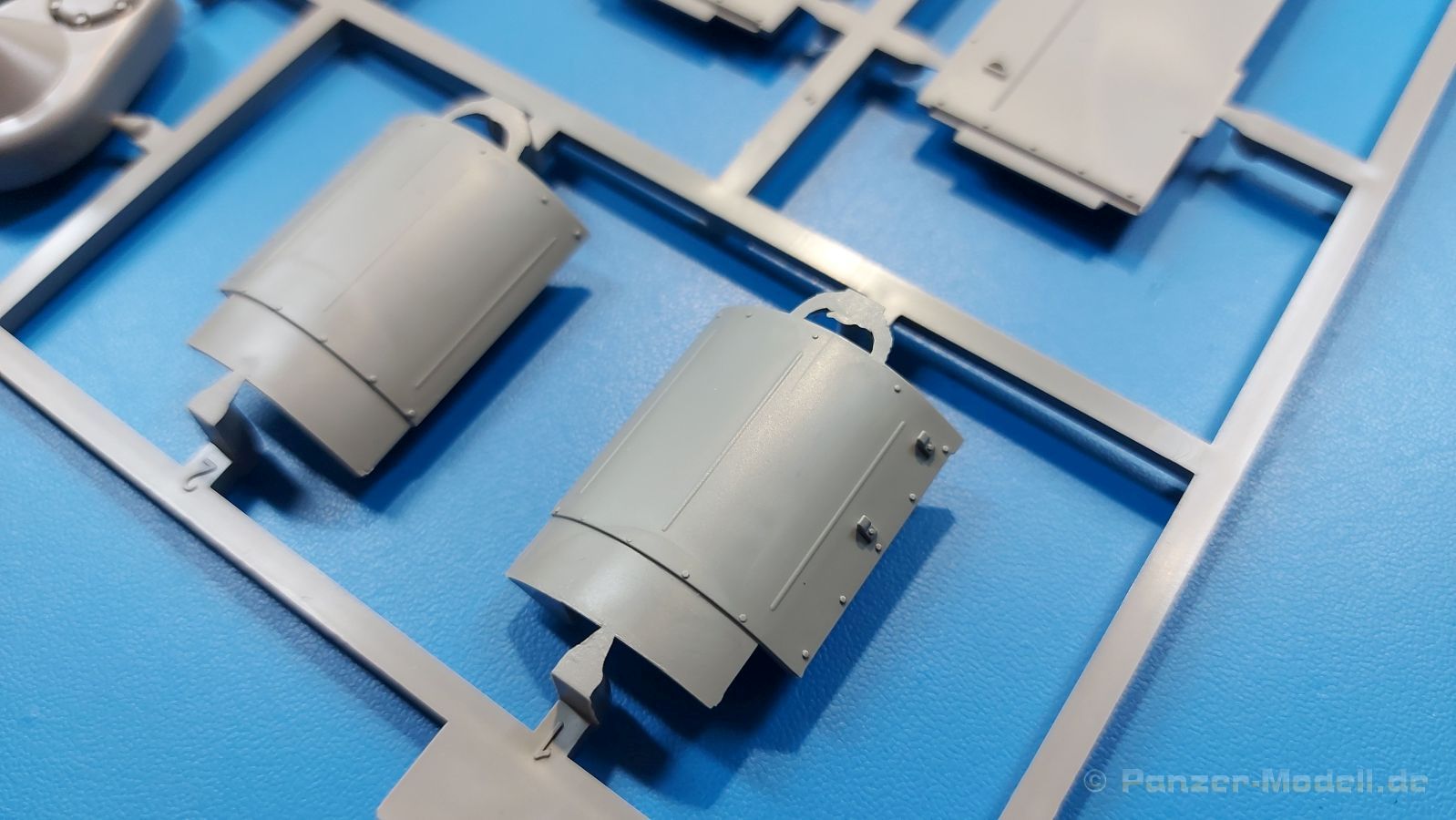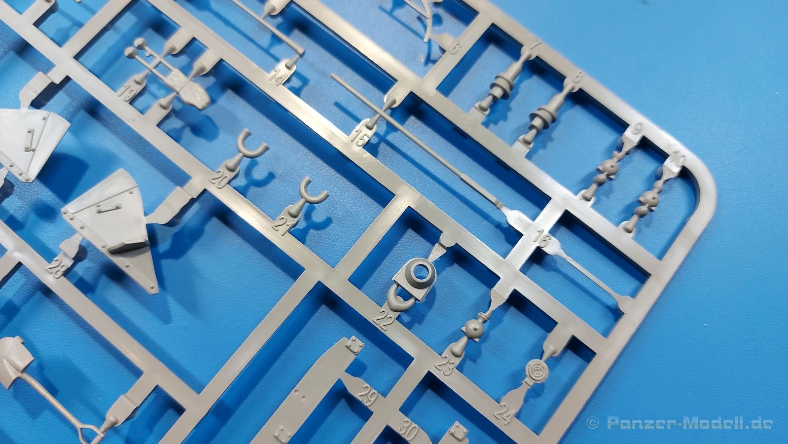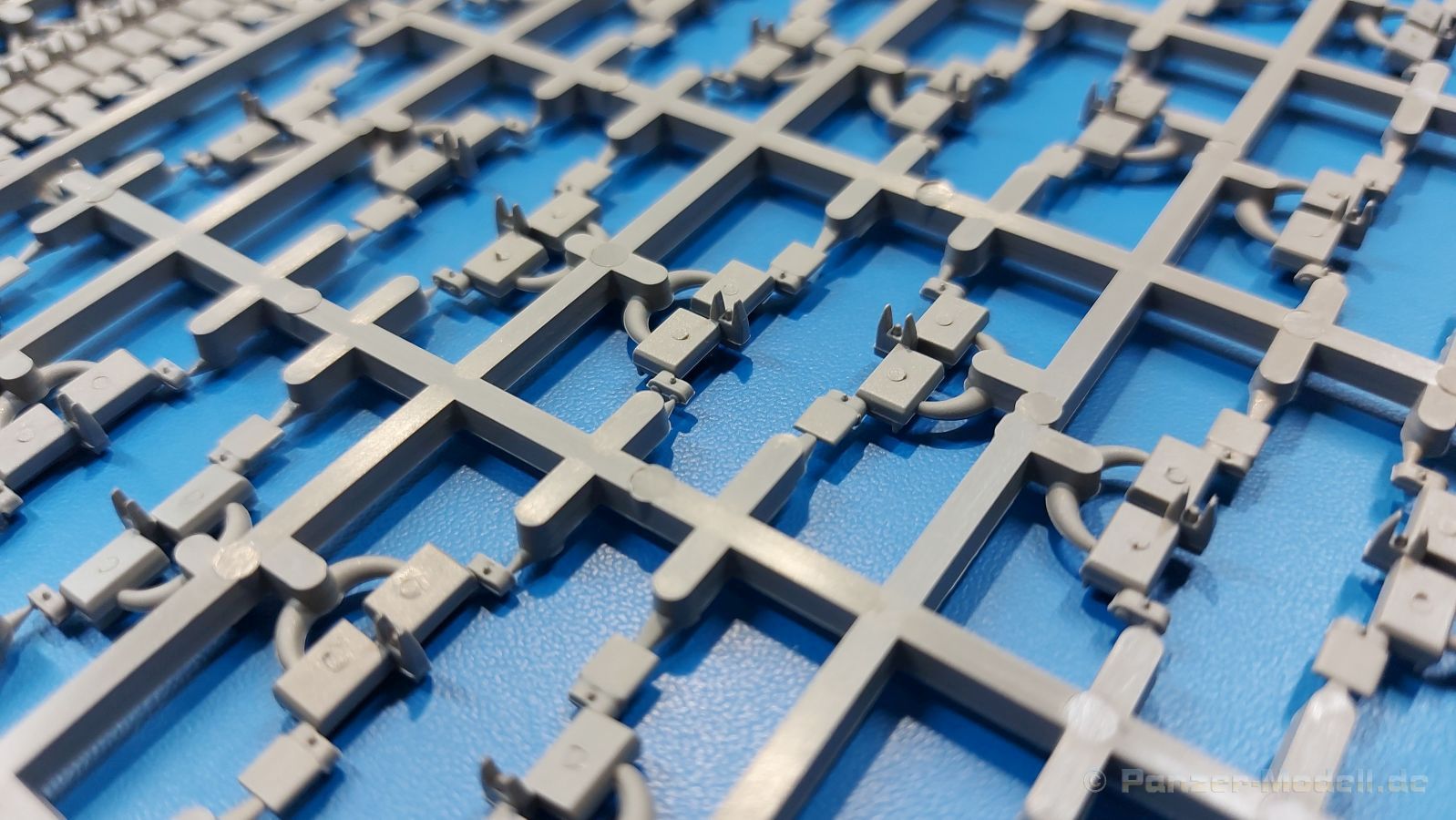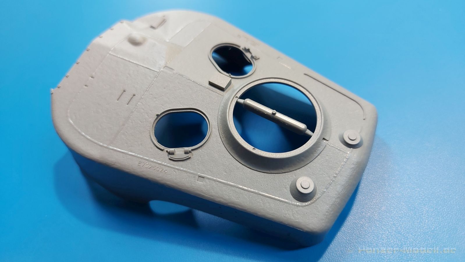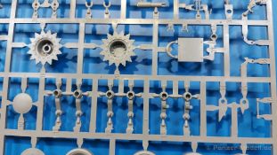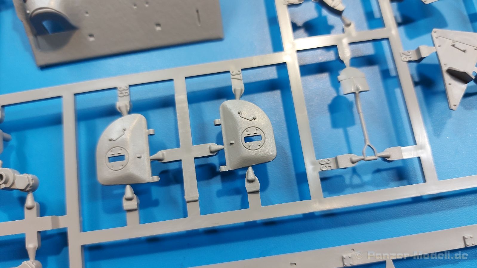Der Bausatz: 2017 kam TAKOM mit seinen ersten T29/30/34 Modellen heraus. Nun folgt der Vorläufer dieser, also der eigentliche T29. Wir finden im 380 x 250 x 85 mm großen Karton 8 hellgraue Spritzlinge, 1 Klarsichtspritzling, die Unterwanne, Turmoberteil, 1 Draht und 1 Decalbogen. Dazu kommt eine 18-seitige Bauanleitung im A4 Querformat. Die Unterwanne ist einteilig und weist bereits viele, feine, saubere Details wie Wartungsdeckel und die Aufnahmen der Laufwerkskomponenten auf. Die Metallstruktur ist gut wiedergegeben. Die runden Notausstiegsluken der Wannenbesatzung sind separat anzubringen. Die Laufwerkskomponenten bestehen aus 6 Stoßdämpfern pro Seite, Endanschlägen der Schwingarme, den Schwingarmen selbst, den Leitrollenachsen und den Seitenvorgelegegehäusen mit den Antriebsradachsen. Es gibt pro Seite 8 Laufrollen- und 7 Stützrollenpaare. Die Leitrollenpaare sind die gleichen wie die Laufrollen. Die Antriebsräder bestehen aus den äußeren Zahnrädern und zwei Innenscheiben zur Führung der Mitteführungszähne der Kette. Bei allen Rädern sind die Verschraubungen gut und deutlich wiedergegeben. Die Ketten (Typ T80E3) bestehen aus verschieden langen Segmenten und einigen Einzelgliedern. Die Detaillierung ist sehr gut und sauber, insbesondere bei den Kettenführungszähnen und Endverbindern. Auf den Ketteninnenseiten finden sich einige Auswerferspuren - auf jedem Einzelglied zwei, bei den Segmenten alle drei Glieder zwei. Sie sind flach und werden leicht zu entfernen sein, aber es stört mich trotzdem in der heutigen Zeit. Die Oberwanne besteht aus dem Bugteil mit der vorderen Hälfte des Turmdrehkranzes und dem Motordeck mit der hinteren Hälfte des Drehkranzes. Das Bugteil ist aus meiner Sicht schön und die Gußstruktur glaubhaft wiedergegeben. Das Bug-MG mit Kugelblende zeigt einen gelochten Kühlmantel, aber keine Mündungsöffnung. Bei vorsichtigem Umgang mit Klebstoff sollte man das MG beweglich einbauen können. Je zwei Hebeösen, zwei Augen samt Schäkeln und zwei Ersatzkettengliedhalterungen mit angegossenen Kettengliedern finden Platz auf der Bugplatte. Auch die Scheinwerfergruppen (Fahr-, Tarnscheinwerfer) kommen auf die Bugplatte. Die Scheinwerfer sind innen hohl und bekommen Klarsichtgläser. Die Schutzbügel werden teils mit der Bugplatte, teils mit den Kettenblechen verbunden. Die beiden Wannenluken sind beidseitig detailliert. Innen wird je ein Griff angebracht. Wahlweise können Winkelspiegel aus Klarsichtmaterial mit separaten Deckeln eingebaut werden oder man schließt die Öffnungen nur mit den Deckeln. Das Motordeck zeigt schön die scharfen Kanten der Grätings. Die gepanzerten Deckel der Motorflüssigkeiten werden separat angebracht. Das Heckteil besteht aus zwei Seitenteilen, an die dann die Seitenvorgelegegehäuse angebaut werden und dem gewinkelten Heckteil. Es werden angebaut: zwei Schleppaugen ohne Schäkel, eine Halterung für eine Anhängekupplung (ohne die Kupplung selbst), zwei Rücklichter und deren Schutzbügel, ein kleiner Staukasten, eine Außenbordsprechanlage(?) und eine Kanisterhalterung(?). Auch die Rohrzurrung wird angebaut. Sie bleibt beweglich. Man könnte also in Transportstellung den Turm nach hinten gedreht mit Rohr in der angehobenen Rohrzurrung darstellen, aber die Bauanleitung geht nicht weiter darauf ein. Die großen Kettenbleche sind bereits mit Schraubenköpfen und Versteifungsrippen versehen. Hinten muss nur noch das gerundete Abschlussteil angebracht werden. Beidseitig werden große Staukästen, bestehend aus Ober- und Seitenteil werden aufgesetzt. Die Staukastenklappen bekommen noch zwei oder drei Verriegelungsgriffe. Große, zylinderförmige Auspufftöpfe setzt man auf die Kettenbleche. Sie sind längs zweigeteilt, aber dafür ist das Endrohr dann hohl. Ein kleiner Stutzen verbindet die Töpfe mit der Wanne. Die Abschleppseile aus fein verdrilltem Draht werden mit den Kauschen aus Plastik verbunden und größtenteils auf den Kettenblechen angebracht. Die vorderen Enden reichen dann über Kreuz zu den Schäkeln an der Bugseite. Vorn auf das rechte Kettenblech setzt man die feine Hupe mit ihrem Schutzbügel. Auf dem linken Kettenblech findet das ganze Pionierwerkzeug seinen Platz. Es besteht aus Axt, Spitzhacke, Hackenstiel, Vorschlaghammer, Schaufel und Brechstange. Dazu kommt ein MG-Dreibein im Überzug. Seitliche Kettenbleche sind mit ihren Aufteilungen und Verschraubungen dargestellt. Der Turm ist riesig und besteht aus Unter- und Oberteil. Hier sind neben der Gussstruktur auch die Gussnummern zu erwähnen. Es sind ovale Öffnungen für die Richt-/Ladeschützenluken und eine runde für die Kommandantenluke vorhanden. Auch die ovalen Luken sind beidseitig detailliert. Auffällig sind hier die feinen Spiralfedern außen. Die Kommandantenkuppel besteht im Bereich der Sichtöffnungen dankenswerterweise aus Klarsichtmaterial. Der Lukendeckel kann beweglich angebaut werden. Hier hat man die Wahl, ob man den Winkelspiegel einbaut oder die Öffnung nur mit dem Deckel verschließt. Auf dem Turm bringt man noch zwei Antennenfüße, ein großes Lüftergehäuse, Verriegelungen für die ovalen Luken, Grobvisier für den Kommandanten und ein cal. 50 MG samt Gurtkasten und Halterung an. Das MG mit separatem Deckel, Abfeuerungsgriff, Kühlmantel und Halterung ist schon sehr schön, aber der besondere Hingucker ist die Rohrstütze. Hier braucht man kein PE-Teil, so fein ist sie gestaltet. Der Turm bekommt seitlich noch je zwei Hebeösen und weitere Halterungen ohne Inhalt. Rechtsseitig wird eine Ladeluke in die Öffnung gesetzt. Die Turmheckplatte wird mit den Transporthalterungen für das cal. 50 MG versehen. Bei Rohr und Blende kann man wieder wählen - eine bewegliche Blende mit Gussstruktur und glattem Rohr oder eine starre Blende mit Blendenplane und Rohr mit Plane zur Blende hin. Die Rohre sind leider längs in Hälften geteilt, ebenso die Mündungsbremse, dafür gibt es aber durchbrochene Mündungseinsätze. Verwendet man die B