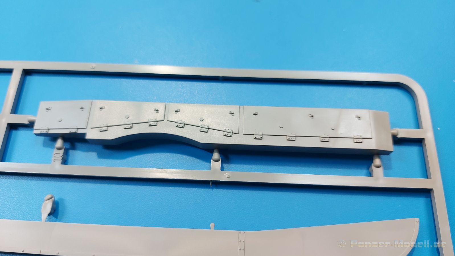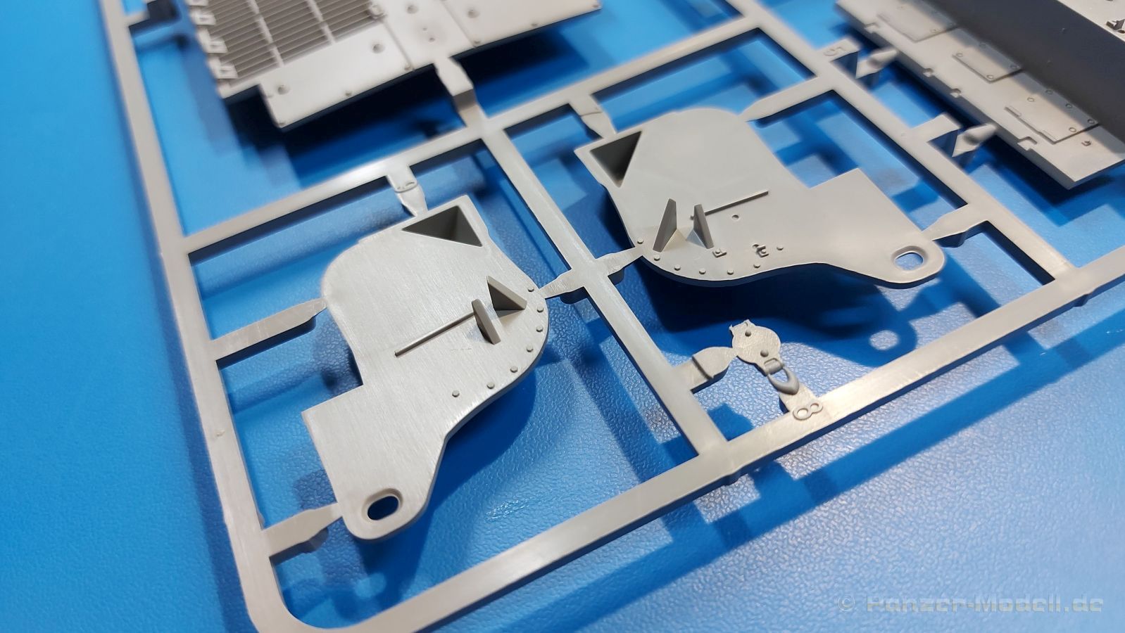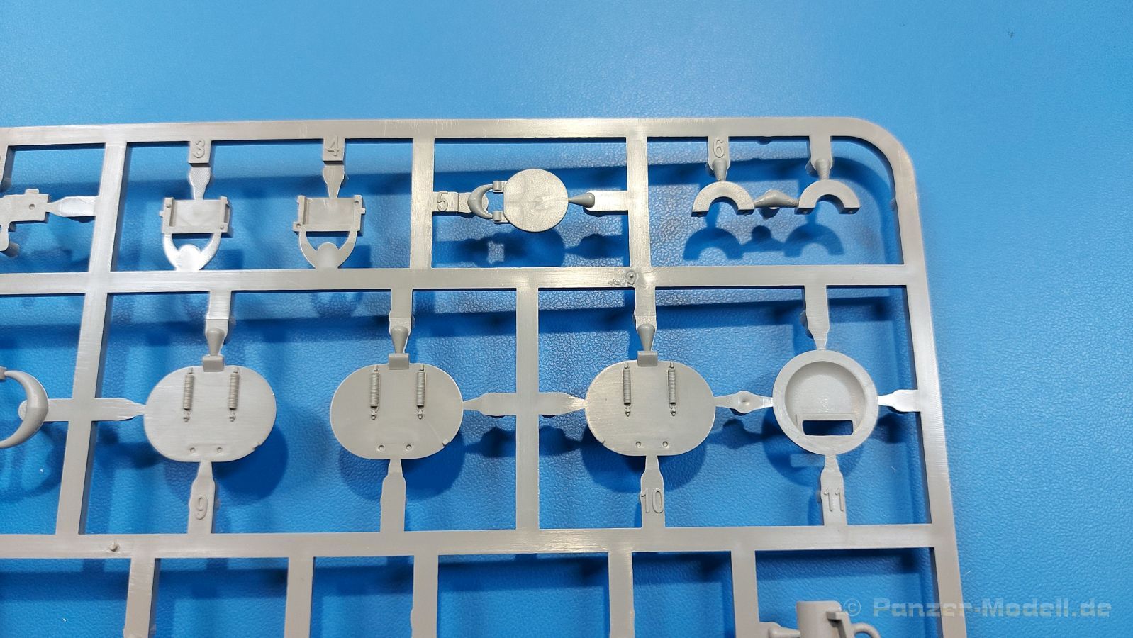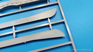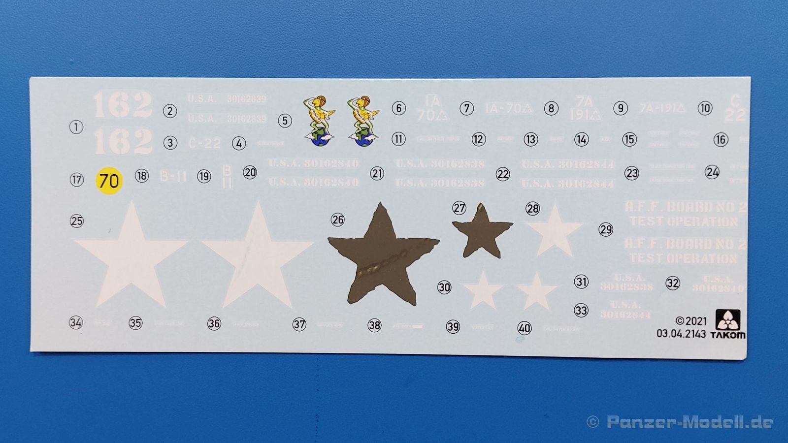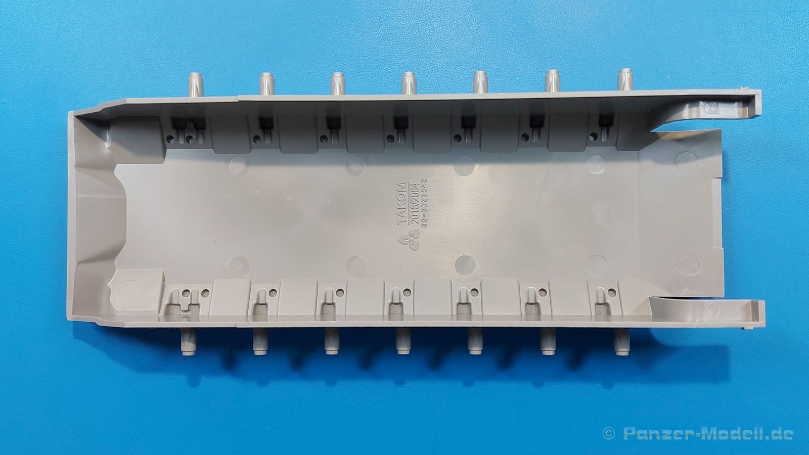 Der Bausatz: 2017 kam TAKOM mit seinen ersten T29/30/34 Modellen heraus. Nun folgt der Vorläufer dieser, also der eigentliche T29. Wir finden im 380 x 250 x 85 mm großen Karton 8 hellgraue Spritzlinge, 1 Klarsichtspritzling, die Unterwanne, Turmoberteil, 1 Draht und 1 Decalbogen. Dazu kommt eine 18-seitige Bauanleitung im A4 Querformat. Die Unterwanne ist einteilig und weist bereits viele, feine, saubere Details wie Wartungsdeckel und die Aufnahmen der Laufwerkskomponenten auf. Die Metallstruktur ist gut wiedergegeben. Die runden Notausstiegsluken der Wannenbesatzung sind separat anzubringen. Die Laufwerkskomponenten bestehen aus 6 Stoßdämpfern pro Seite, Endanschlägen der Schwingarme, den Schwingarmen selbst, den Leitrollenachsen und den Seitenvorgelegegehäusen mit den Antriebsradachsen. Es gibt pro Seite 8 Laufrollen- und 7 Stützrollenpaare. Die Leitrollenpaare sind die gleichen wie die Laufrollen. Die Antriebsräder bestehen aus den äußeren Zahnrädern und zwei Innenscheiben zur Führung der Mitteführungszähne der Kette. Bei allen Rädern sind die Verschraubungen gut und deutlich wiedergegeben. Die Ketten (Typ T80E3) bestehen aus verschieden langen Segmenten und einigen Einzelgliedern. Die Detaillierung ist sehr gut und sauber, insbesondere bei den Kettenführungszähnen und Endverbindern. Auf den Ketteninnenseiten finden sich einige Auswerferspuren - auf jedem Einzelglied zwei, bei den Segmenten alle drei Glieder zwei. Sie sind flach und werden leicht zu entfernen sein, aber es stört mich trotzdem in der heutigen Zeit. Die Oberwanne besteht aus dem Bugteil mit der vorderen Hälfte des Turmdrehkranzes und dem Motordeck mit der hinteren Hälfte des Drehkranzes. Das Bugteil ist aus meiner Sicht schön und die Gußstruktur glaubhaft wiedergegeben. Das Bug-MG mit Kugelblende zeigt einen gelochten Kühlmantel, aber keine Mündungsöffnung. Bei vorsichtigem Umgang mit Klebstoff sollte man das MG beweglich einbauen können. Je zwei Hebeösen, zwei Augen samt Schäkeln und zwei Ersatzkettengliedhalterungen mit angegossenen Kettengliedern finden Platz auf der Bugplatte. Auch die Scheinwerfergruppen (Fahr-, Tarnscheinwerfer) kommen auf die Bugplatte. Die Scheinwerfer sind innen hohl und bekommen Klarsichtgläser. Die Schutzbügel werden teils mit der Bugplatte, teils mit den Kettenblechen verbunden. Die beiden Wannenluken sind beidseitig detailliert. Innen wird je ein Griff angebracht. Wahlweise können Winkelspiegel aus Klarsichtmaterial mit separaten Deckeln eingebaut werden oder man schließt die Öffnungen nur mit den Deckeln. Das Motordeck zeigt schön die scharfen Kanten der Grätings. Die gepanzerten Deckel der Motorflüssigkeiten werden separat angebracht. Das Heckteil besteht aus zwei Seitenteilen, an die dann die Seitenvorgelegegehäuse angebaut werden und dem gewinkelten Heckteil. Es werden angebaut: zwei Schleppaugen ohne Schäkel, eine Halterung für eine Anhängekupplung (ohne die Kupplung selbst), zwei Rücklichter und deren Schutzbügel, ein kleiner Staukasten, eine Außenbordsprechanlage(?) und eine Kanisterhalterung(?). Auch die Rohrzurrung wird angebaut. Sie bleibt beweglich. Man könnte also in Transportstellung den Turm nach hinten gedreht mit Rohr in der angehobenen Rohrzurrung darstellen, aber die Bauanleitung geht nicht weiter darauf ein. Die großen Kettenbleche sind bereits mit Schraubenköpfen und Versteifungsrippen versehen. Hinten muss nur noch das gerundete Abschlussteil angebracht werden. Beidseitig werden große Staukästen, bestehend aus Ober- und Seitenteil werden aufgesetzt. Die Staukastenklappen bekommen noch zwei oder drei Verriegelungsgriffe. Große, zylinderförmige Auspufftöpfe setzt man auf die Kettenbleche. Sie sind längs zweigeteilt, aber dafür ist das Endrohr dann hohl. Ein kleiner Stutzen verbindet die Töpfe mit der Wanne. Die Abschleppseile aus fein verdrilltem Draht werden mit den Kauschen aus Plastik verbunden und größtenteils auf den Kettenblechen angebracht. Die vorderen Enden reichen dann über Kreuz zu den Schäkeln an der Bugseite. Vorn auf das rechte Kettenblech setzt man die feine Hupe mit ihrem Schutzbügel. Auf dem linken Kettenblech findet das ganze Pionierwerkzeug seinen Platz. Es besteht aus Axt, Spitzhacke, Hackenstiel, Vorschlaghammer, Schaufel und Brechstange. Dazu kommt ein MG-Dreibein im Überzug. Seitliche Kettenbleche sind mit ihren Aufteilungen und Verschraubungen dargestellt. Der Turm ist riesig und besteht aus Unter- und Oberteil. Hier sind neben der Gussstruktur auch die Gussnummern zu erwähnen. Es sind ovale Öffnungen für die Richt-/Ladeschützenluken und eine runde für die Kommandantenluke vorhanden. Auch die ovalen Luken sind beidseitig detailliert. Auffällig sind hier die feinen Spiralfedern außen. Die Kommandantenkuppel besteht im Bereich der Sichtöffnungen dankenswerterweise aus Klarsichtmaterial. Der Lukendeckel kann beweglich angebaut werden. Hier hat man die Wahl, ob man den Winkelspiegel einbaut oder die Öffnung nur mit dem Deckel verschließt. Auf dem Turm bringt man noch zwei Antennenfüße, ein großes Lüftergehäuse, Verriegelungen für die ovalen Luken, Grobvisier für den Kommandanten und ein cal. 50 MG samt Gurtkasten und Halterung an. Das MG mit separatem Deckel, Abfeuerungsgriff, Kühlmantel und Halterung ist schon sehr schön, aber der besondere Hingucker ist die Rohrstütze. Hier braucht man kein PE-Teil, so fein ist sie gestaltet. Der Turm bekommt seitlich noch je zwei Hebeösen und weitere Halterungen ohne Inhalt. Rechtsseitig wird eine Ladeluke in die Öffnung gesetzt. Die Turmheckplatte wird mit den Transporthalterungen für das cal. 50 MG versehen. Bei Rohr und Blende kann man wieder wählen - eine bewegliche Blende mit Gussstruktur und glattem Rohr oder eine starre Blende mit Blendenplane und Rohr mit Plane zur Blende hin. Die Rohre sind leider längs in Hälften geteilt, ebenso die Mündungsbremse, dafür gibt es aber durchbrochene Mündungseinsätze. Verwendet man die B
