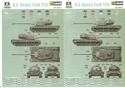 Das Original: Um im 2. Weltkrieg den deutschen Tigern und Panthern einen ebenbürtigen Panzer entgegenzustellen, entwickelten die Amerikaner den T26. Bei Erreichen der Einsatzfähigkeit gab es aber bereits den Tiger B (Königstiger), so dass die Entwicklung weiterging. Man entwickelte mehrere 78 Tonnen Panzer, die aber vor Ende des Krieges nicht mehr fertiggestellt wurden. Dennoch stellte man diese Prototypen fertig und testete sie ausführlich. Der T29 basierte auf einem verlängerten Fahrgestell des M26 Pershing, so dass er 8 Laufrollenpaare und 7 Stützrollen aufwies. Die T80E3 Kette war eigentlich eine T26E1 Kette mit Endverbinderverlängerungen. Sein Gewicht von ca. 65 to. wurde von einem flüssigkeitsgekühlten 770 PS Motor bewegt. Damit konnte er eine Geschwindigkeit von um die 35 km/h erreichen. Die Bewaffnung bestand aus einer 105 mm Kanone, zwei koaxialen cal. 50 MGs und einem weiteren auf dem Turm, sowie einem cal. 30 Bug-MG. Fahrer, Beifahrer, ein Richt-, zwei Ladeschützen und der Kommandant bildeten die Besatzung. Obwohl er selbst nicht über das Prototyp-Stadium hinauskam, flossen die gewonnenen Erkenntnisse seiner Weiterentwicklungen in die Entwicklung des M103 ein. Einige der Prototypen sind noch heute in US-amerikanischen Museen zu betrachten.