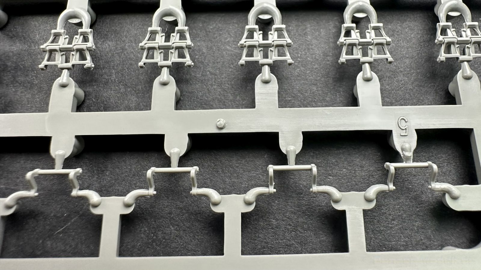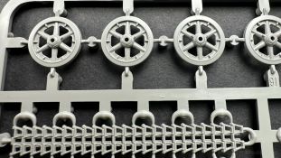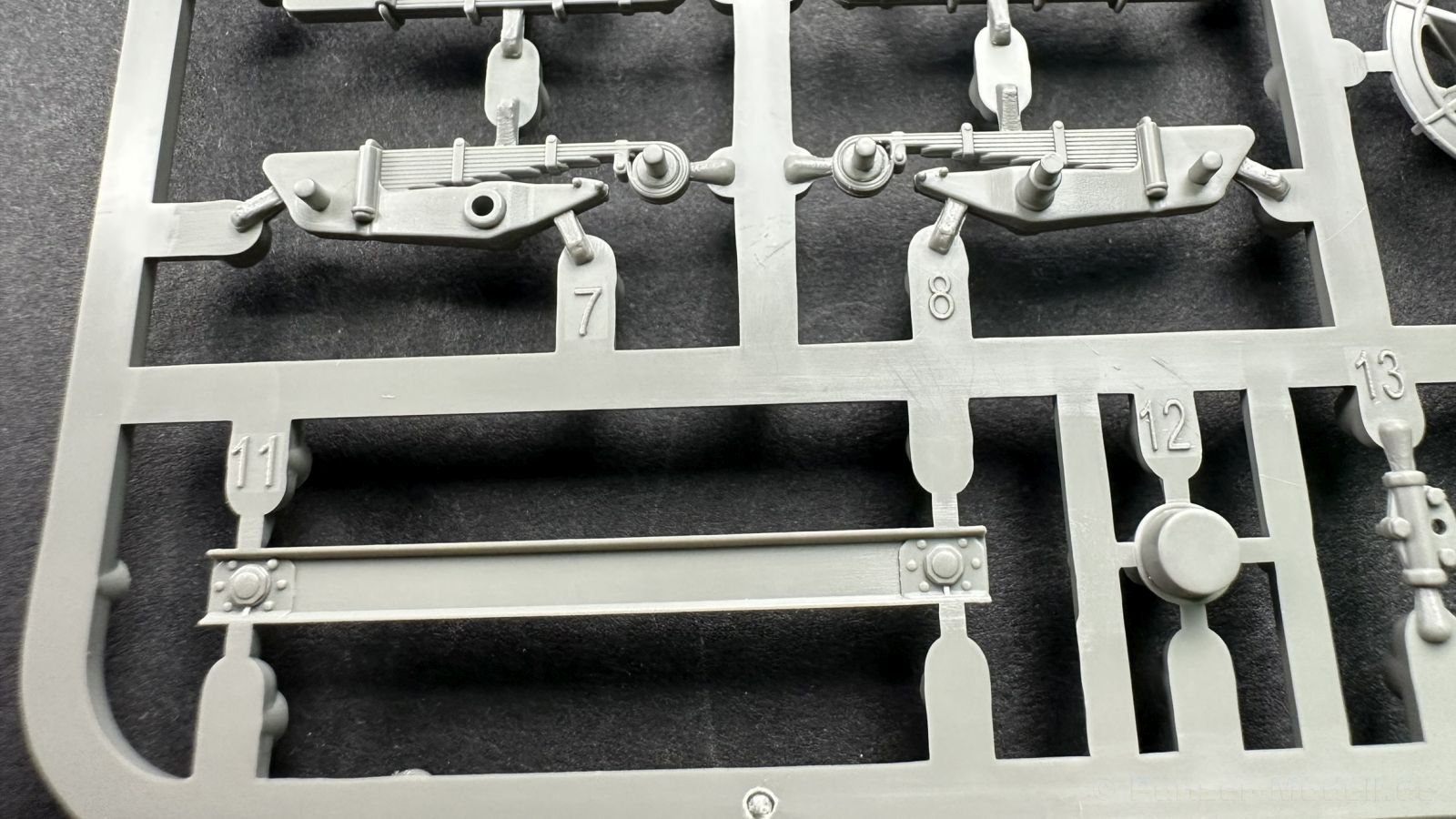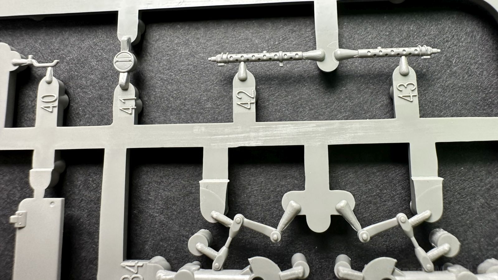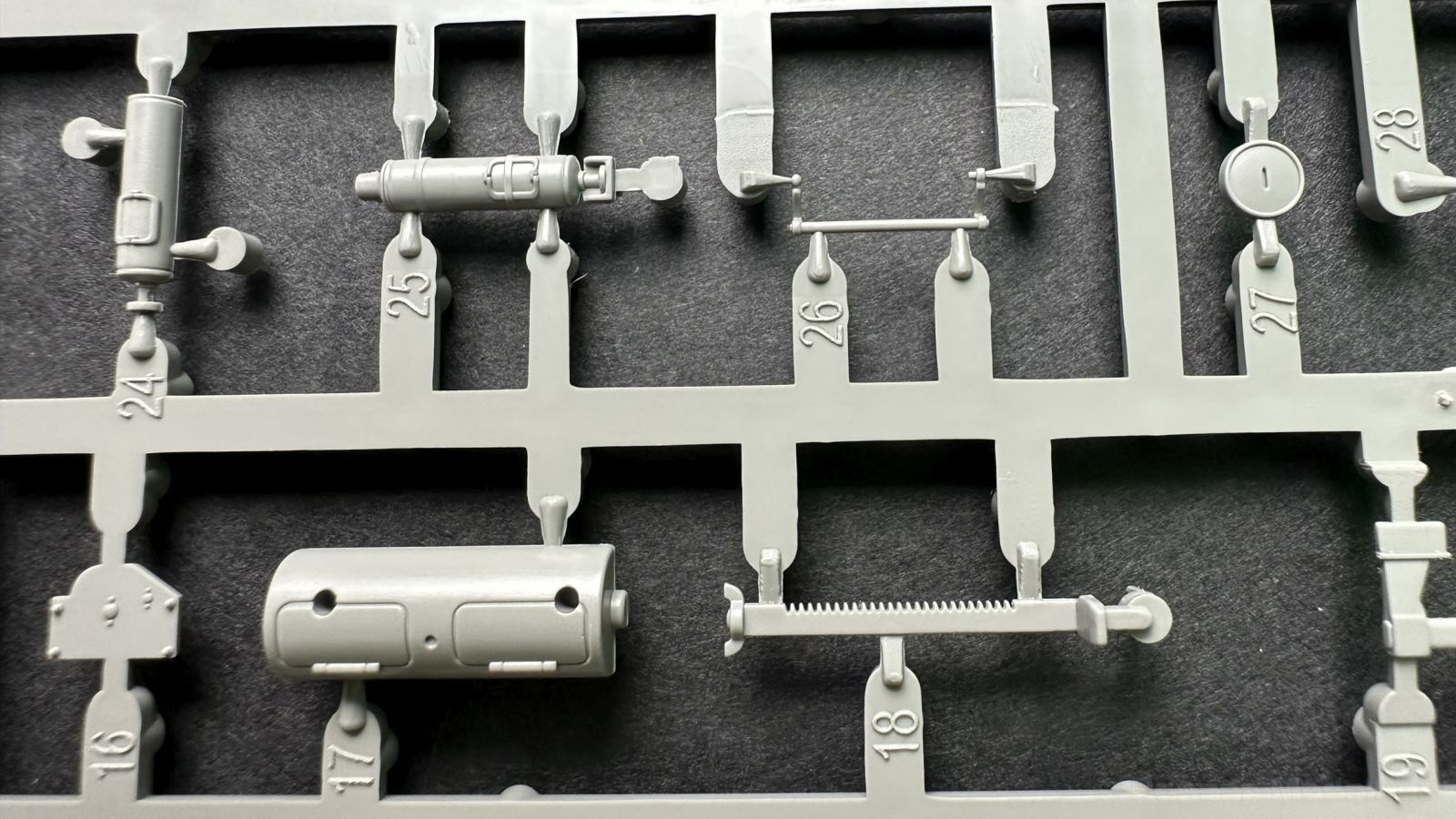 Die beiden Ätzteileplatinen umfassen die Distanzringe der Laufrollen und den Schutz für den Auspuff. Die Ketten sind in Segmentbauweise ausgeführt, was für die sehr feinen und kleinen Ketten des Panzer I natürlich absolut von Vorteil ist. Laufrollenhalter sowie das Spannrad runden den Spritzling B ab. Was mich immer wieder absolut verblüfft, ist die absolute Schärfe der Details, die Takom hier bietet! Auf Spritzling A (der eher wie ein V aussieht) finden wir die restlichen Kettensegmente sowie die Laufrollen, das Antriebsrad und Co. Auch hier gibt es viele Details! Erfreulich ist auch, dass die Stützlaufrollen auf den Gummibandagen über Herstellerangaben verfügen! Spritzling E enthält die Kettenbleche, die im Slide-Mold-Verfahren hergestellt wurden, und weitere Anbauteile. Die Werkzeuge sind mit Halterungen gespritzt. Diese würde ich allerdings austauschen, da sie keinen guten Eindruck hinterlassen. Der letzte Spritzling beinhaltet den Turm und weitere Anbauteile. Auch hier finden wir feinste Gravuren und auf der Oberseite viele Bauteile, die im Slide-Mold-Verfahren hergestellt wurden und mit seitlichen Details glänzen können. Der Turm, die Ober- und Unterwanne sind jeweils separate Bauteile. Besonders hervorheben möchte ich die toll gemachten Schweißnähte und die Schraubenköpfe. Hier erkennt man sogar den Schlitz der Schlitzschraube! Ein Kupferseil für das Abschleppseil liegt bei. Abgerundet wird der Bausatz durch insgesamt 4 Decaloptionen, die sich wie folgt gliedern: