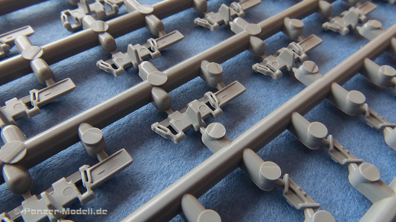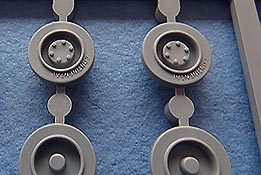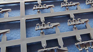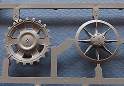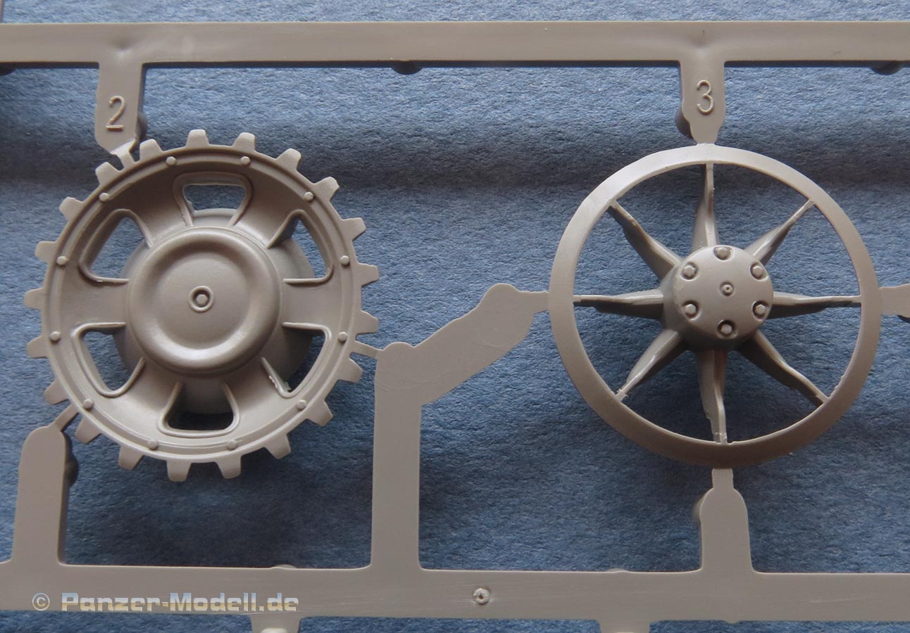 Die Laufrollen, wie auch Treib- und Leiträder sind sehr gut und mit feinen Details gespritzt. Die Laufrollen sitzen an je 2 Angüssen, was das Heraustrennen relativ angehem macht. Die Qualität der Doppellaufrollen ist sensationell. Tolle, saubere Details, insbesondere die unterschiedlichen Stufen der Felgen, die abgesetzte Gummierung, welche mit sehr feinem "Continental" Schriftzug daherkommt. Leider ist das die einzige Detaillierung der Gummierung. Auch an den Stützrollengummis findet sich der feine Schriftzug des Herstellers.