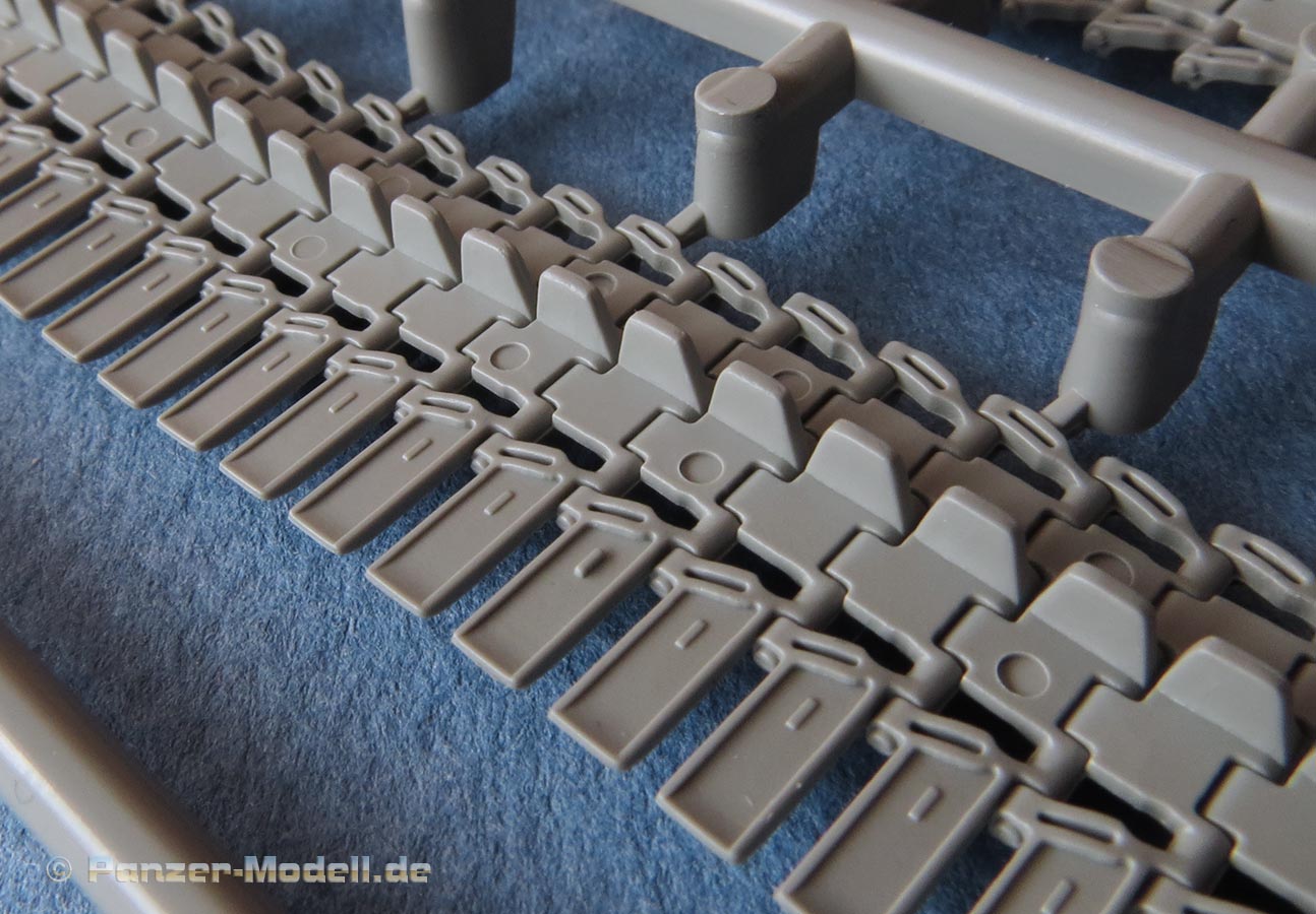 Die Qualität der Ketten ist gut, sauber und fein detailliert. Leider zeigen sich im vorliegenden Muster auf der Innenseite der Segmentstränge doch die ein oder andere markante Auswerfermarke - das ist ein bisschen schade, da Takom schon gezeigt hat, dass es auch ohne geht! Sekbst auf den Einzelgliedern sind auf der Innenseite Auswerfermarken zu sehen.