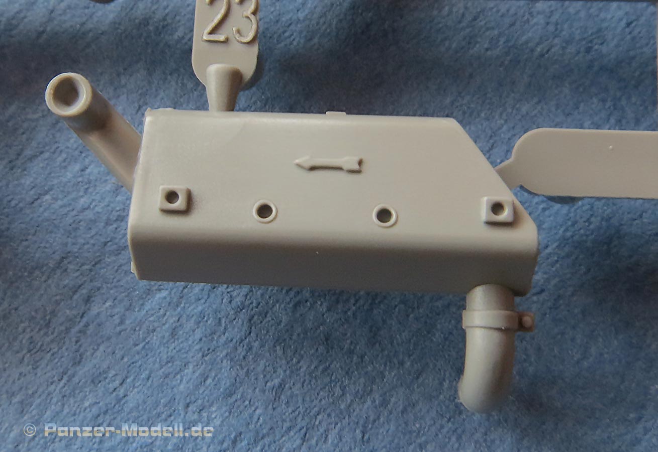 Die Heckplatte weist alle richtigen Details auf, die auch fein dargestellt sind. Die Auspufftöpfe sind die Standardausführung und das Luftauslassgitter liegt ebenfalls als PE Teil bei.