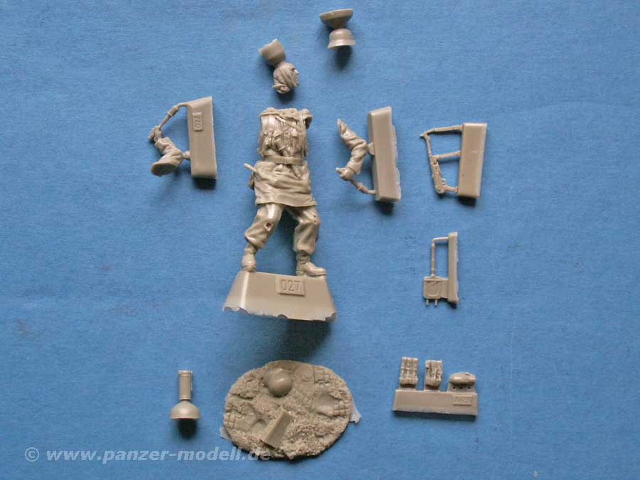 Die Figur als solche ist bereits nahezu komplett gegossen, nur Arme, Kopf und das Zubehör müssen angeklebt werden. Als kleine Basis ist ein Stück Boden dargestellt mit eingesunkenem Helm und Mgazinkoffer. Eine Bauanleitung gibt es nicht - als Vorlage gibt es das farbige Deckelbild einer fertigen und bemalten Figur.