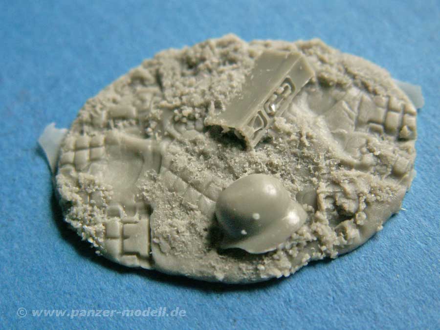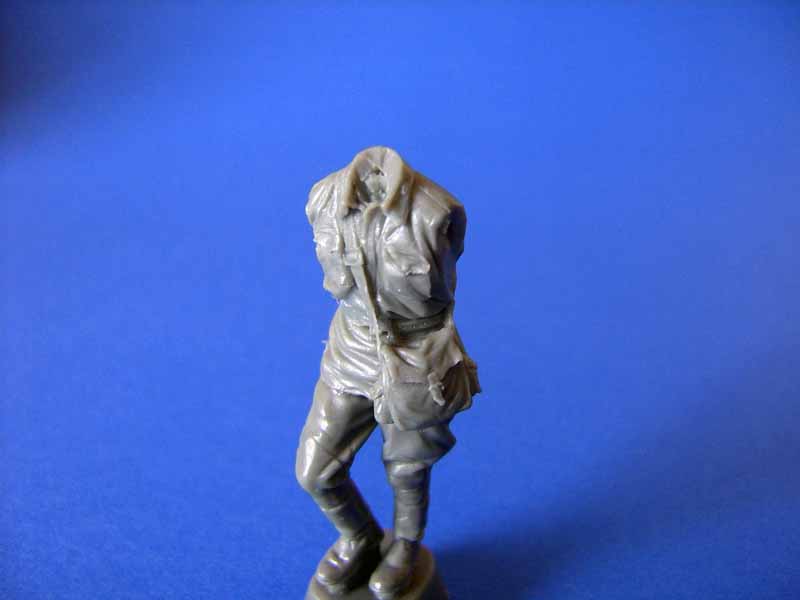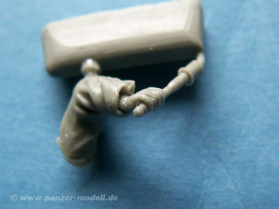 Die Qualität der Resinteile ist mit das Beste an Details, was ich je gesehen habe. Feinst gestalteter Faltenwurf der Uniform, klar abgehobene Details mit Hinterschneidungen, wie z.B. der Gürtel mit eingesteckter Stielhandgranate, superdetailierte Stiefel. Auch das Gesicht und die Hände sind vom allerfeinsten. An Zubehör für die Figur gibt es ebenso genial detailierte Teile, wie einen Rucksack, eine MP, Magazintaschen und ein Steigeisen.