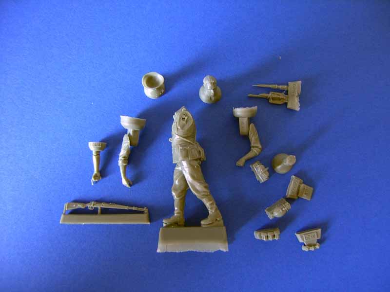 Die Figur besteht aus insgesamt 8 Bauteilen aus hellgrauem Resin in sehr guter Guss- und Verarbeitungsqualität. Ein alternativer linker Arm lässt unterschiedliche Körperhaltungen zu. Der Soldat könnte angelehnt an einen Panzer oder auch, seinen Helm mit der linken Hand hochschiebend, gebaut werden. Ein AK Sturmgewehr sowie eine kleine Base aus Resin runden die Figur ab. Die Körperhaltung wirkt sehr realistisch, die Bekleidung und deren Faltenwurf sind sehr gelungen gestaltet und weisen viele feine Details auf.