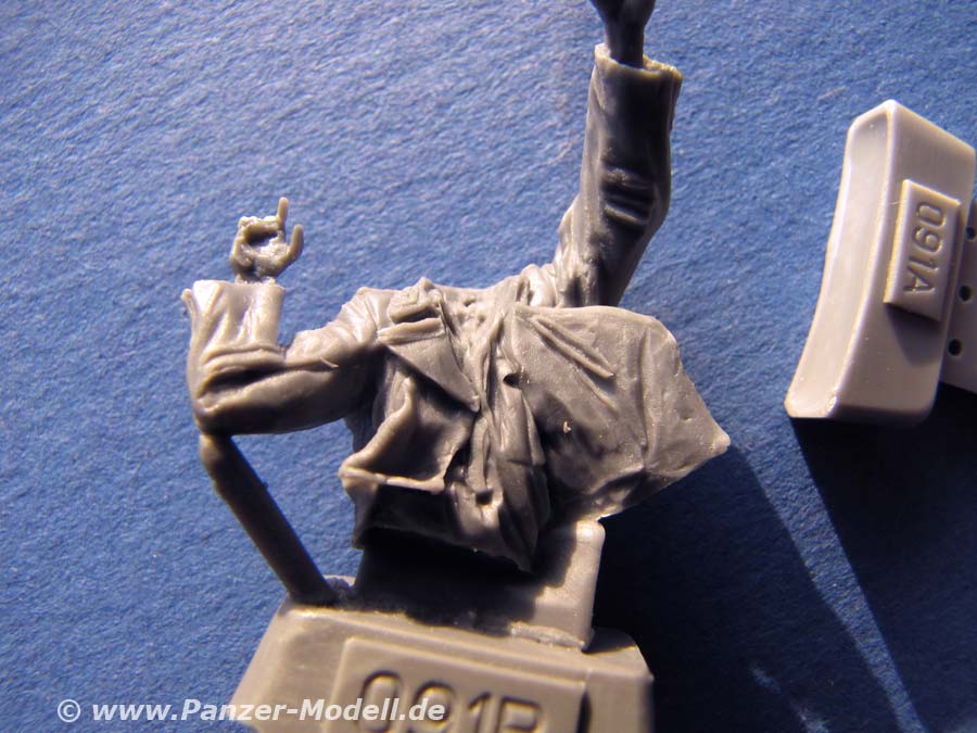Die Qualität ist gut, wennauch der Guss des mir vorliegenden Sets ein wenig unsauber erscheint und man hie rund da kleine Resinfussel entfernen muss. Die Kommandantenfigur wirkt ein bisschen ohne Hals, was aber aus der Haltung mit dem gestreckten Arm resuktieren kann. Die Details sind schön gemacht und interessanterweise liegt noch ein weitere Kopf mit anderer Kopfbedekung bei - nur sind die Köpfe beider Figuren bereits angegossen - d.h. hier muss notfalls die Säge ran, wenn man den anderen Kopf verwenden will.