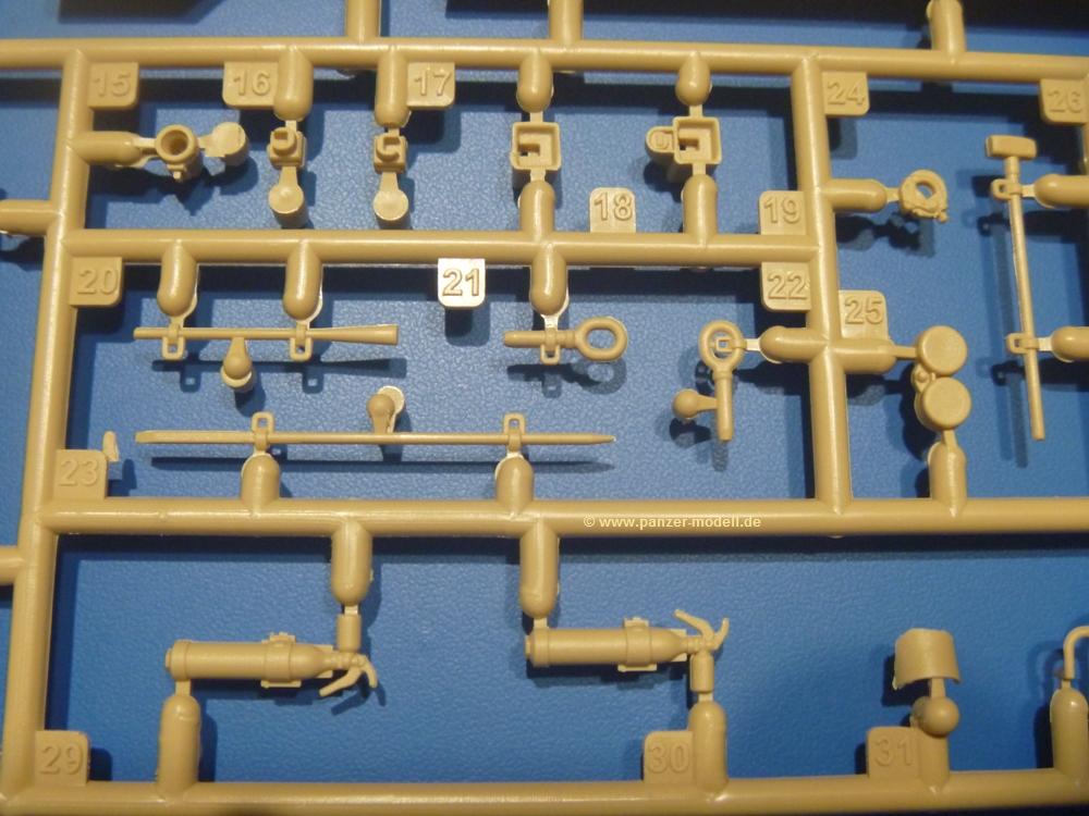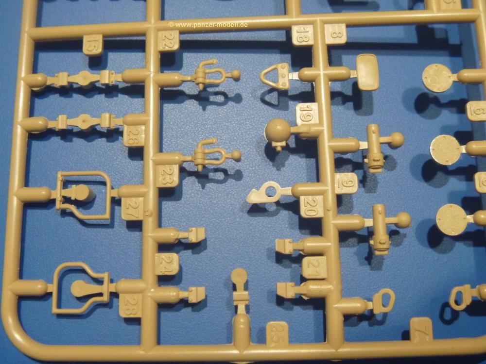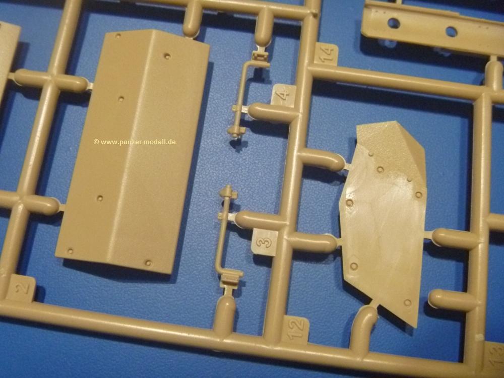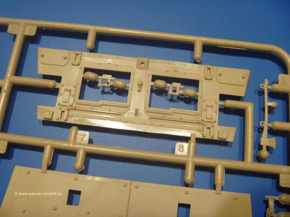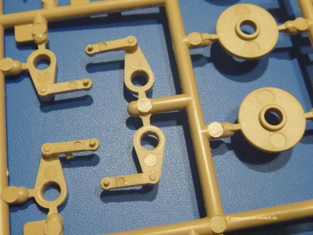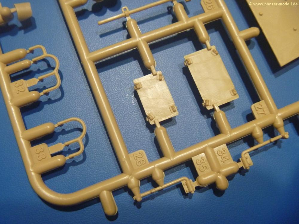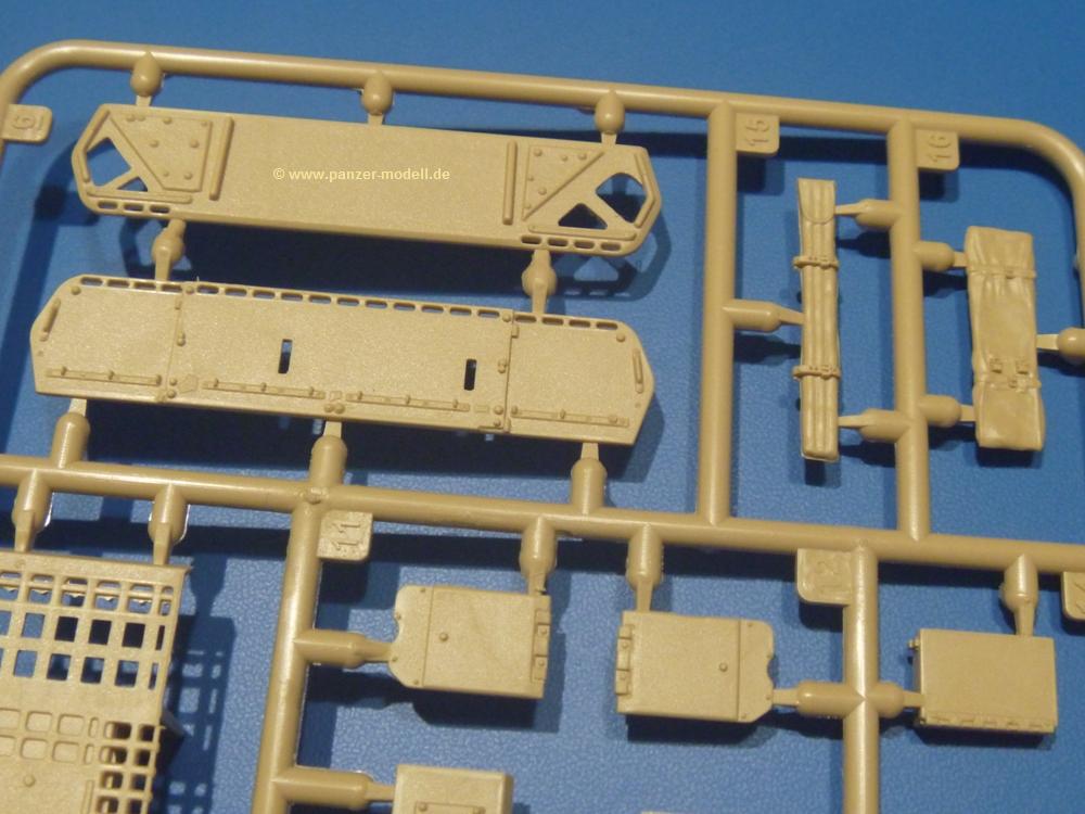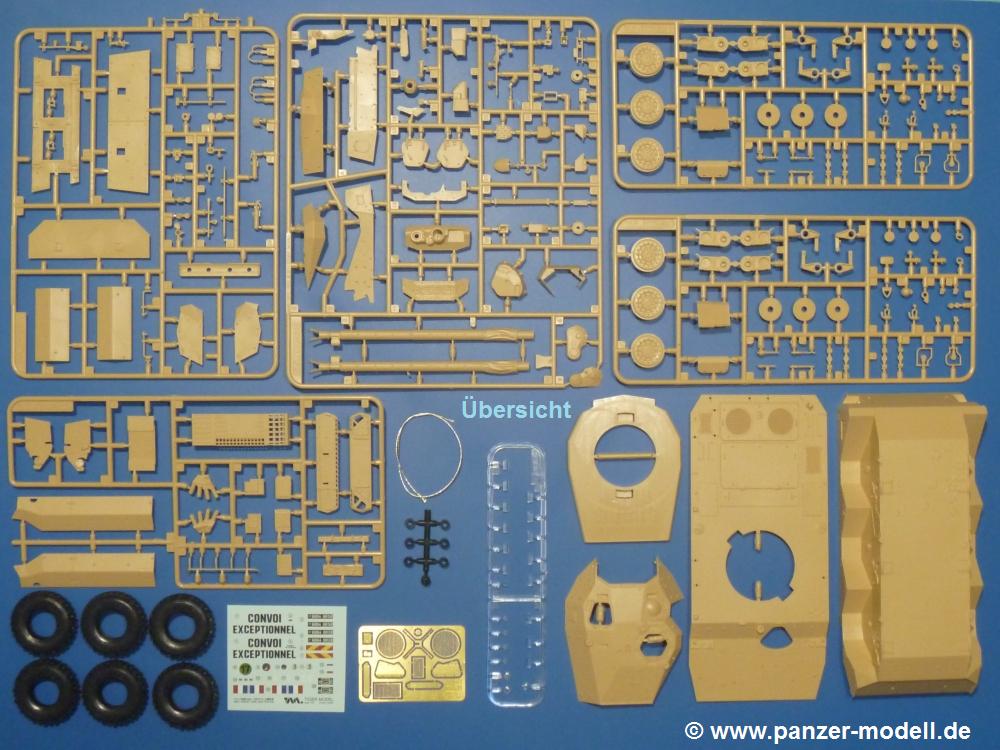 Die Teile aus sandgelbem Plastik sind sauber gespritzt, ohne Verzug und Versatz, hier und da minimaler Grat, keine Fischhäute. Auswerferspuren sind kaum zu sehen und meist an Stellen, wo man sie nach dem Zusammenbau nicht mehr sieht.Der AMX-10 ist ein recht kompaktes Fahrzeug. Die Wanne, die ihrem Namen alle Ehre macht, wird mit der Deckplatte verschlossen, dann hält man schon die Hauptkomponente in der Hand. Das Fahrwerk besteht aus Schwingarmen und Stellhebeln. In die, mit je 50 Schraubenköpfen/Muttern übersäten, Felgen werden Vinylmuffen eingepasst, so dass die Räder drehbar bleiben. Die schönen Reifen (aus Vinyl) mit Michelin und Größenaufdruck werden einfach auf die Felgen geschoben. Für die Lufteinlässe auf dem Heck stehen PE-Gitter zur Verfügung. Auf dem Heck finden sich Werkzeuge wie Vorschlaghammer, Brechstange, Spitzhakenstiel und auch das aus Draht geflochtene Abschleppseil wird hier befestigt. Die Fahrscheinwerfer sind hohl und bekommen Gläser aus geriffeltem Klarsichtmaterial. Die Blinker, Tarn- und Rückleuchten bestehen aus Klarsichtmaterial, ebenso wie die Winkelspiegel der Fahrerluke. Links und rechts der Fahrerluke befinden sich die Feuerlöscher. Bei den Fahrerspiegeln hat man die Wahl zwischen ausgeklappten (Fahrstellung) und eingeklappten (Einsatzstellung) Halterungen. Bug- und Wannenseiten bekommen die für die RCR typischen Abstandspanzerungen. Die oberen Abstandshalter (14 an der Zahl) wollen separat angeklebt werden.Die 105mm Kanone besteht aus 2 hohlen Hälften, ist aber schön wiedergegeben inkl. Faltenwurf an der Rohrplane. Die Zieloptik in der Blende kann mit einem Deckel verschlossen oder offen und dann mit Klarsichtteil gebaut werden. Die Blende mit Rohr wird fest im Turm verklebt, so dass es nichts ausmacht, dass die Blendenplane aus festem Plastik besteht, welches eine Höhenrichtbarkeit sowieso verhindert hätte. Dafür ist der Faltenwurf gut gelungen. Auch der Turm erhält eine Abstandspanzerung, die auf der linken Turmseite einen Korb aus einem Stück erhält. Beim Kommandantenperiskop kommt eine Klarsichtlinse und eine PE-Schutzbügel zum Einsatz. Auch hier am Turm sind die Winkelspiegel aus Klarsichtplastik. Das MG wird in eine mehrteilige Waffenstation inkl. Hülsenabweiser aus PE und Hülsensack eingesetzt. Die beiden Nebelmittelwurfanlagen (je 1 Teil) besitzen eine PE-Abdeckung. Auf der linken Turmseite findet das Galix-Gerät seinen Platz. Eine erhebliche Verlängerung erfährt der Turm durch den Heckstaukasten/-korb.Es sind seidenmatt-glänzende Abziehbilder (Decals) für 2 Fahrzeuge dabei.