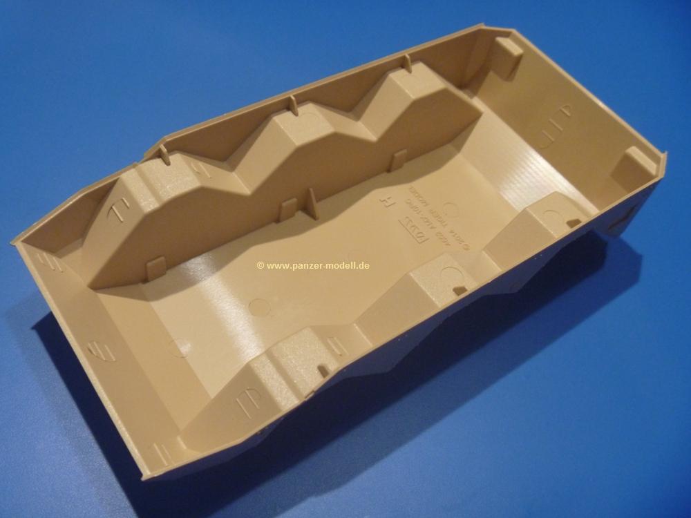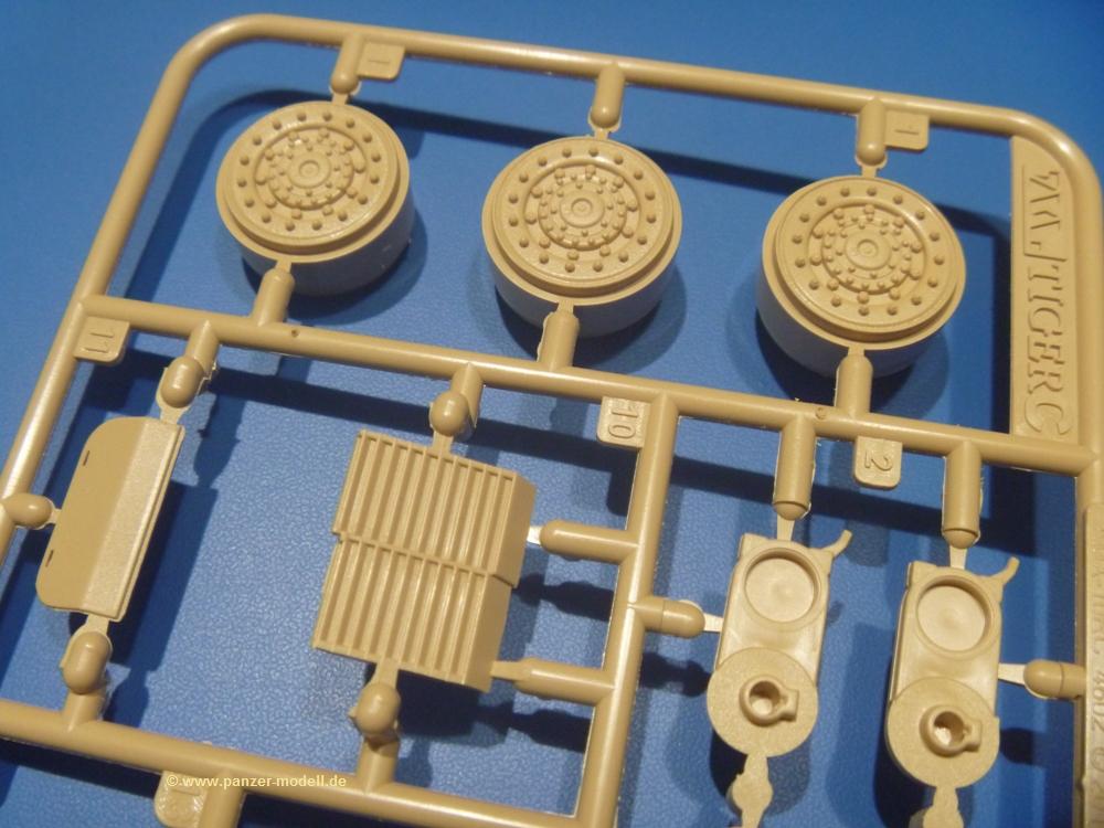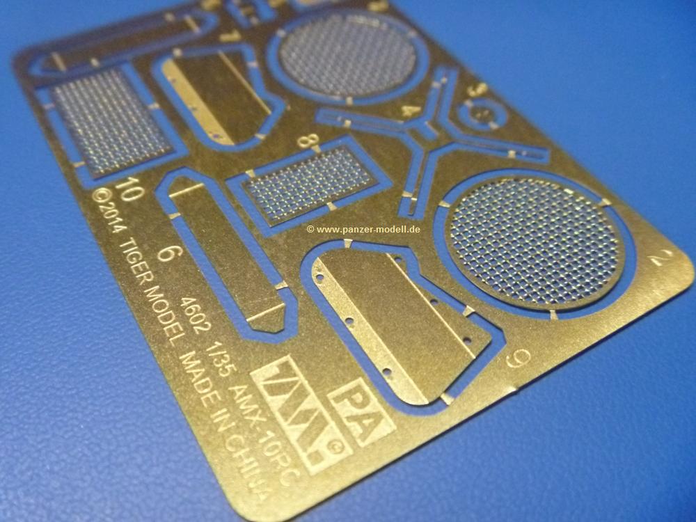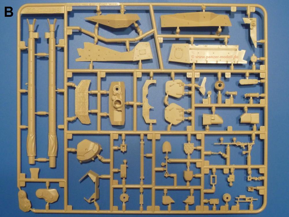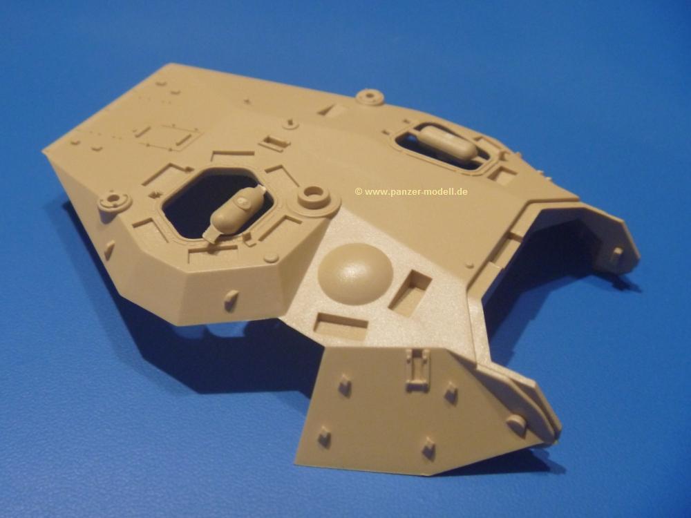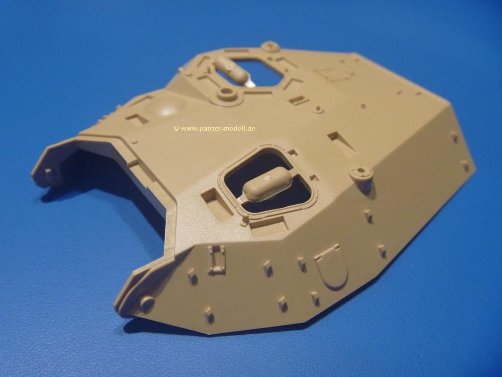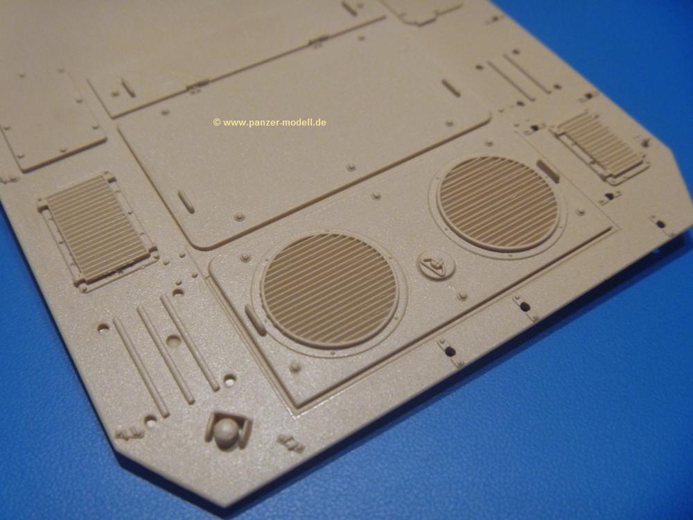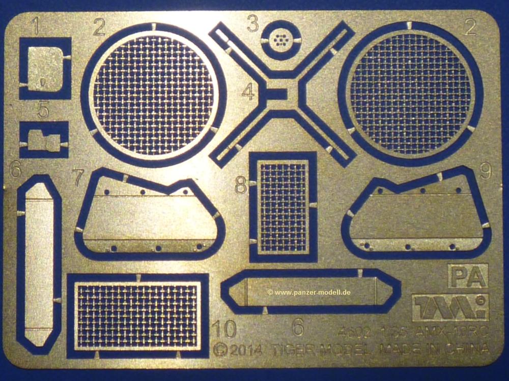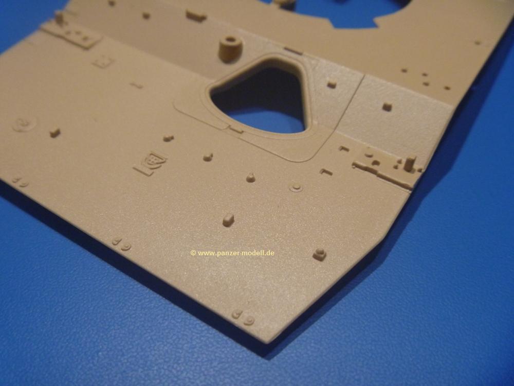 Die Teile aus sandgelbem Plastik sind sauber gespritzt, ohne Verzug und Versatz, hier und da minimaler Grat, keine Fischhäute. Auswerferspuren sind kaum zu sehen und meist an Stellen, wo man sie nach dem Zusammenbau nicht mehr sieht.Der AMX-10 ist ein recht kompaktes Fahrzeug. Die Wanne, die ihrem Namen alle Ehre macht, wird mit der Deckplatte verschlossen, dann hält man schon die Hauptkomponente in der Hand. Das Fahrwerk besteht aus Schwingarmen und Stellhebeln. In die, mit je 50 Schraubenköpfen/Muttern übersäten, Felgen werden Vinylmuffen eingepasst, so dass die Räder drehbar bleiben. Die schönen Reifen (aus Vinyl) mit Michelin und Größenaufdruck werden einfach auf die Felgen geschoben. Für die Lufteinlässe auf dem Heck stehen PE-Gitter zur Verfügung. Auf dem Heck finden sich Werkzeuge wie Vorschlaghammer, Brechstange, Spitzhakenstiel und auch das aus Draht geflochtene Abschleppseil wird hier befestigt. Die Fahrscheinwerfer sind hohl und bekommen Gläser aus geriffeltem Klarsichtmaterial. Die Blinker, Tarn- und Rückleuchten bestehen aus Klarsichtmaterial, ebenso wie die Winkelspiegel der Fahrerluke. Links und rechts der Fahrerluke befinden sich die Feuerlöscher. Bei den Fahrerspiegeln hat man die Wahl zwischen ausgeklappten (Fahrstellung) und eingeklappten (Einsatzstellung) Halterungen. Bug- und Wannenseiten bekommen die für die RCR typischen Abstandspanzerungen. Die oberen Abstandshalter (14 an der Zahl) wollen separat angeklebt werden.Die 105mm Kanone besteht aus 2 hohlen Hälften, ist aber schön wiedergegeben inkl. Faltenwurf an der Rohrplane. Die Zieloptik in der Blende kann mit einem Deckel verschlossen oder offen und dann mit Klarsichtteil gebaut werden. Die Blende mit Rohr wird fest im Turm verklebt, so dass es nichts ausmacht, dass die Blendenplane aus festem Plastik besteht, welches eine Höhenrichtbarkeit sowieso verhindert hätte. Dafür ist der Faltenwurf gut gelungen. Auch der Turm erhält eine Abstandspanzerung, die auf der linken Turmseite einen Korb aus einem Stück erhält. Beim Kommandantenperiskop kommt eine Klarsichtlinse und eine PE-Schutzbügel zum Einsatz. Auch hier am Turm sind die Winkelspiegel aus Klarsichtplastik. Das MG wird in eine mehrteilige Waffenstation inkl. Hülsenabweiser aus PE und Hülsensack eingesetzt. Die beiden Nebelmittelwurfanlagen (je 1 Teil) besitzen eine PE-Abdeckung. Auf der linken Turmseite findet das Galix-Gerät seinen Platz. Eine erhebliche Verlängerung erfährt der Turm durch den Heckstaukasten/-korb.Es sind seidenmatt-glänzende Abziehbilder (Decals) für 2 Fahrzeuge dabei.