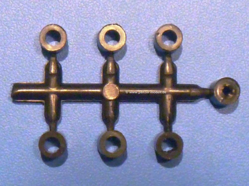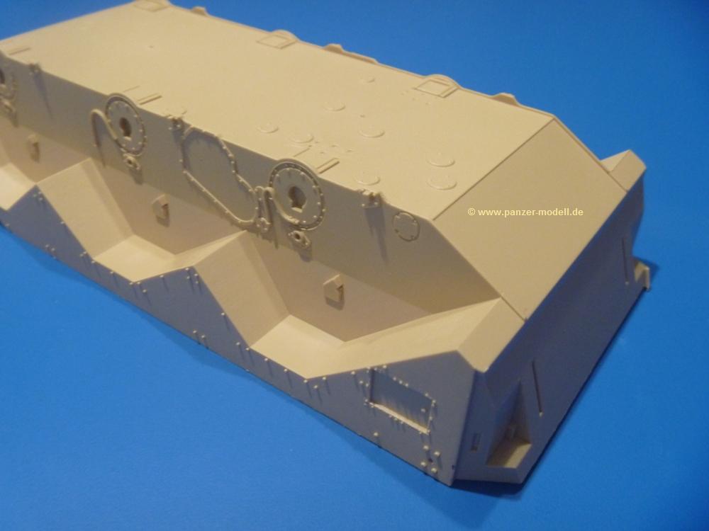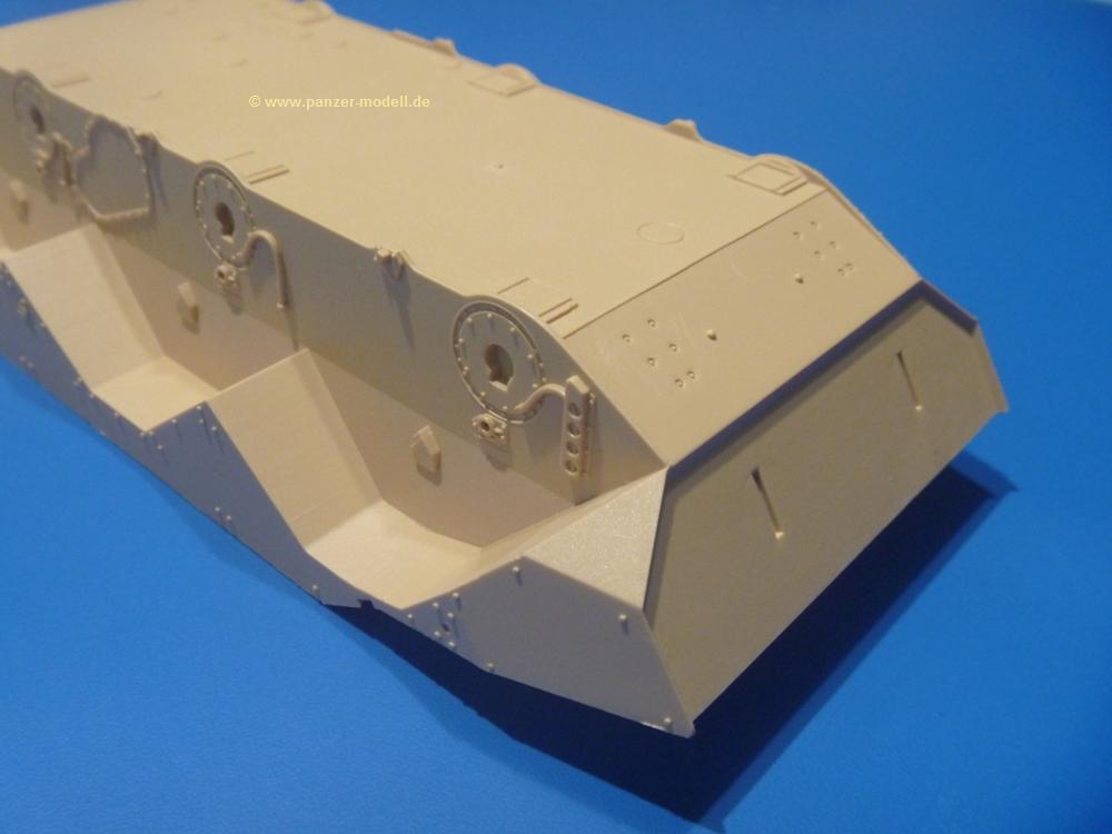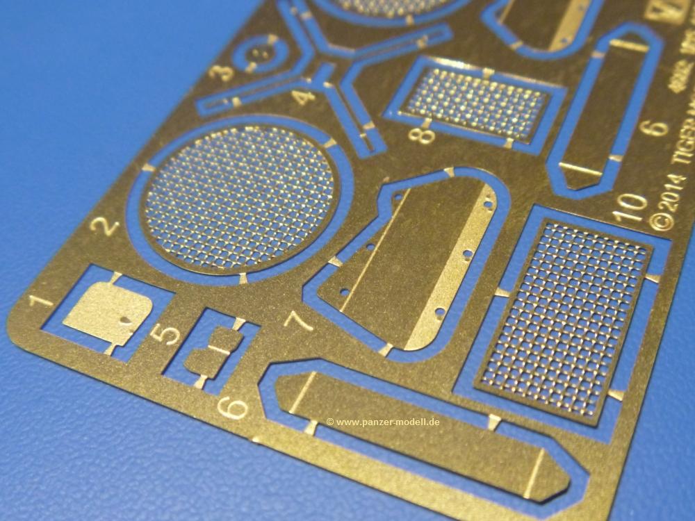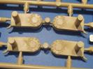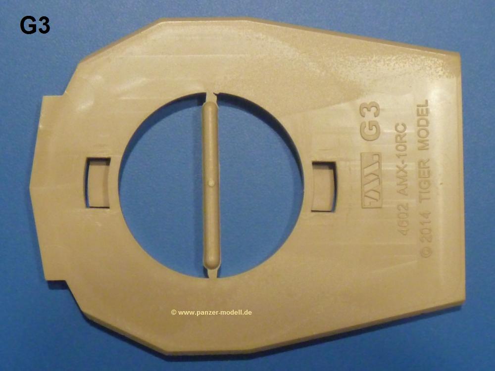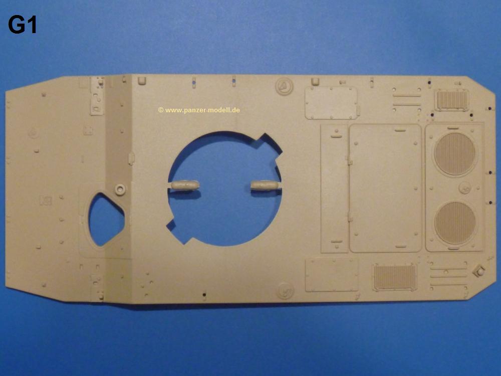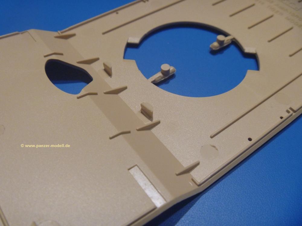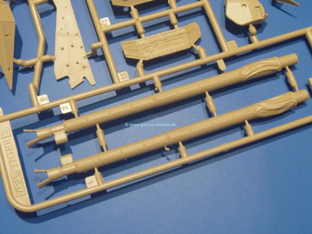 Die Teile aus sandgelbem Plastik sind sauber gespritzt, ohne Verzug und Versatz, hier und da minimaler Grat, keine Fischhäute. Auswerferspuren sind kaum zu sehen und meist an Stellen, wo man sie nach dem Zusammenbau nicht mehr sieht.Der AMX-10 ist ein recht kompaktes Fahrzeug. Die Wanne, die ihrem Namen alle Ehre macht, wird mit der Deckplatte verschlossen, dann hält man schon die Hauptkomponente in der Hand. Das Fahrwerk besteht aus Schwingarmen und Stellhebeln. In die, mit je 50 Schraubenköpfen/Muttern übersäten, Felgen werden Vinylmuffen eingepasst, so dass die Räder drehbar bleiben. Die schönen Reifen (aus Vinyl) mit Michelin und Größenaufdruck werden einfach auf die Felgen geschoben. Für die Lufteinlässe auf dem Heck stehen PE-Gitter zur Verfügung. Auf dem Heck finden sich Werkzeuge wie Vorschlaghammer, Brechstange, Spitzhakenstiel und auch das aus Draht geflochtene Abschleppseil wird hier befestigt. Die Fahrscheinwerfer sind hohl und bekommen Gläser aus geriffeltem Klarsichtmaterial. Die Blinker, Tarn- und Rückleuchten bestehen aus Klarsichtmaterial, ebenso wie die Winkelspiegel der Fahrerluke. Links und rechts der Fahrerluke befinden sich die Feuerlöscher. Bei den Fahrerspiegeln hat man die Wahl zwischen ausgeklappten (Fahrstellung) und eingeklappten (Einsatzstellung) Halterungen. Bug- und Wannenseiten bekommen die für die RCR typischen Abstandspanzerungen. Die oberen Abstandshalter (14 an der Zahl) wollen separat angeklebt werden.Die 105mm Kanone besteht aus 2 hohlen Hälften, ist aber schön wiedergegeben inkl. Faltenwurf an der Rohrplane. Die Zieloptik in der Blende kann mit einem Deckel verschlossen oder offen und dann mit Klarsichtteil gebaut werden. Die Blende mit Rohr wird fest im Turm verklebt, so dass es nichts ausmacht, dass die Blendenplane aus festem Plastik besteht, welches eine Höhenrichtbarkeit sowieso verhindert hätte. Dafür ist der Faltenwurf gut gelungen. Auch der Turm erhält eine Abstandspanzerung, die auf der linken Turmseite einen Korb aus einem Stück erhält. Beim Kommandantenperiskop kommt eine Klarsichtlinse und eine PE-Schutzbügel zum Einsatz. Auch hier am Turm sind die Winkelspiegel aus Klarsichtplastik. Das MG wird in eine mehrteilige Waffenstation inkl. Hülsenabweiser aus PE und Hülsensack eingesetzt. Die beiden Nebelmittelwurfanlagen (je 1 Teil) besitzen eine PE-Abdeckung. Auf der linken Turmseite findet das Galix-Gerät seinen Platz. Eine erhebliche Verlängerung erfährt der Turm durch den Heckstaukasten/-korb.Es sind seidenmatt-glänzende Abziehbilder (Decals) für 2 Fahrzeuge dabei.