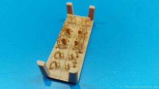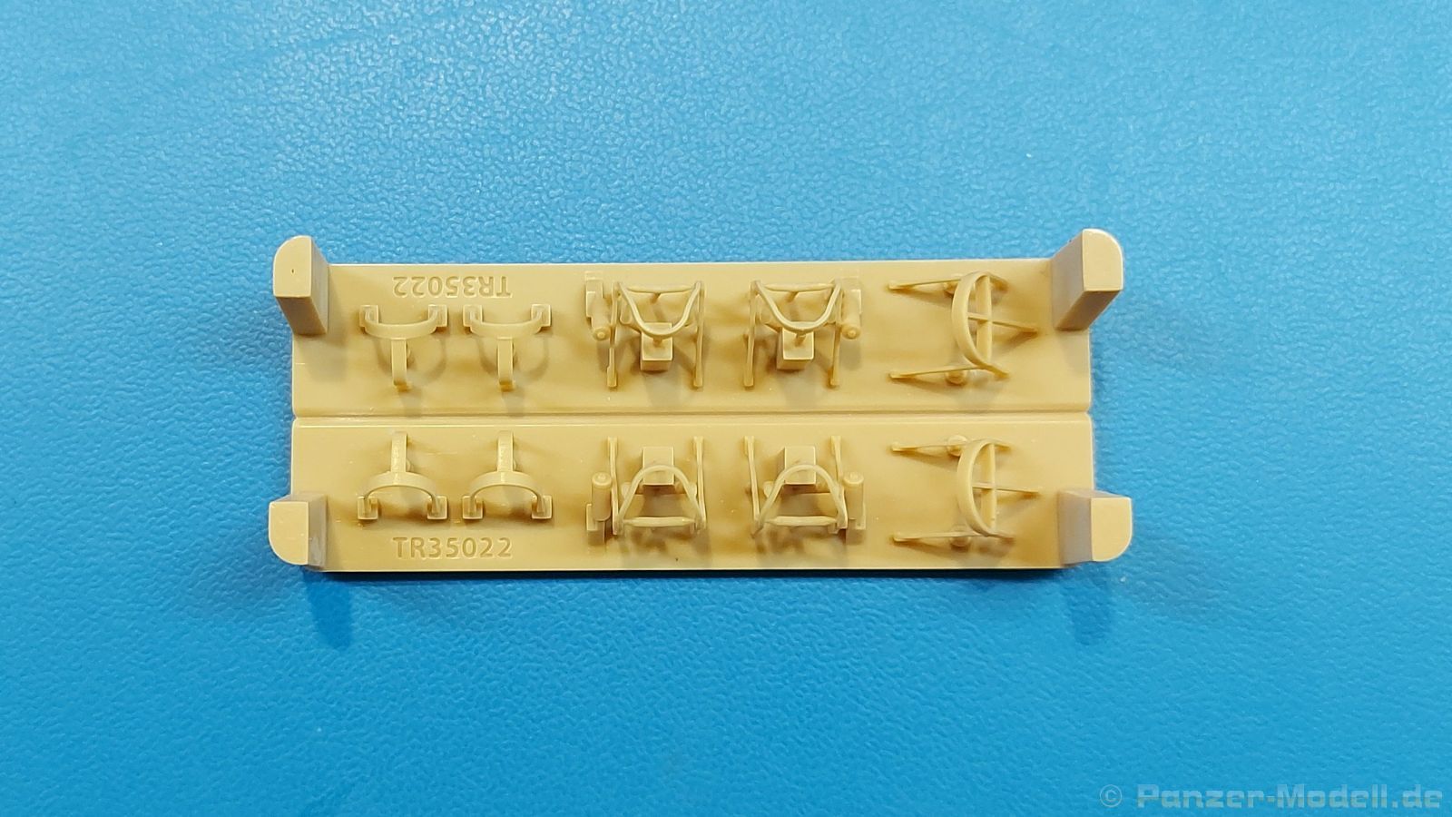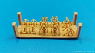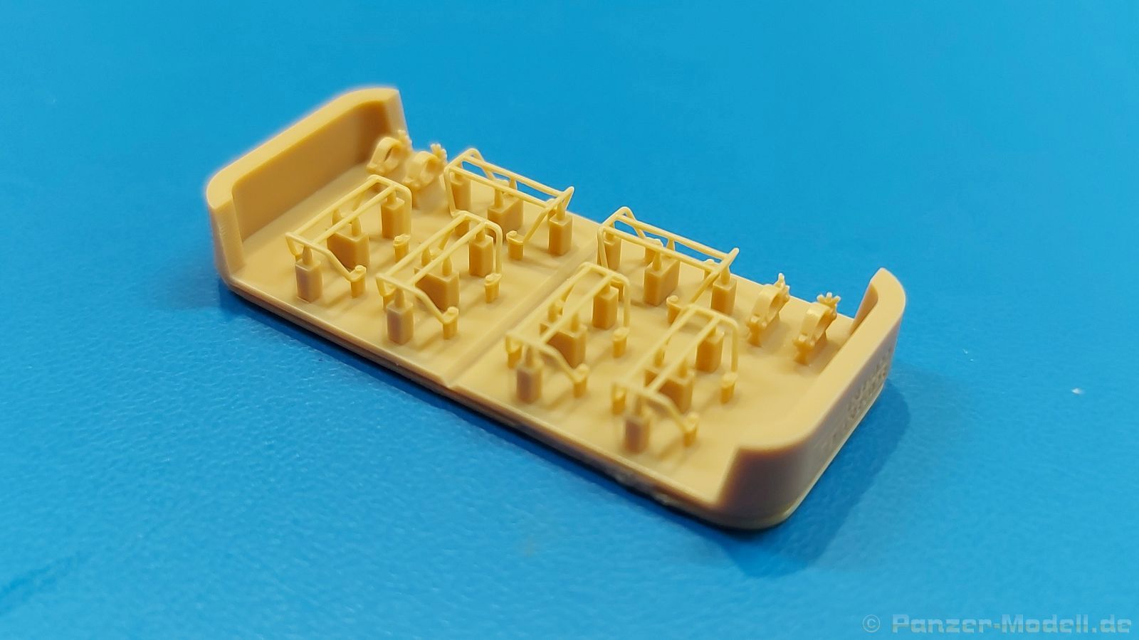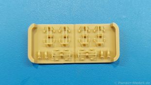 Typisch für viele U.S. amerikanische Panzer des zweiten Weltkrieges sind die Schutzbügel für Scheinwerfer und Winkelspiegel. Bei älteren Bausätzen fehlt manches davon, anderes wirkt in Plastik etwas klobig. Die 3D-Drucktechnik kann da Abhilfe schaffen und T-Rex Studio hat sich dem angenommen. Das Set enthält solches Material für einen (bzw. zwei) M4 Sherman mit geschweißter Wanne. In einem 70 x 70 x 40 mm großen Karton befindet sich eine 55 x 55 x 20 mm große Plastikschachtel mit zwei Druckbasen, die mit Schaumstoff voneinander getrennt und gegen Verrutschen gesichert sind. Die Druckbasen haben zum Schutz über die Höhe der Teile hinaus erhöhte Ecken. Wird die Verpackung geschüttelt oder sollte einem solch ein Teil mal aus der Hand rutschen, müssten schon Freitag, der 13-te, ein zerbrochener Spiegel und eine schwarze Katze zusammenkommen, dass etwas kaputt geht. Der Druck ist sehr gut - die Teile sind sehr filigran, sauber, fein detailliert und fehlerfrei. Die größere Druckbasis enthält die Schutzbügel für Frontscheinwerfer, Hupe und Rücklichter. Durch die Mitte verläuft eine Naht, so dass die Bügel für je ein Fahrzeug optisch voneinander getrennt sind. Die Materialstärke ist für den Maßstab sehr glaubhaft. Die feinen Schweißnähte sind an den Füßen angedruckt. Die Stützstrukturen und Verbindungspunkte sind sehr klein, aber man sollte die Bügel mit Geduld und Vorsicht abtrennen. Auf der kleineren Druckbasis findet man Schutzbügel für drei Winkelspiegel pro Panzer. Die Befestigungsschrauben auf den Füßen sind deutlich erkennbar und gut ausgeführt. Zusätzlich sind noch je zwei Abschleppseilhalterungen mit sehr feinen Flügelmuttern dabei. Das Gimmick hierbei - keine der Flügelmuttern befindet sich in der gleichen Stellung wie die anderen. Ein kleiner Zettel gibt Hinweise in Chinesisch und Englisch zum Arbeiten mit 3D-Druck Material, die man auch beachten sollte. Die Teile sehen fantastisch aus. Das kann man mit Fotoätzteile nicht besser machen und man hat den Vorteil, dass alle bereits in Form ist und man nicht noch Biegekünste aufbringen muss. Das Preisniveau ist mit anderen Herstellern vergleichbar. Man bekommt ja schließlich Sätze für zwei Sherman.