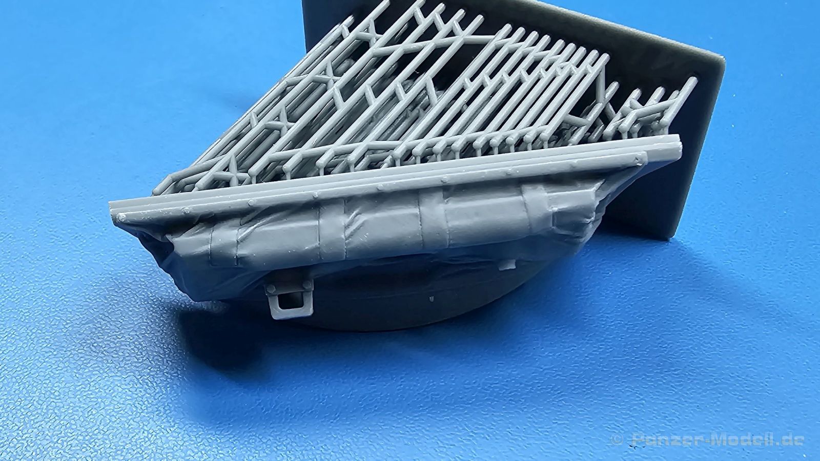 Tamiya kam dieses Jahr mit einem fantastischen britischen Comet auf den Markt. Ein toller Bausatz, den man trotzdem immer noch ein wenig aufwerten kann. T-Rex Studio liefert in 3D-Drucktechnik eine passende Turmfront mit Wetterschutzplane. In einem 70 x 70 x 40 mm großen Karton befinden sich zwei wieder verschließbare Plastiktütchen, in denen sich zum einen die Turmfront und zum anderen das Blenden-MG befindet. Der Druck ist sehr gut - die Teile sind sehr sauber, fein detailliert und fehlerfrei. Die Turmfront ist zusammen mit der planenüberzogenen Blende in einem Stück gedruckt. Sofern sichtbar ist die Gussstruktur sehr gut und glaubhaft wiedergegeben. Links und rechts der Blende sind Gussnummern zu erkennen und die Köpfe der Schildzapfen sind vorhanden. Die Blendenplane hat einen fantastischen Faltenwurf und wir finden die Befestigungsschrauben am oberen Rand, feine Nähte und Öffnungen für die Blenden-MG-Panzerung, das Kanonenrohr und das Zielfernrohrmantelrohr. Auf der gegossenen Blenden-MG-Panzerung befindet sich noch ein geschraubter Blechstreifen. Das Ende des Zielfernrohr-Mantelrohrs ist fein und scharf gestaltet. Das separat beiliegende Blenden-MG ist der Mündung ausgehöhlt, die Belüftungslöcher des Rohrmantels sind vorhanden, auch wenn man sie in der Blendenpanzerung kaum noch sehen kann. Das MG passt perfekt in die Blende. Mit dem Preis von fast 20 Euro liegt das Set über dem der Konkurrenz. Hier muss man dann vergleichen, was einem besser gefällt. Die Blendenfront ist explizit für das Tamiya-Modell vorgesehen. Ob es auch an anderen Modellen angebaut werden kann, muss man ausprobieren.
