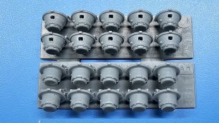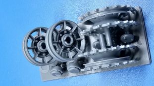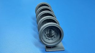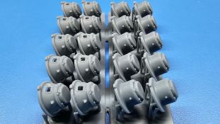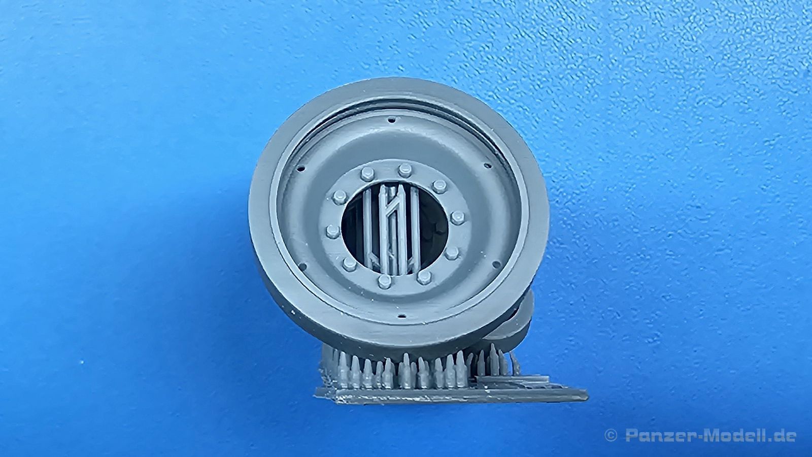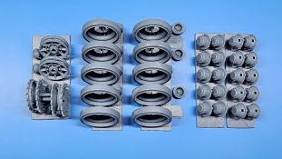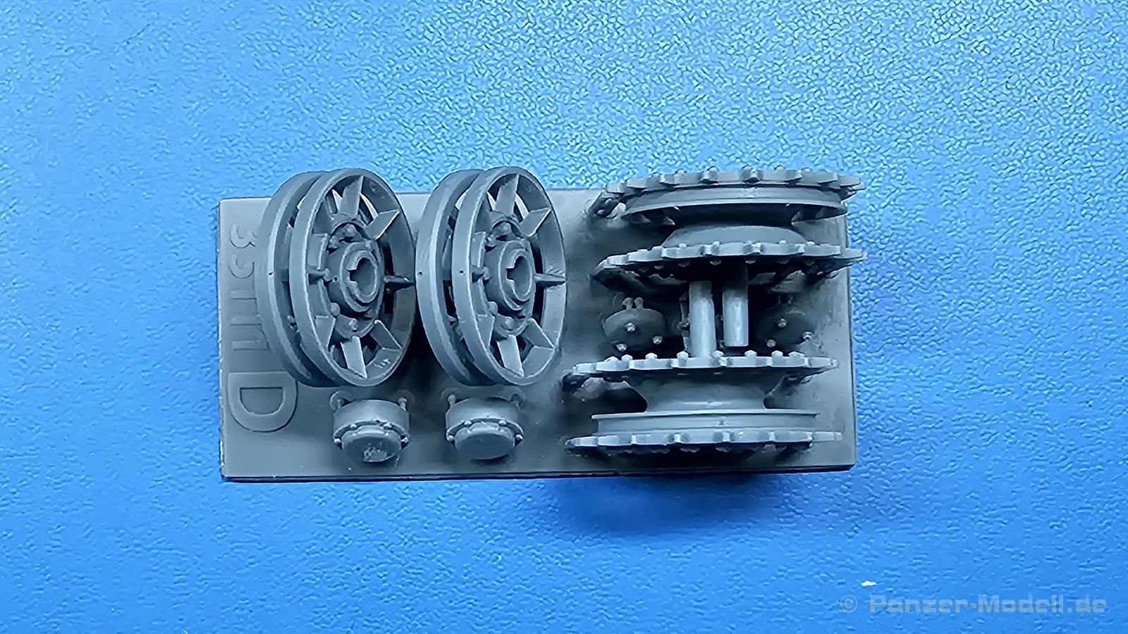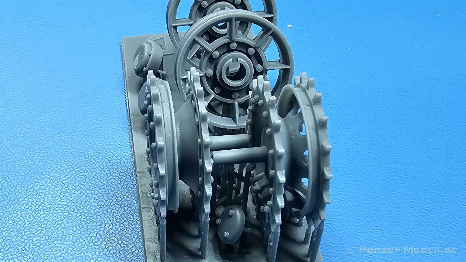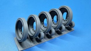 Der Tamiya Comet ist ja schon ein tolles Modell. Will man dem Laufwerk noch einen Extrakick mitgeben, empfiehlt sich das Räder Set von T-Rex Studio. In einem 70 x 70 x 40 mm großen Karton befinden sich zwei wieder verschließbare Plastiktüten mit den Druckbasen. Der Druck ist sehr gut - die Teile sind sehr sauber, fein detailliert und fehlerfrei. Nicht wundern, wenn einige Teile bereits von den Drucksupports gelöst sind. Das Set war bereits Gegenstand eines anderen Reviews und wurde nicht mehr originalverpackt. Euch sollten die Teile in einwandfreiem Zustand erreichen. Enthalten sind 2 Antriebszahnräder mit separaten Nabendeckeln, 2 Leiträder mit separaten Nabendeckeln, 8 äußere Stützrollen, 10 äußere Laufrollen und je 10 frühe und 10 späte Laufrollennaben.Erwartungsgemäß sind Details sehr scharf und fein gedruckt. Dies fällt besonders bei den Kronenmuttern der Antriebszahnräder und den anderen Schraubenköpfen auf. Es sind nur die äußeren Laufrollen vorhanden, da man von den inneren sowieso nicht viel zu sehen bekommt, verwendet man die aus dem Originalbausatz. Die konisch geformten Nabendeckel der frühen Ausführung sind mit viereckigen Löchern, erhabenen Gussnummern, Verschraubungen und Schmierölschrauben versehen, während die zylindrischen der späten Ausführung einfacher gehalten sind. Die Antriebs- und Leiträder sind paarweise zusammengedruckt. Auf den Laufflächen der Leiträder sind kleine Druckfehler (Löcher) zu sehen, die man aber leicht zuspachteln kann oder man platziert sie so, dass die Ketten dort aufliegen - Problem gelöst. Die Nabeldeckel dieser Räder sind separat vorhanden. Die Schrauben sind gut gestaltet, aber leider auch hier sind kleine, wenige Löcher zu sehen. Wie bei den Laufrollen gibt es von den Stützrollen nur die äußeren Rollen. Sie sind scharfgedruckt, mit großer Sechskantmutter in der Mitte und vier Felgenlöchern.Es gibt keine Bauanleitung, aber auf der Webseite gibt es Bilder, die zeigen, wo die Teile hingehören und wie sie zusammenpassen.Dieses Räderset ist ideal, wenn man den Comet als Einzelmodell oder in einem Diorama auf sauberer Straße präsentieren möchte, damit man die Details auch zu sehen bekommt. Von den kleinen Druckfehlern abgesehen, ein empfehlenswerter Rädersatz.