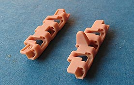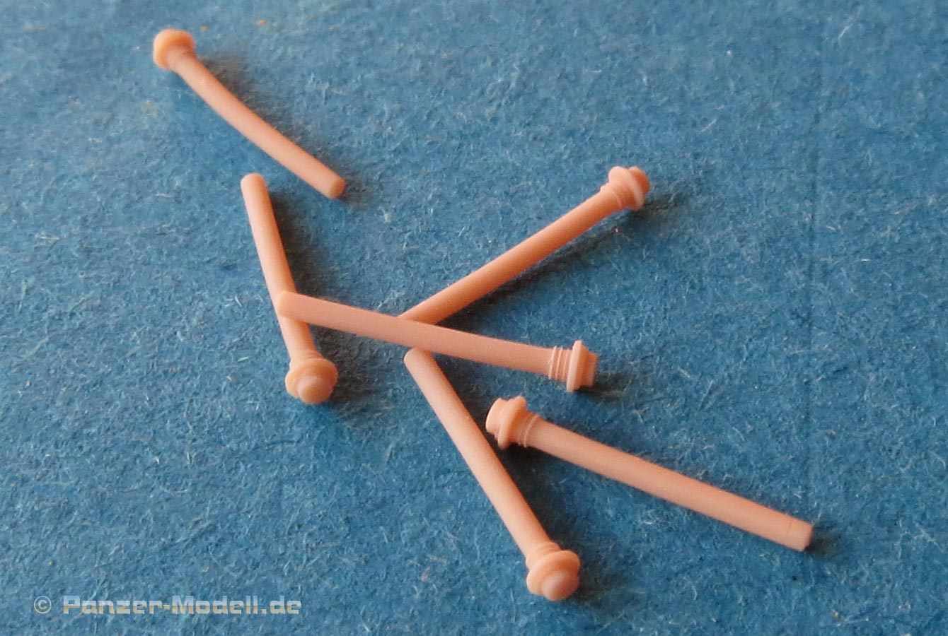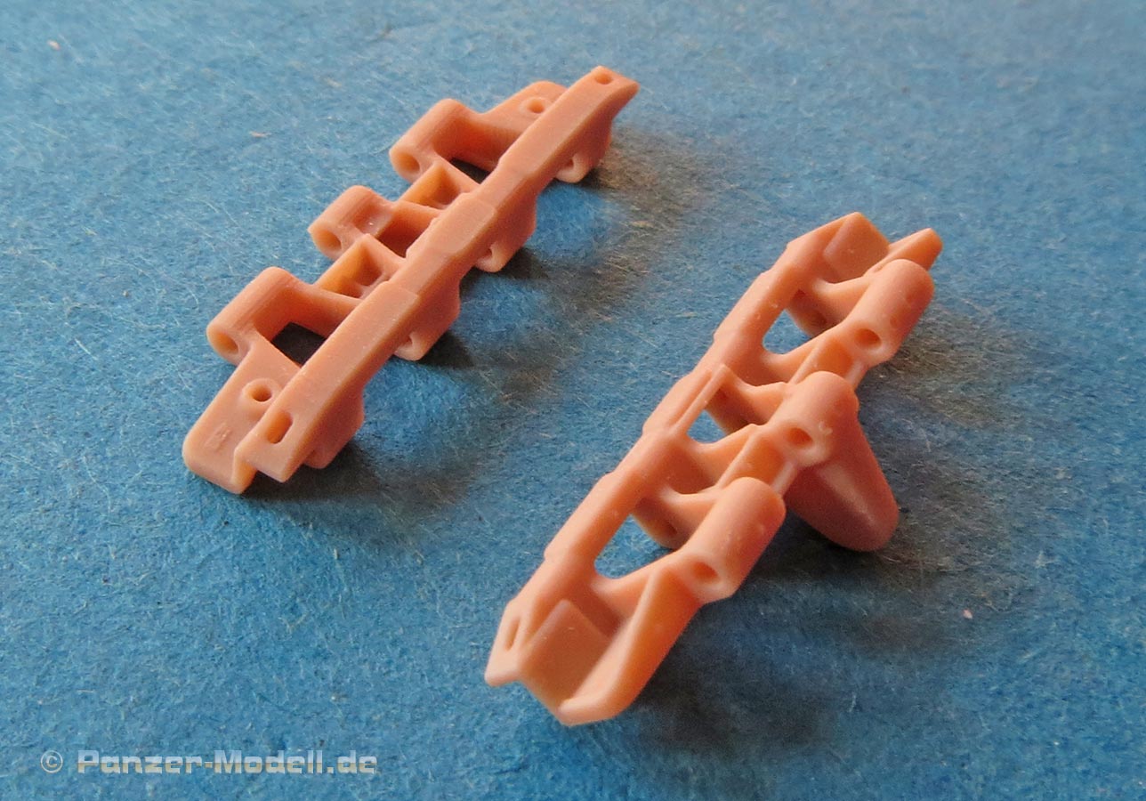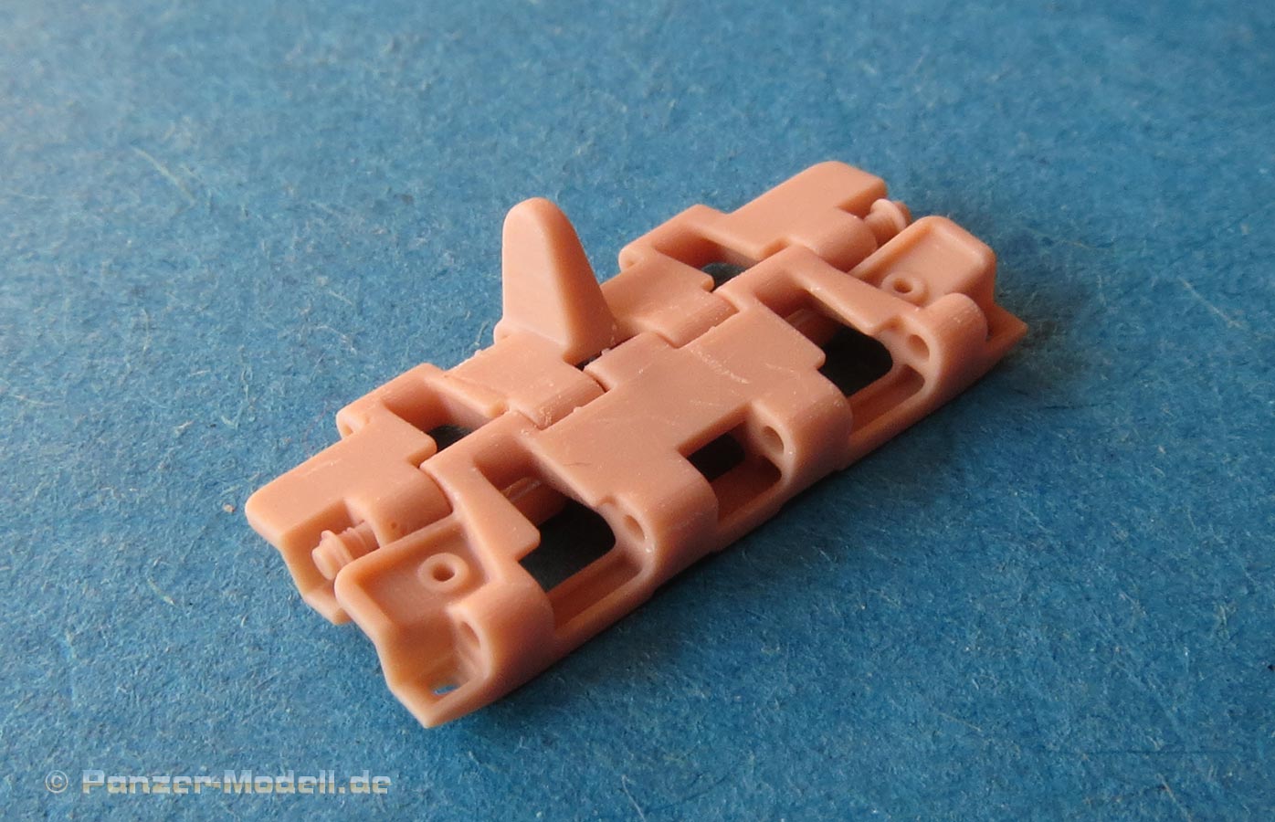 In der Verpackung befinden sich zwei stabile Plastikschachteln in der sich jeweils 120 Kettenglieder befinden, einmal mit und einmal ohne Führungszahn (die abwechselnd an einem Strang verbaut werden) und zwei Tütchen mit entsprechenden Bolzen zum verbinden der Kettenglieder. Der Druck ist wirklich hervorragend – sauber, detailreich und fehlerfrei und vor allem ohne jegliche Angüsse oder Druckstreben - alles komplett versäubert, sodass die Glieder und Bolzen direkt verwendet werden können. Auch bei diesen großen Gliedern finden sich keine Druckfehler oder sonstige Defekt oder Verzug. Jeweils zwei Kettenglieder werden mit je zwei filigran gedruckten Kettenbolzen von rechts und links zusammengesteckt. Auch der Druck der Bolzen ist hervorragend - sauber und die Bolzen sind kerzengerade. Vor allem weisen sie tolle Details am Bolzenende mit der Bolzensicherung an einem Ende auf. Die Bolzen lassen sich erstaunlich leicht und einwandfrei in die jeweiligen Bohrungen einführen. Man muss nur sicherstellen, dass man die richtigen Bolzen von der richtigen Seite aus einsteckt und damit den Kettenstrang zu einem linken und rechten macht. Ein Verkleben ist laut Hersteller nicht nötig. Obwohl die meisten Bolzen recht gut halten ist es meiner Meinung nach ratsam die Bolzenköpfe doch zu sichern. Sekundenkleber, Mattlack oder auch normaler Kleber. Aber sehr sparsam. Wer seinem seinem Ferdinand eine schöne neue Kette spendieren will, ist hier sicher gut beraten. Preislich nicht ganz günstig, aber vom Inhalt und der Qualität her absolut die Euros wert - vor allem da man eine bewegliche Kette bekommt.