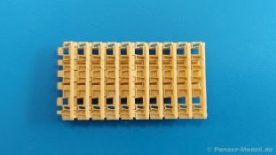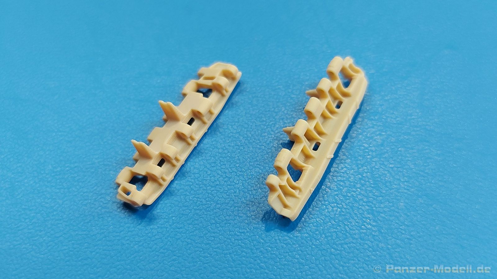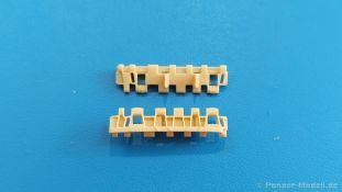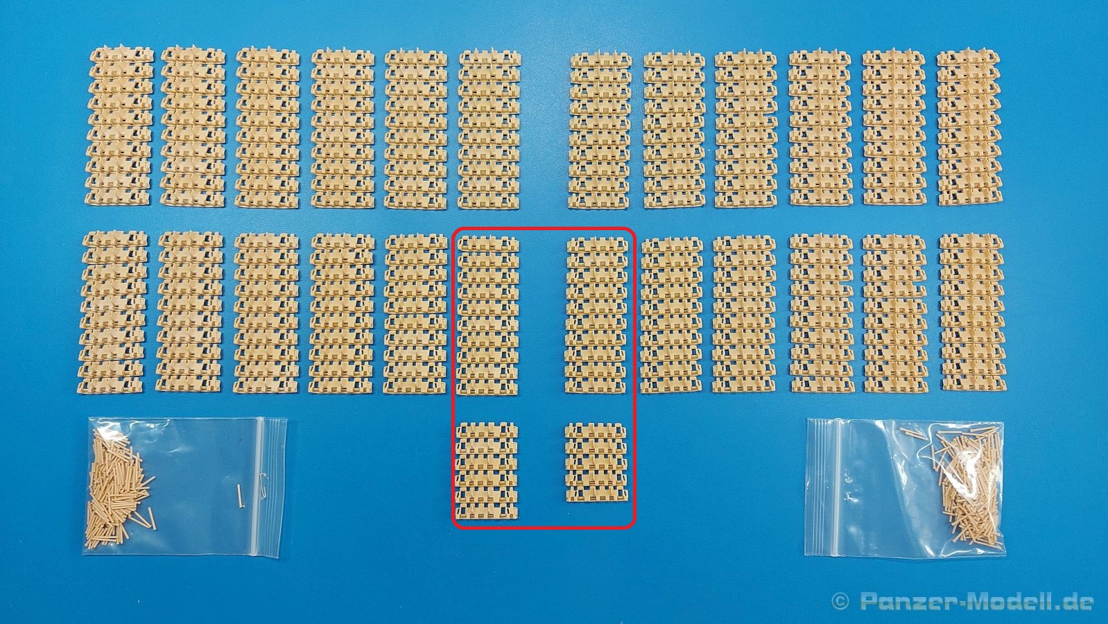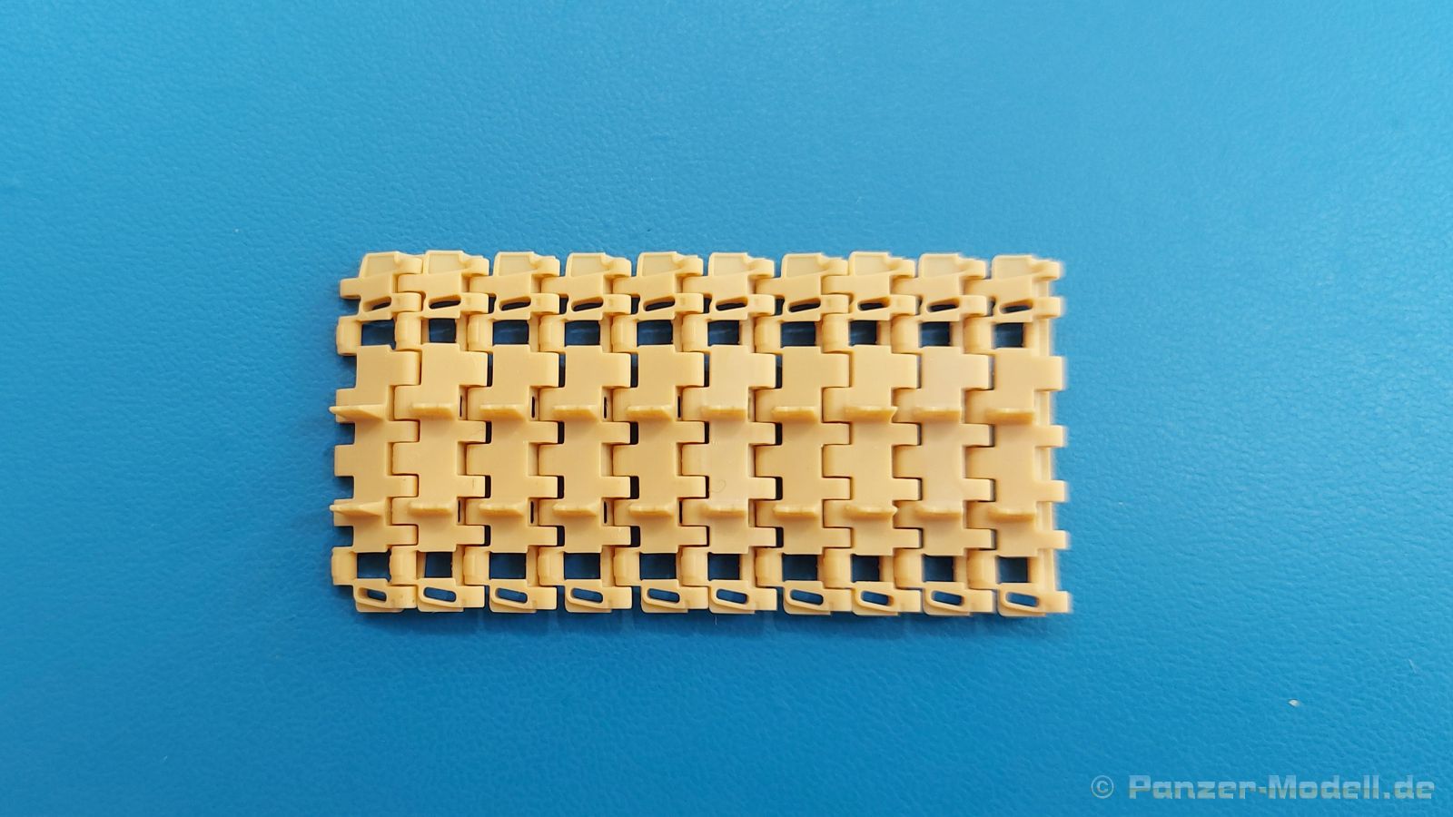 King Tiger Tracks 18 Teeth Late Type Mirror Version T-Rex Studio hat sich ja mittlerweile einen Namen im 3D-Druck gemacht, auch bei den Einzelgliederketten. Heute schauen wir uns einen Kettensatz für den Panzerkampfwagen VI Tiger B, auch immer wieder Königstiger genannt. Dabei handelt es sich um Ketten ohne Zwischenglieder, d.h. dass die Antriebszahnräder 18 Zähne pro Zahnkranz haben müssen. Zudem handelt es sich bei dem Set um gespiegelte Ketten (Mirror Tracks), so dass die Ketten der rechten und linken Seite nicht dafür vorgesehen sind, gegeneinander ausgetauscht zu werden. In einem 85 x 80 x 55 mm großen Karton befinden sich vier wiederverschließbare Plastiktüten, zwei mit den jeweiligen Ketten für rechts und links. zwei mit Kettenbolzen mit je verschiedenen Köpfen. Die Bolzen habe ich jetzt nicht gezählt, aber ich vertraue darauf, dass die Anzahl reichen wird. Bei den Kettengliedern sollen insgesamt 220 Glieder (110 pro Seite) im Karton sein, tatsächlich sind es aber 251! Der Druck ist sehr gut - sauber, detailliert und fehlerfrei. Es gibt mit bloßem Auge keine sichtbaren Drucklamellen, sondern nur feine, glatte Flächen. Wirklich gute Details begeistern mit scharfen Durchbrüchen und Stegen, einwandfreien Bohrungen der Bolzenlöcher, Gussnummern in den Feldern, Eisgreifern auf den Stegen und klasse Bolzenköpfen. Man sieht keine Reste der Druckstützstrukturen. Die Glieder „flutschen“ im wahrsten Sinne des Wortes ineinander. Die feinen Bolzen werden jeweils von innen und außen eingeschoben, welches auch ohne Probleme vonstattengeht, man muss nur schauen, welche Bolzen außen und welche innen verwendet werden sollen. Bei einer Verwechslung wird es der Funktion ggfs. keinen Abbruch tun. Das muss man dann mit sich selbst ausmachen. Ich empfehle die Nutzung einer spitzen Pinzette zum Einführen und Nachdrücken der Bolzen. Die Kette soll sich ohne Klebstoff bauen lassen. Wer sicher gehen will, hilft mit einem feinen Tropfen Klebstoff an Bolzenköpfen nach. Wer die Beweglichkeit der Kette erhalten möchte, muss dann entsprechend sparsam und vorsichtig mit dem Klebstoff umgehen. Eine Einzelgliederkette, die auch Schnellbauer begeistern kann, da sie sich ohne Nacharbeit schnell und leicht zusammenfügen lässt. Anfänger sollten problemlos damit zurechtkommen, wenn es auch eher unwahrscheinlich ist, dass man sich gleich auf Upgrade Sets stürzt. Die Details sprechen für sich. Von meiner Seite aus beide Daumen nach oben!