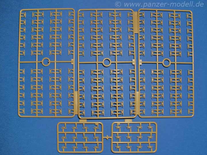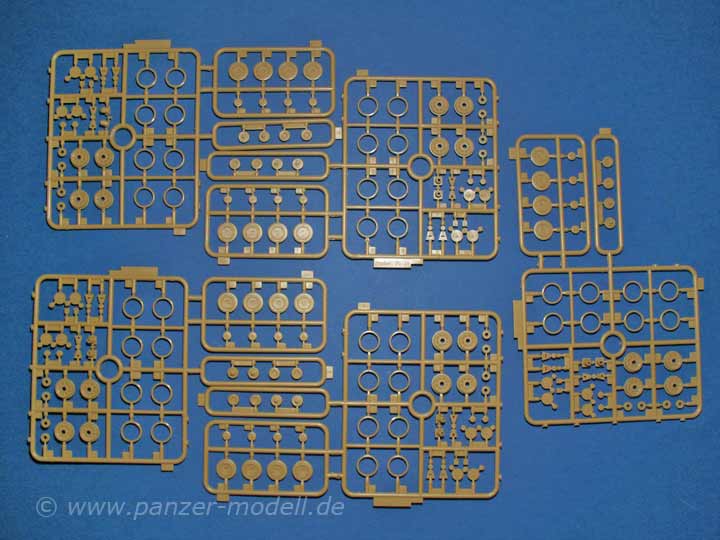 Die Unterwanne ist aus mehreren Teilen, darunr Seitenwände zusammenzubauen, was etwas riskant ist, da sowas potentielle Passprobleme bietet mit Verzug und Spalten, wenn man nicht genau aufpasst. Das Laufwerk besteht wieder aus den beweglichen Federelementen und angenehmerweise mit seoaraten Gummierungen für die Laufrollen, was das Bemalen sehr angenehm macht. Sämtliche Luken, auch in der Wanne, können offen dargestellt werden, eider gäbe es dann dahinter nicht zu sehen - da müsste noch was passieren. DIe Kanone gibt es entweder offen (mit Feldern und Zügen) oder mit Verschlusskappe. Interessant ist der Turm, der oben eine riesige Luke aufweist, die mir bislang nie auffiel. Der Turm weist im Inneren ein bisschen Inneneinrichtung mit Kanonendarstellung, Sitzen und Turmbühne. Eine Rommelkiste gibt es hier nicht.