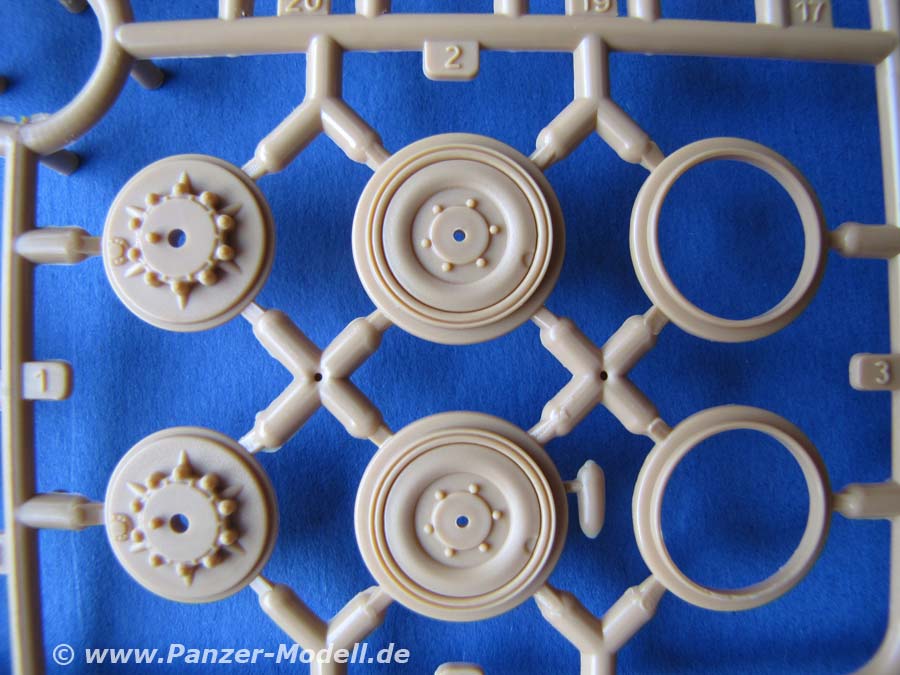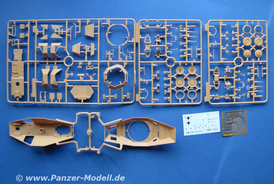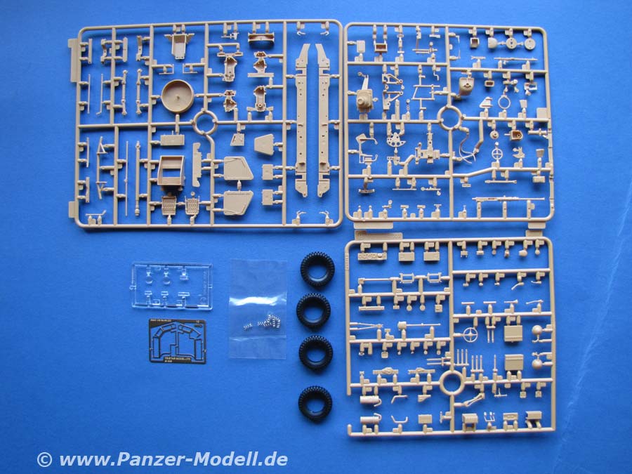 Im Bausatz enthalten sind 7 Spritzlinge, Metallfedern, PE Teile, Vinylreifen und natürlich ein Decalbogen .