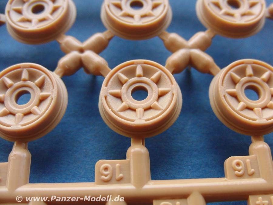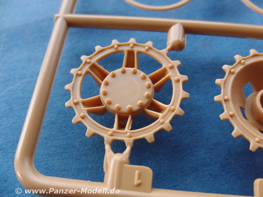 Die Qualität der Teile ist durchweg gut - die Detaillierung reicht nicht so ganz an die Feinheiten der neuesten Dragon Bausätze heran, aber absolut ausreichend. Die Fahrwerkskomponenten sind von den vorigen Panzer IV Bausätzen bekannt. Bemerkenswert sind die Spritzlinge aus weichem Vinyl mit den Gummibandagen für die Laufrollen, die sogar Herstlleraufdrucke aufweisen. Allerdings lebt man so immer mitd er Angst, dass diese über die Jahre mal reissen werden, wenn der Weichmacher verdunstet ist.