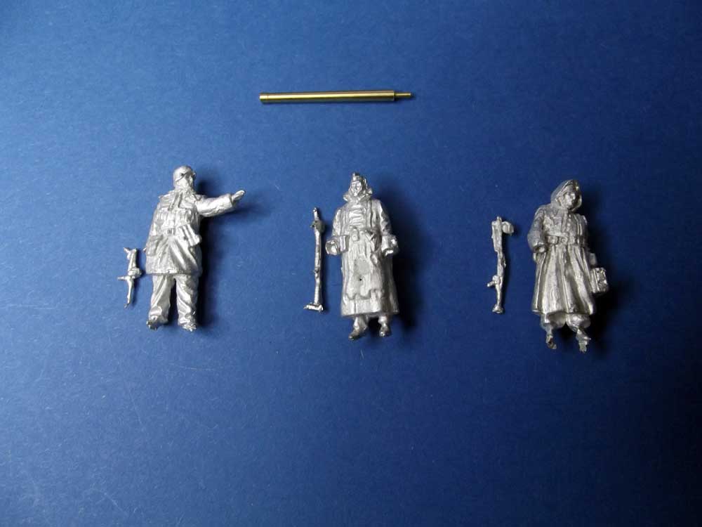 Inhalt der Packung: 3x Figuren / Material Zinn, 1x T-34 Wrack inkl. Metallrohr Diese Figuren tragen Winterbekleidung und stellen einen MG-Trupp dar. Durch das beigefügte T-34 Wrack, bestehend aus dem Resin-Abschnitt des Panzers und einem gedrehtem Messingrohr, sind sie eindeutig an der Ostfront im Einsatz. Die Figuren sind in ruhiger Körperhaltung stehend dargestellt, der Gruppenführer zeigt in eine Richtung und gibt den MG-Schützen Anweisungen. Die Detaillierung der Figuren ist auch bei diesem Set durchaus gut gelungen, Faltenwurf und Körperhaltung wirken stimmig und ergeben einen guten Gesamteindruck. Auch das T-34 Wrack sieht sehr ordentlich aus, lediglich zwischen dem oberen Bereich der Gleiskette und der Kettenabdeckung findet sich ein etwas merkwürdig aussehendes „Gebilde“. Ob es nun angehäuften Schlamm darstellt oder ob es sich um Gussreste des Resins handelt? Das Problem dieser etwas merkwürdigen Optik dürfte sich nur mit reichlich Nacharbeit beheben lassen. Das Figurenset kann für 13,90 EUR direkt über theweatheringfactory bezogen werden. Wir bedanken uns bei Manuel Holz für das Besprechungsmuster. |