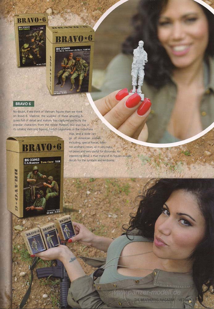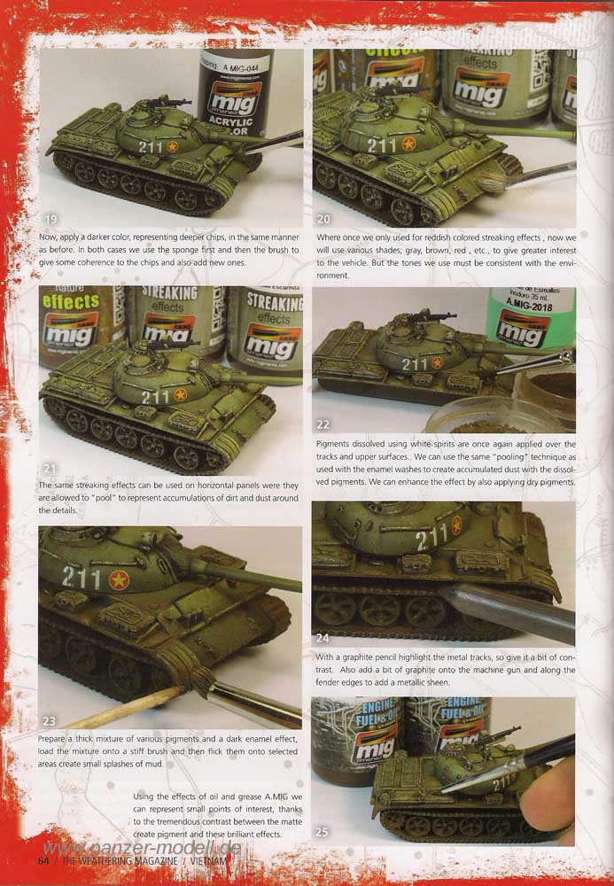 Doch zurück zum eigentlichen Thema: Ab Seite 6 beginnt ein Bericht zum M48A3 Patton von Dragon in 1:35. John Murphi geht ausführlich auf die Bemalung und Verschmutzung des Panzers im Kampfeinsatz ein. Anschließend berichtet Ian Hamilton über einen T-55 der Nordvietnamesischen Armee. Auch hier wird ausführlich die Bemalung, Alterung und Verschmutzung beschrieben. Es folgen dann Hinweise zur realistischen Verschmutzung von Modellen in Vietnam. Und natürlich kommen hier neben diversen Ölfarben hauptsächlich Produkte der Ammo of Mig-Serie zum Einsatz. Beim Thema Vietnam dürfen auch Figuren nicht fehlen. Und wenn man die Stichworte Vietnam und Figuren hört… da kommt einem sofort BRAVO 6 in den Sinn. Vladimir Demchenko stellt zwei seiner Figuren vor und erläutert die Bemalung Schritt für Schritt. Mit dem Titel Shark Attack präsentiert uns Yang Yu-Pei einen Bell Kampfhubschrauber. Das Modell wird mit einer spektakulären Bemalung und Alterung auf den Seiten 26 bis 31 vorgestellt. Vietnam: Dazu gehört natürlich auch die Gestaltung einer Dschungel-Szene. Vladimir Demchenko zeigt an einer kleinen Vignette die realistische Gestaltung einer kleinen Szene im vietnamesischen Urwald. Die Figur auf der Vignette wird zur Nebensache, der Schwerpunkt liegt hier ganz klar auf der Pflanzenwelt. Und was darf in Vietnam nicht fehlen? Richtig, die Phantom! Jamie Haggo stellt uns seine Phantom in 1:48 von Academy vor. Und auch das Gegenstück, die Mig 17 in Diensten der NVA wird ausgiebig bemalt und gealtert.. Die Gestaltung einer Vignette mit etwas Bewuchs und einem Gewässer wird durch Jean-Bernard André auf den Seiten 46 bis 48 vorgestellt. Etwas Science Fiction darf auch nicht fehlen. Oishi zeigt auf den Seiten 50 bis 55 seine Version eines Kampfroboters. Unter dem Titel "Choose the right Product" zeigt uns Elizabeth Wiese wieder einmal jede Menge… an Produkten zum Thema Vietnam. Oder was habt ihr jetzt gedacht? Aus den Sortimenten von Joefix Studios und Model Scene präsentiert sie Dschungelpflanzen, von BRAVO 6 zeigt sie diverse Figuren und von Combat Models stellt sie Panzer-Modelle für die Wargamer im Maßstab 1:55 vor. Auch beim Thema Bemalung sollen die Wargamer nicht zu kurz kommen. Rubén Torregrosa bemalt drei kleine Panzer in unterschiedlichen Qualitätsstufen. Für den Basic-Level veranschlagt er einen Zeitansatz von ein bis zwei Stunden, für den Intermediate-Level muss man schon so ca. drei bis vier Stunden veranschlagen und für den Advanced Level kommen ca. acht Stunden zusammen. Ich hätte nicht gedacht dass man eine solch aufwendige Bemalung auch an einem so kleinen Panzermodell durchführen kann. Natürlich findet man auch in diesem Heft wieder reichlich Werbung, die „Postcards from the Wolrd“ kommen diesmal aus Schweden von der Modelexpo der IPMS Stockholm und vom Bulldogfest 2014 in der Slowakei.Fazit: Ich bin begeistert! 86 Seiten bringen eine geballte Ladung an Information und Inspiration. Unbedingte Kaufempfehlung! Special thanks to Ammo of Mig for the sample.
