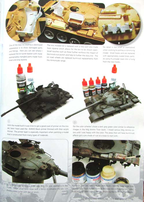 Weitere 8 Seiten sind dann vom Master himself, Mig Jimenez, gefüllt, der den Tiger II mit Oktopus Tarnung, von dem es im Panzerwrecks 12 ein großes Farbfoto gibt, nachgebaut und entsprechend bemalt hat - der Clou ist dabei die beschädigung durch die Abschüsse in die Seite und der mittig ausgebrannte und mittlerweile rostende teil, wie man es auf dem Foto auch bereits erahnen kann. Mig zeigt hier, wie die Einschüsse und die Farbgebung dieser Bereiche realistisch dargestellt werden kann und mit welchen Farbnuancen das derart realistisch reproduziert werden kann.