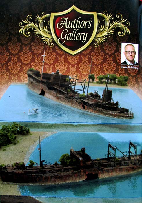 Es folgen 4 Seiten mit einem Diorama von Jonas Dahlberg, der ein halb gesunkenes Holzschoff an einer felsküste nachstellt. Das Schiff ist selber aus Holzteilen gebaut - eine umwerfende Arbeit. Und die Darstellung im Diorama mit Wasser und dem verwitterten Holz ist sensationell. Angeschlossen sind 2 Seiten mit weiteren grandiosen Dioramen von Jonas mit versunkenen Schiffen.