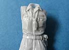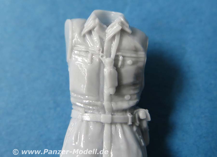 Die Details der Uniformen mit der Panzeruniform sind sehr schön wiedergegeben. Direkt mit angegossen sind die umgehängte Sprechbox und Koppel mit Pistolenholster. Die Uniform ist so detailliert, dass man die Reißverschlüsse, Knöpfe und sogar die Dienstgradabzeichen und Deutschlandflaggen auf dem Ärmeln erkennen kann. Grandios! Auch der Faltenwurf ist ganz ausgezeichnet modelliert und dargestellt.