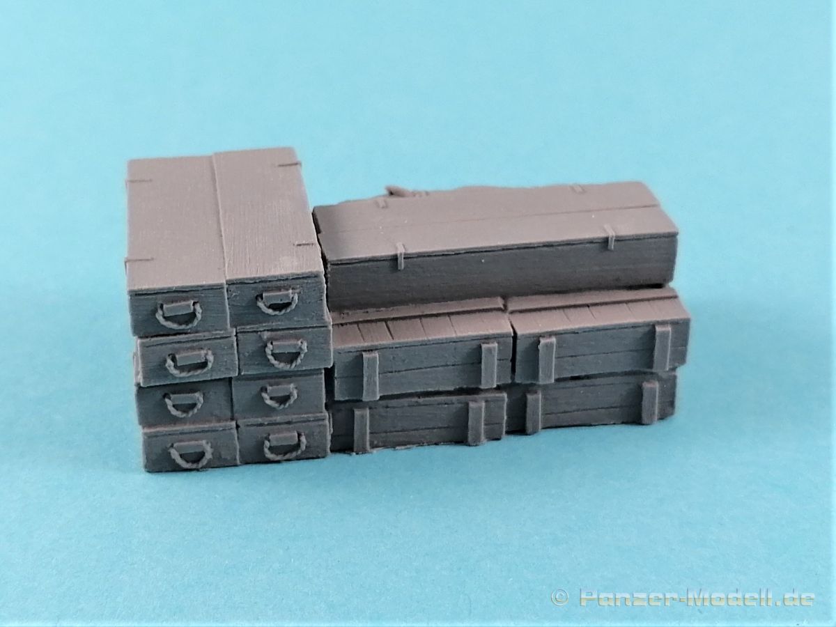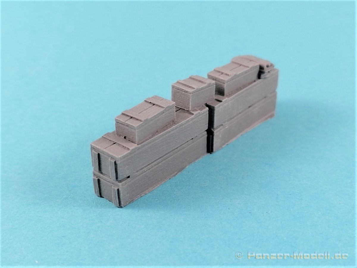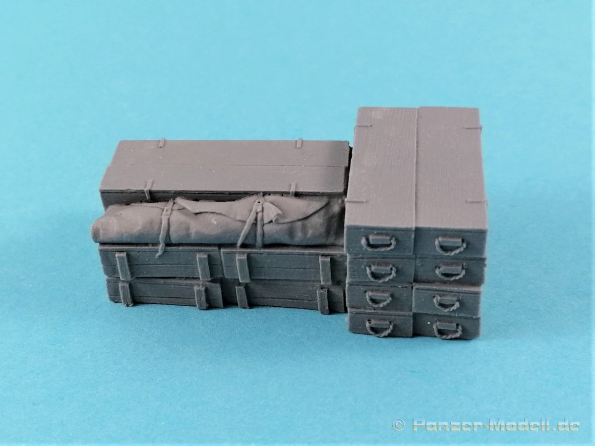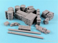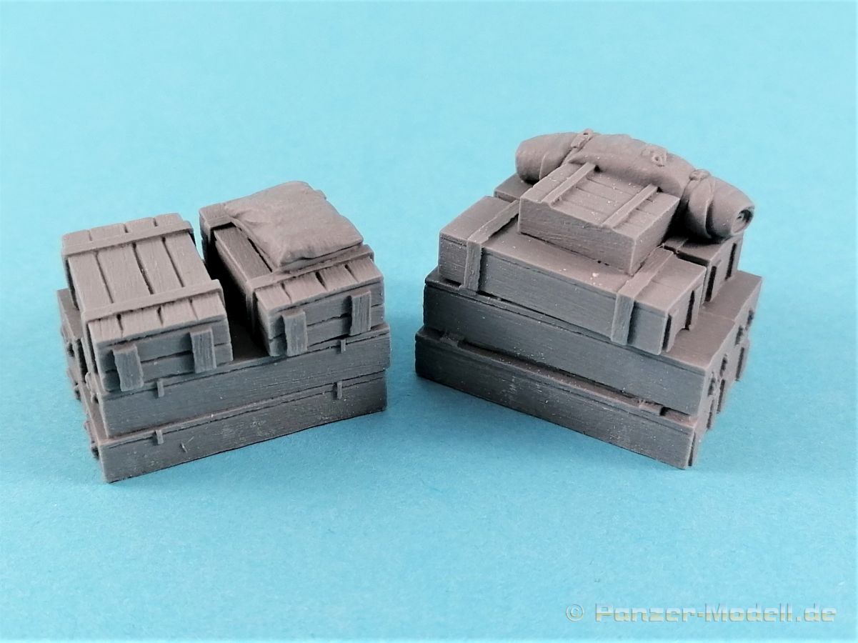 Wer seine Fahrzeuge aufrödeln will, hat eventuell das Problem, das die Grabbelkiste nicht so viel hergibt. Mit den Kits von Value Gear sind Zuladungen von LKWs, Panzern etc. ohne weiteres zu realisieren. Gleiches gilt auch für die Bereicherung von Dioramen. Laut Titel ist das Zubehör auf einen Opel Blitz zugeschnitten. Zwar richtig, können die Bauteile durchaus universell eingesetzt werden. 13 verschiedene Ladungsteile sind in dem Zip-Lock Beutel enthalten; Kisten, Fässer, Balken und mehr, teilweise bereits in verschiedenen Zusammenstellungen und Größen gegossen. Dazu noch Planen und ein kleiner Sack. Die Qualität ist absolut überzeugend. Randscharf produziert finden sich keinerelei Luftblasen oder Einschlüße. An machen Stellen gibt es etwas Flash, der aber problemlos egalisiert werden kann. Ein weiterer Pluspunkt: Zu entfernende Angußbutzen sind keine vorhanden. Lediglich die Standflächen sollten einmal über Schleifpapier kurz abgezogen werden – und das war es dann auch schon! Einer guten Bemalung steht nichts mehr im Weg! Auf jeden Fall ist das Zubehör von Value Gear eine Bereicherung unserer Hobbys. Ein Blick in das Portfolio des Herstellers offeriert eine beeindruckende Vielfalt von weiteren Ausrüstungsgegenständen. Absolut empfehlenswert!