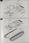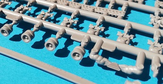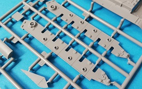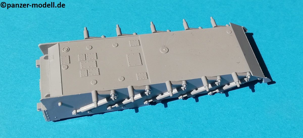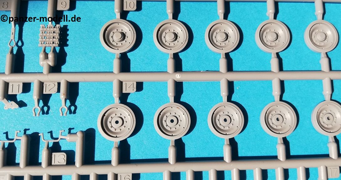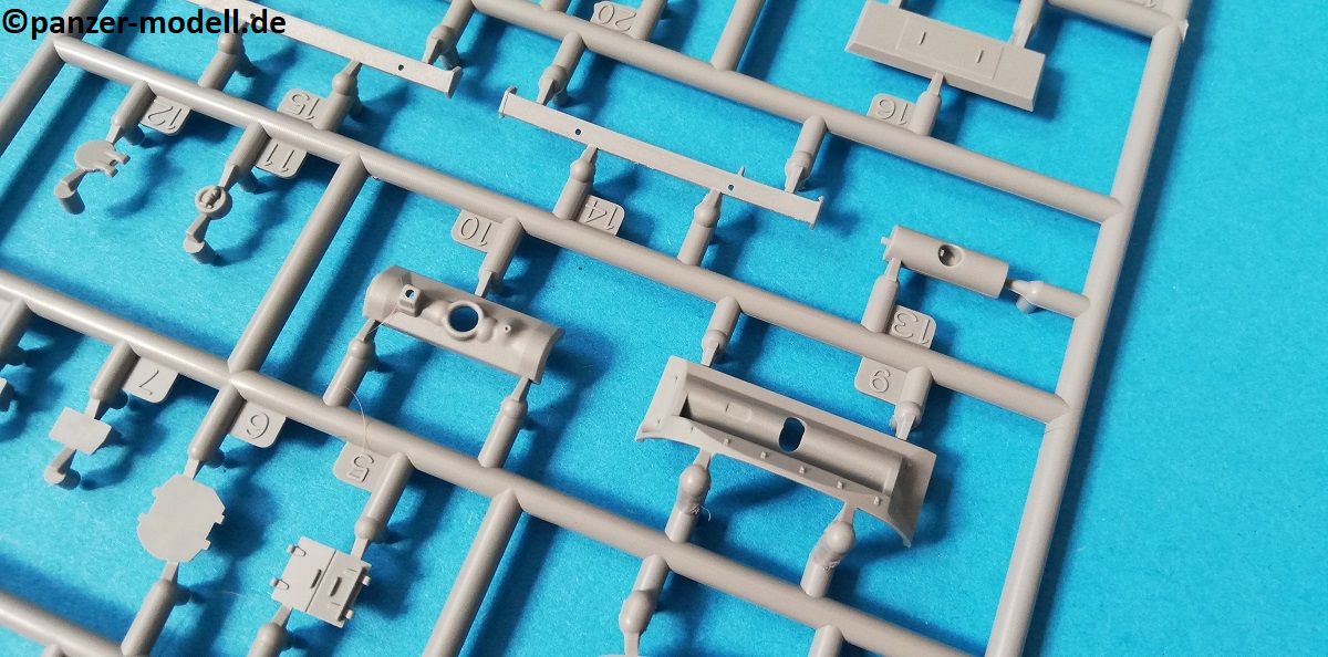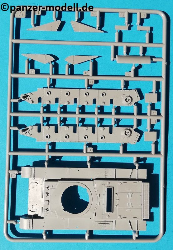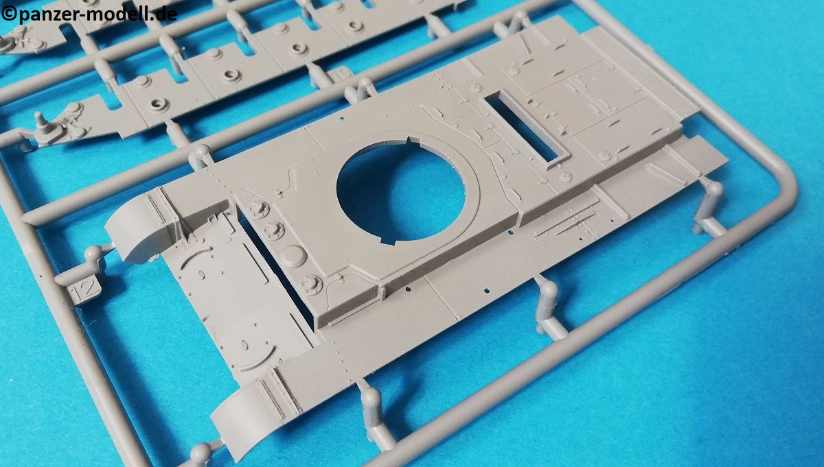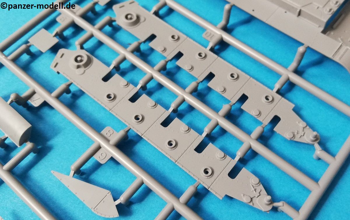 Der Spritzguss bewegt sich durchgehend auf einem hohen Niveau. Am Bausatz sind augenscheinlich keine Fischhäute vorhanden und auch die Auswerfermarken sind geschickt an solche Stellen gesetzt, welche man später nicht mehr sieht. Die einzelnen Bauteile machen einen hervorragenden Eindruck. Allein die Unterwanne aus einem Guss, weist schon viele schöne Details und sehr gut gemachte Schweißnähte auf. Die Schwingarme sind hier angegossen, was zwar dem Dioramenbauer nicht sehr entgegen kommt, da jedoch eine Segmentkette beiliegt, ist ein Anpassen an den Grund sowieso nicht gegeben. Die Detailfülle hier ist beeindruckend, da auch die Dämpfer in einer sehr hohen Qualität mit angegossen sind. Fast zu Schade diese hinter der äußeren Rumpfpanzerung zu verstecken. Die äußere Rumpfpanzerung ist mit jeder Menge Details, Schraubenköpfen sowie den Seitenvorgelen sehr schön ausgeführt. Alle Laurollen und die Triebräder bestehen aus zwei Teilen und sind fein graviert und detailliert Eine Augenweide. Die Stützrollen und die Staukästen sind im Slide-Mould verfahren gegossen und sind bereits in einem Stück. Das ist bei den filigranen Teilen eine echte Hilfe.