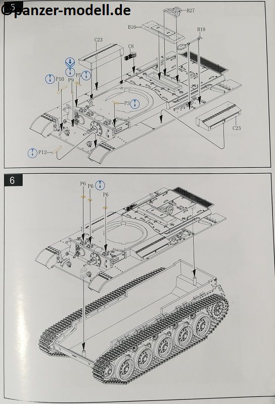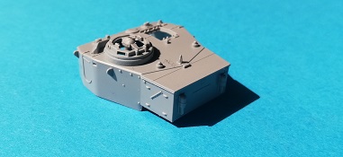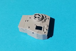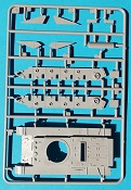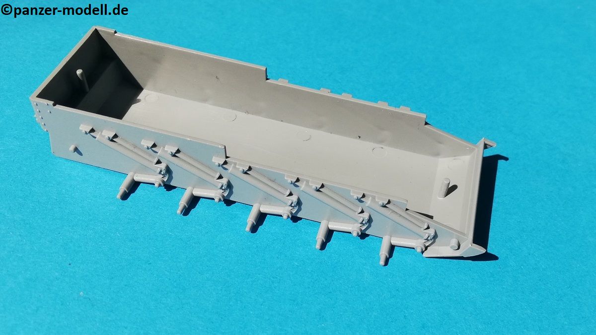 Die Oberwanne besteht aus einem Stück, bei dem noch einige Bauteile angebaut werden. Auch hier zeigt sich eine Fülle von feinen Details. Allerdings sind alle Handgriffe angegossen, was aber in diesem Maßstab durchaus zu verschmerzen ist. Das Lüftergitter am Heck ist ebenfalls graviert, und kann nicht ohne weiters durch ein Fotoätzteil ersetzt werden, da sich genau unterhalb dieser Stelle einer der beiden Passstifte befindet, welcher zur Verbindung der Ober- und Unterwanne dient. Das Gitter ist jedoch derart fein graviert, dass dies kein Nachteil ist. Zudem wird bei allen Versionen ein „Normandy cowling“ Deflektor über den Auspuff gesetzt. Hiervon sind zwei verschiedene im Bausatz enthalten.