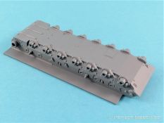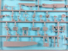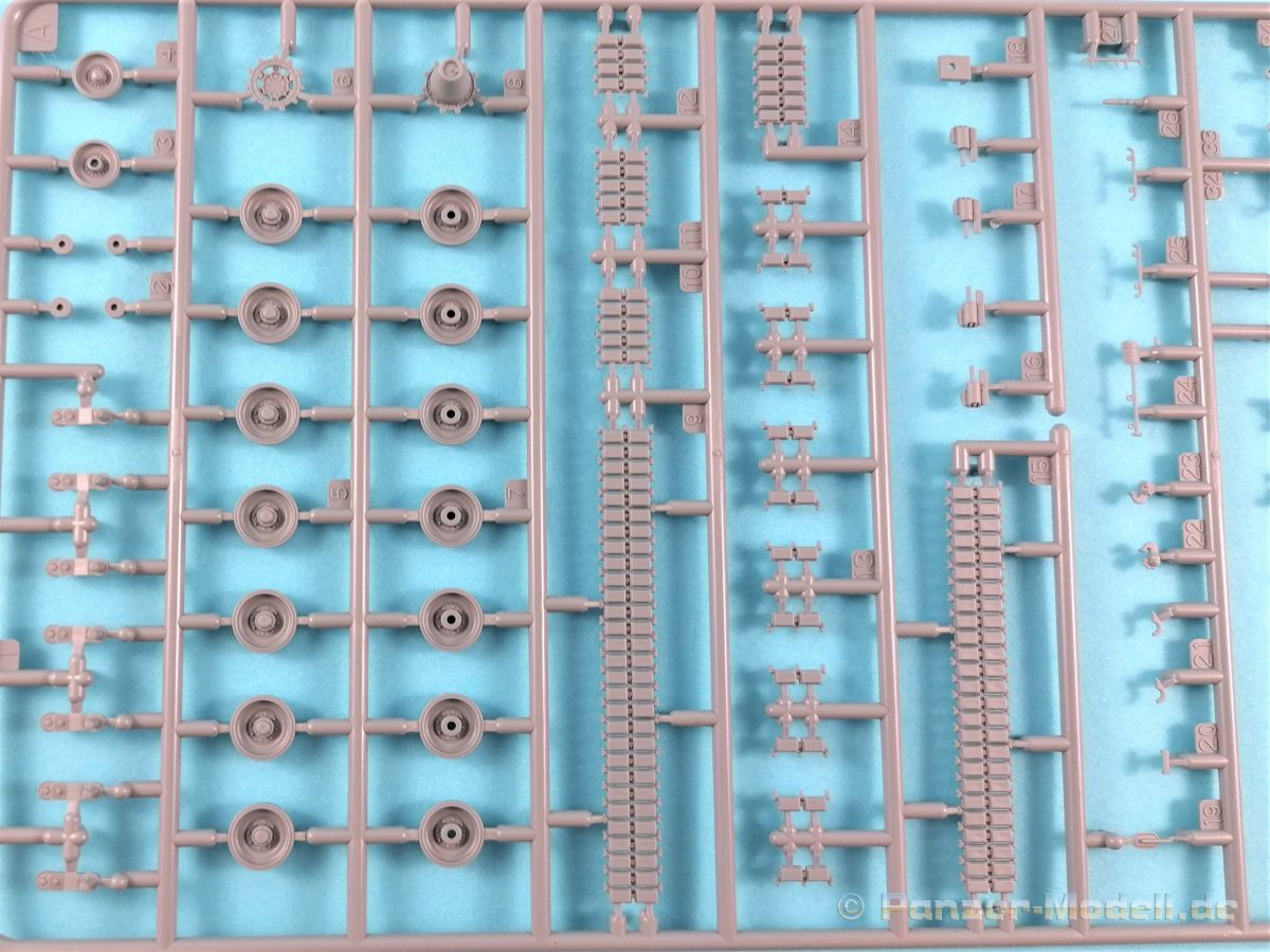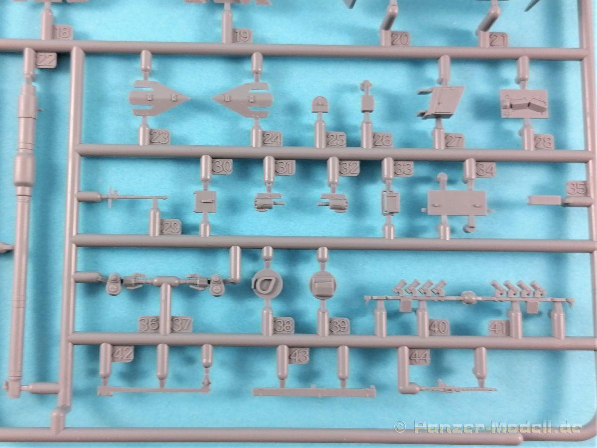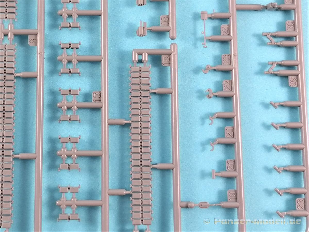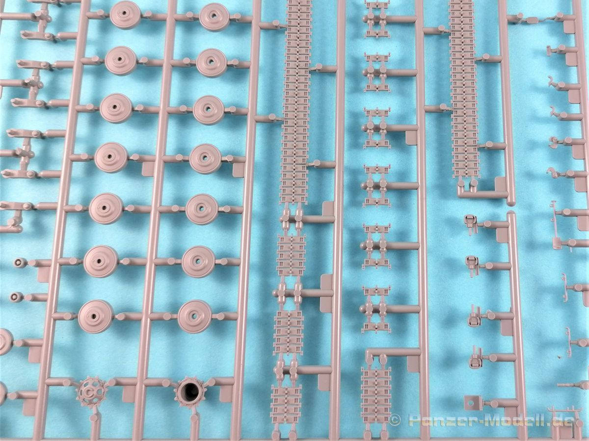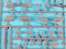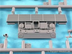 Was enthält der praktische Stülpkarton (26 x 16 x 5 cm), erneut mit einer tollen Boxart versehen. Das sind einmal fünf in hellgrauem Plastik hergestellte Spritzlinge, dazu der Turm sowie eine Panzerunter- und eine Oberwanne. Dazu kommen noch zwei Ätzteilbogen, ein Metallrohr, Decals und zwei Abschleppseile. Im Einzelnen: Rahmen A (2x) Laufwerksteile, Segmentketten, Einzelglieder und verschiedene Werkzeuge Rahmen B Turmunterteil, Heckwand und Anbauteile. Rahmen C Bauteile der Zusatzpanzerung, Rohr der Kanone, Lukendeckel und weitere Anbauteile Rahmen D Zusatzpanzerung, Schürzen und Anbauteile Pa und Pb Ätzteile Ein Turmoberteil Panzeroberwanne Panzerunterwanne Ein Metallrohr für die KwK Ein kleiner Decalbogen Zwei Abschleppseile (die etwas starr daherkommen. Tip: Ausglühen!) Nicht benötigte Teile sind grau hinterlegt. Alle Teile sind absolut sauber gespritzt und formtechnisch auf der Höhe der Zeit; mit einem hervorragenden Detaillierungsgrad. Formversatz oder gar Fischhäute konnte ich keine entdecken. Formtechnisch dürfte aber auch bei diesem Bausatz alles ausgereizt sein. Zwei Rahmen beherbergen die Segmentketten und Einzelglieder, die ebenfalls eine fantastische Detaillierung aufweisen. Für die Rundungen an Treib- und Leiträdern wurden je zwei Kettenglieder zusammengefasst. Sehr schöne Lösung. Das gesamte Laufwerk kann überzeugen, angefangen von den Schwingarmen bis hin zu den Stahllaufrollen mit ihren Bolzen. Leider verschwindet viel davon beim fertigen Modell nicht mehr einsehbar hinter den Schürzen. Einzeln gespritze Werkzeuge sind ebenfalls vorhanden, wobei die Verschlüsse sogar offen dargestellt sind. Eine weiterer Rahmen beherbergt u.a. das Turmunterteil und einen Teil des Wannenbodens sowie die Heckpartie. Wiederum alles überzeugend reproduziert und mit scharfen Details versehen. Die fantastische Detaillierung zieht sich auch über die restlichen Baugruppen hin und das ohne Ausnahme. Hervorzuheben sind erneut die vielen feinen Details die ebenfalls überzeugen. Wo möglich hat Vespid die Slide-Mould-Technik eingesetzt; und das mit Erfolg. Die in Plastik gespritzte Kanone lässt dem Modellbauer die Wahl zu dem in Metall beiliegenden Gegenstück das noch mit einigen Elementen aus dem Rahmen B vervollständigt werden muß. Hier gibt’s wieder die Qual der Wahl. Panzeroberwanne und Turm erfreuen das Auge erneut mit einer Vielzahl feinster Details. Hervorzuheben ist z.B. die Anti-Rutsch-Beschichtung, die feinst modelliert ist. In insgesamt 19 Stufen führt die Bauanleitung, diemal als DIN A5 Heft, zum Erfolg. Nachdem auf der ersten Seite noch Angaben zu den Piktogrammen, ein paar Sicherheitshinweise und Hinweise zu den Decals zu finden sind, folgt auf der zweiten Seite die Aufstellung der Spritzlinge und eine Übersicht der Farbhersteller. Genannt sind Mr. Hobby, Hobby Color, Humbrol und Tamiya. Aufgrund der übrig gebliebenen Teile dürften von Vespid noch weitere Versionen des Leos kommen. Zumindest liegt die Vermutung nahe. Die Baustufen sind klar, übersichtlich und dürften keine Probleme bereiten. Allerdings könnten die Zeichnungen durchaus etwas größer sein. In rote Rechtecke eingebettet sind in den jeweiligen Abschnitten die dazugehörigen Unterbaugruppen. Zwei fiktive Bemalungsvorschläge stehen zur Auswahl an. Diese sind wie üblich im Bildteil festgehalten. Dazu noch der kleine Abziebildersatz, der aber auch im Reich der Fiktion anzusiedeln ist. Ein toller Bausatz, aufgrund der Filigranität und den doch recht vielen Fotoätzteilen nicht für den absoluten Anfänger. Ein gerüttelt Maß an Erfahrung, vor allem auch bei der Verarbeitung der Ätzteile sollte mitgebracht werden. Erstaunlich, in welcher Qualität heute 1:72er Bausätze produziert werden können. Die Kits punkten nicht nur in der Ausführung (da könnten sich manche Hersteller bei größen Maßstäben ein Scheibe abschneiden) und Paßgenauigkeit, sondern auch mit dem erfreulich angenehmen Preis/Leistungsverhältnis. 1 zu 72er Fans werden bestens bedient. Auf jeden Fall hat Vespid die Meßlatte erneut sehr hoch gelegt.