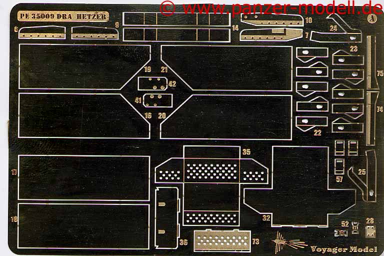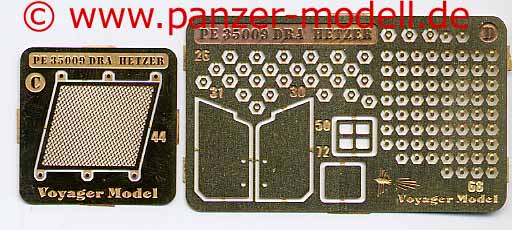 Dieses Set besteht aus 2 großen und 2 kleineren Platinen. Auch hier wieder, sehr schöne Strukturen und sauber geätzte Teile auf feinem Material. Desweiteren finden sich auch hier zwei Plastikrundstäbe in zwei Stärken. Als Bausatz wird der Dragon Hetzer mit der Nummer 6030 angegeben .. dürfte aber sicher auch für andere Hetzer passend sein. Die Bauanleitung ist, wie schon öfter erwähnt, sauber und übersichtlich ausgeführt.