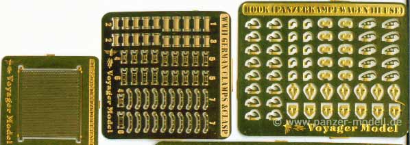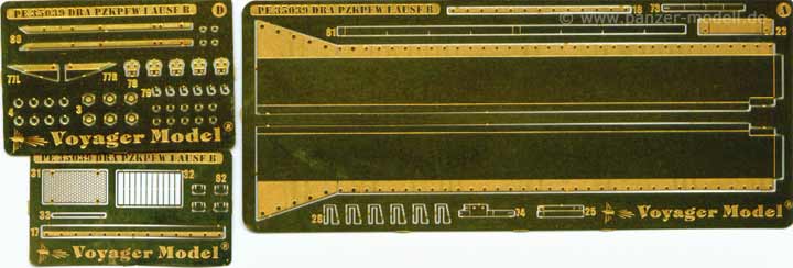 In diesem Set finden sich sehr detailierte Werkzeughalterungen und Haken, Details für den Laufrollenbalken, Auspuffgitter und Halter, Nietenreihen, Nebelkerzenhalter, Lüfterlamellen, Lüftergitter, neue Bleche für die Kettenabdeckungen, sowie neue vordere und hintere Kettenabdeckungen.