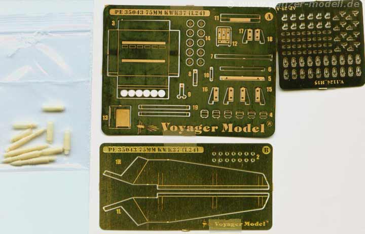 Im Set finden sich zwei große und eine kleine PE Platine. Dazu gibt es vier Patronen und 5 leere Patronenhülsen aus Resin für die 7,5cm Stummel Kanone. Die resinteile sind sauber gegossen und recht filigran! Die kleine PE Platine beinhaltet haufenweise Verschlüsse und Flügelschrauben. Desweiteren sind die Aufbaubleche und Verschraubungsbleche auf der Oberwanne als PE Teile vorhanden, die die recht dünnen Bleche recht gut wiedergeben. Besonders fein sind die Schraubenköpfe dieser Bleche als einzelne PE Teile zum Aufkleben - hier muss eine sehr feine Pinzette her!