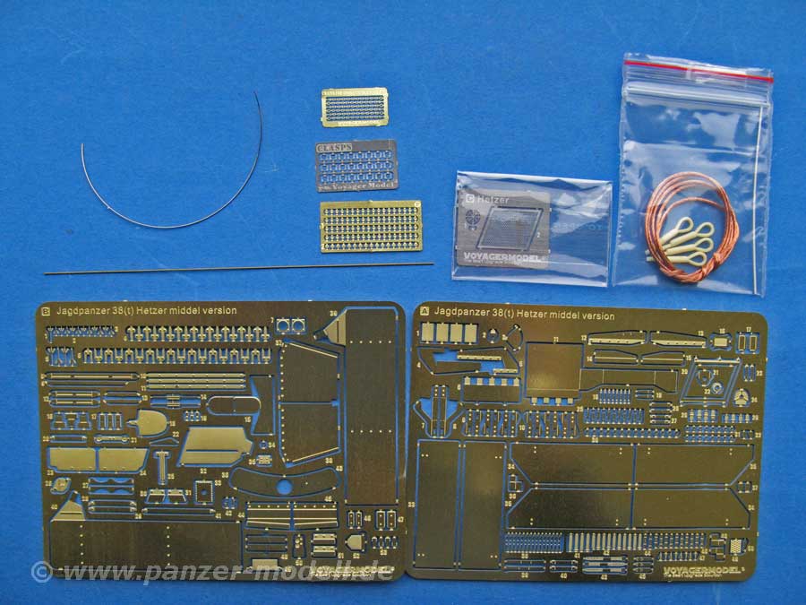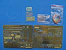 Enthalten im Set sind haufenweise Halterungen, Verschlüsse und Schnallen für Werkzeug, Ersatzkettenglieder, Aurüstung, Abschleppseil usw. Desweiteren PE-Details für den Auspuff, Zurrösen, Scharniere, Winkelspiegelabdeckungen, Antennenfuß, Kettenbleche, Lüftergitter, Tritt am Wannenheck,Kukenverschlüsse, Sichtmittelabdeckung, MG Bleche, Notekdetails, Staukasten, Ersatzantennenhalterungen und natürlich neue Schürzensegmente mit Halterungen.